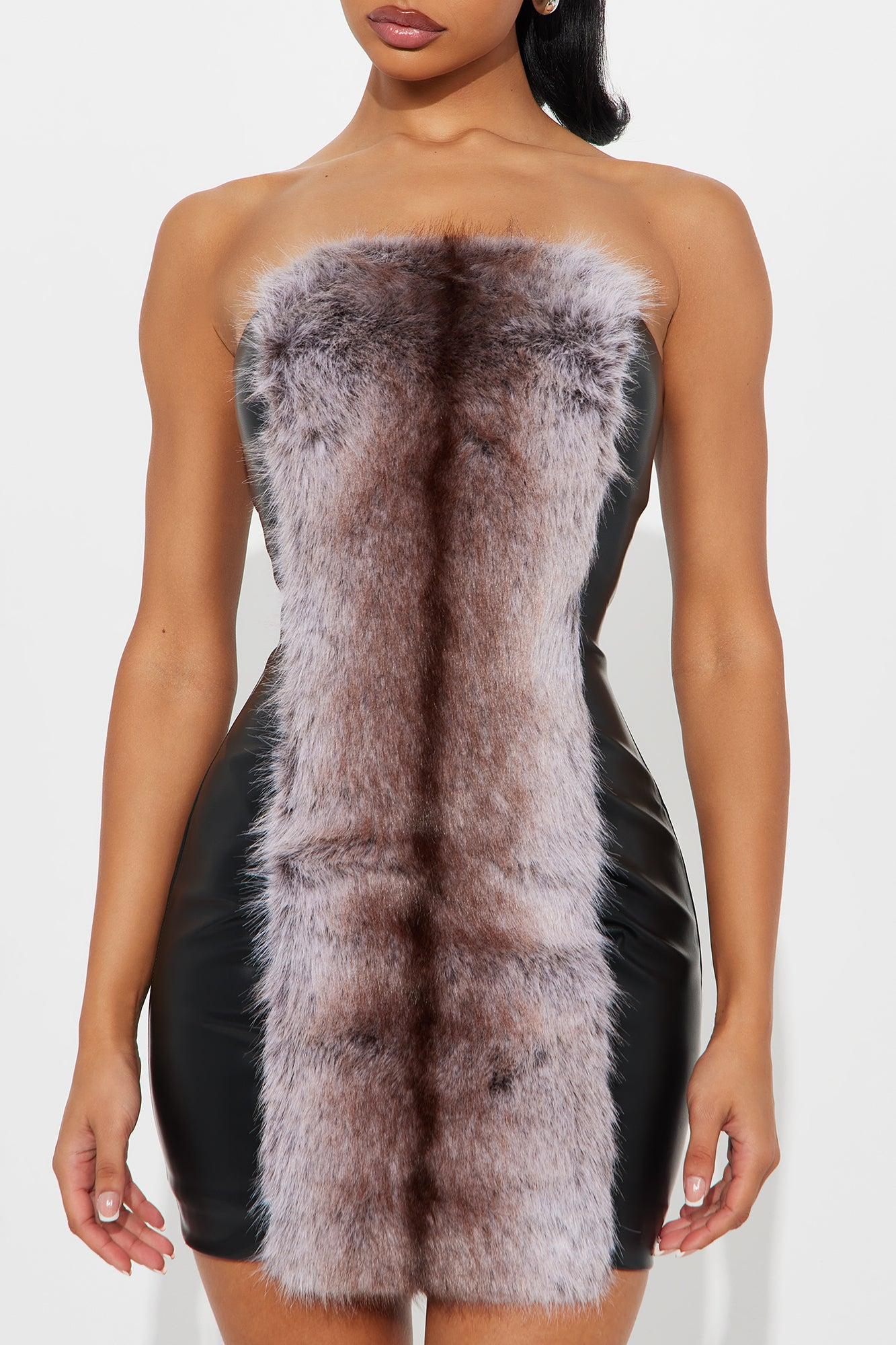 Available In Black. Faux Leather Mini Dress Straight Neckline Strapless Fur Detail Open Back Back Zipper Lined Stretch Length Measured Flat = 26" Self: 55% Polyester 45% Polyurethane Contrast: 100% Polyester Lining: 100% Polyester Imported California Proposition 65WARNING: Cancer and Reproductive Harm - www.P65Warnings.ca.gov.