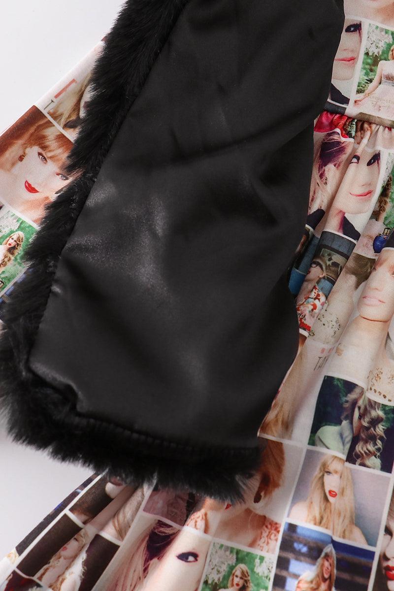 Stay cozy and stylish in this unique fur vest and fan print dress set. Perfect for music lovers, this set adds a playful touch to any outfit. Get ready to rock and roll in this quirky ensemble!