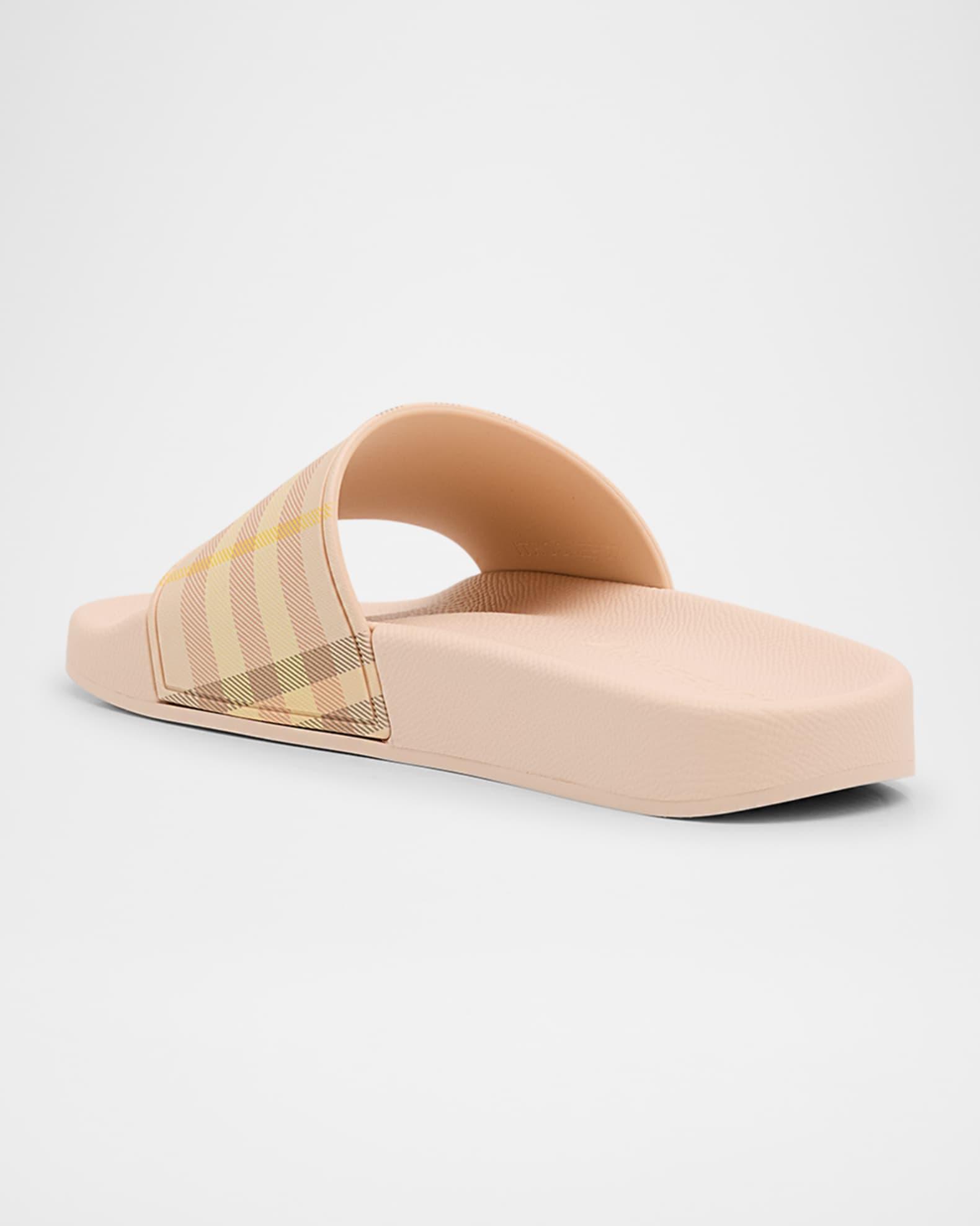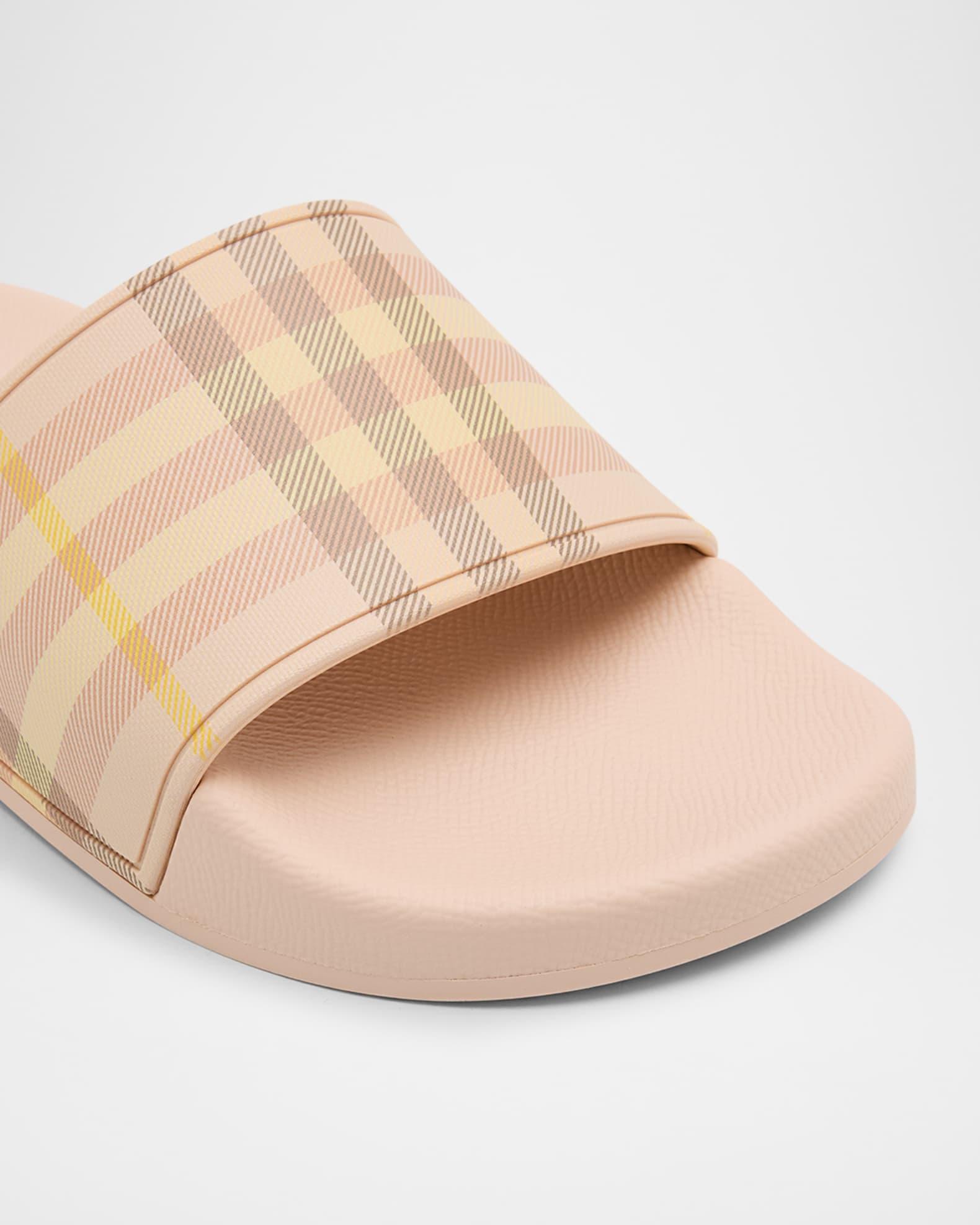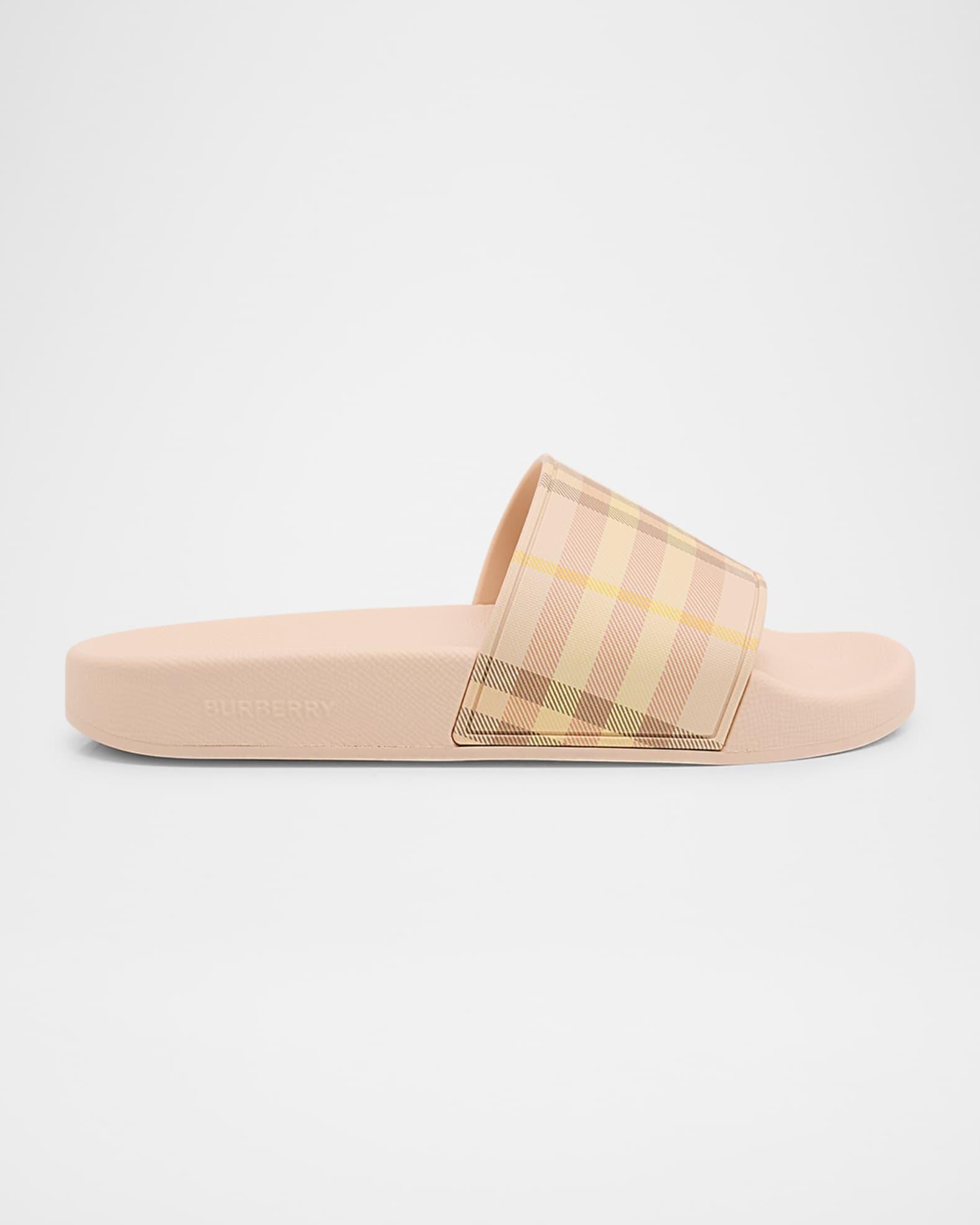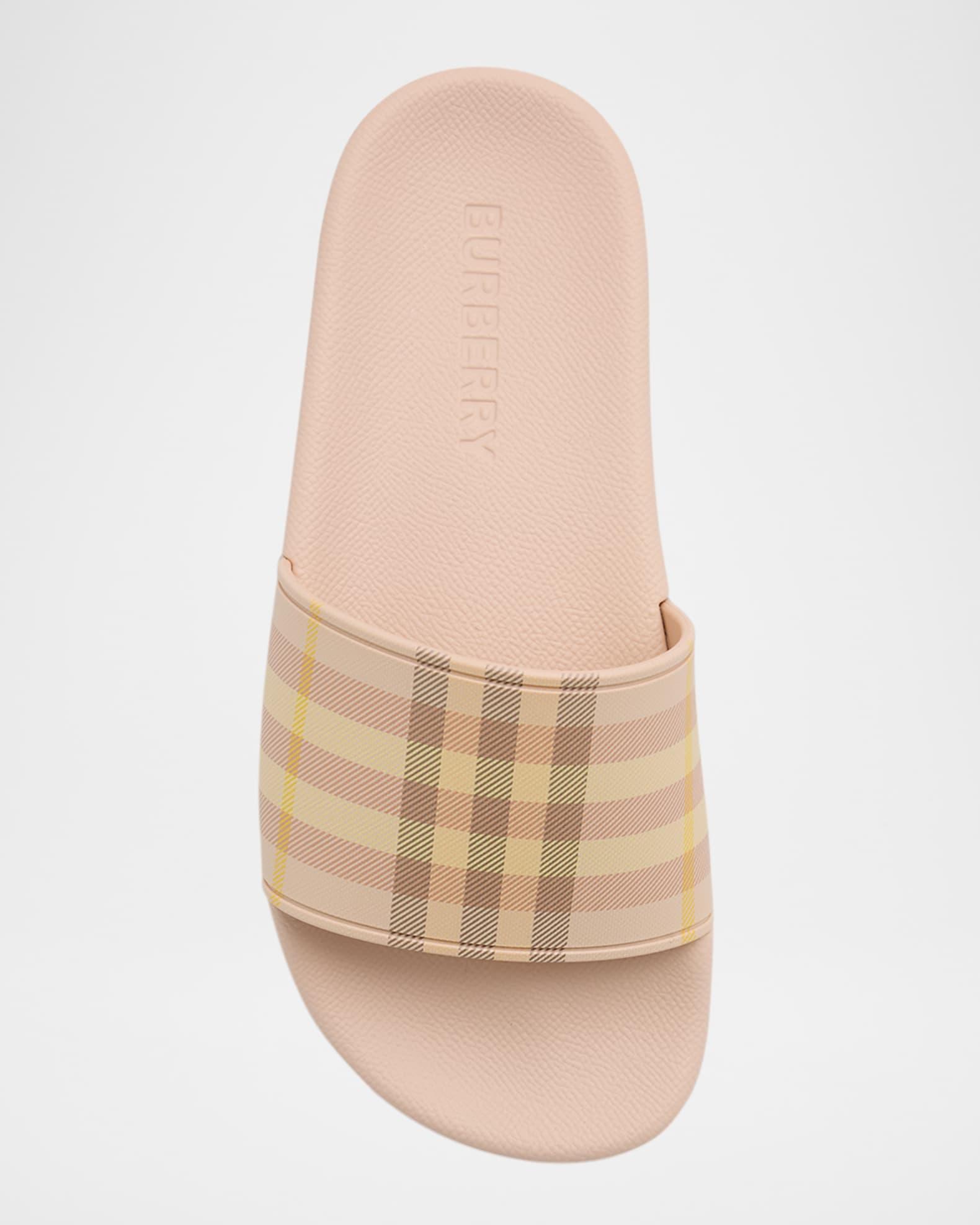 Burberry polyester, TPU, and polyurethane sandals with signature check Fit runs small; order next size up Raised Burberry lettering at side Flat heel Open toe Slide style Molded footbed Rubber outsole Made in Italy
