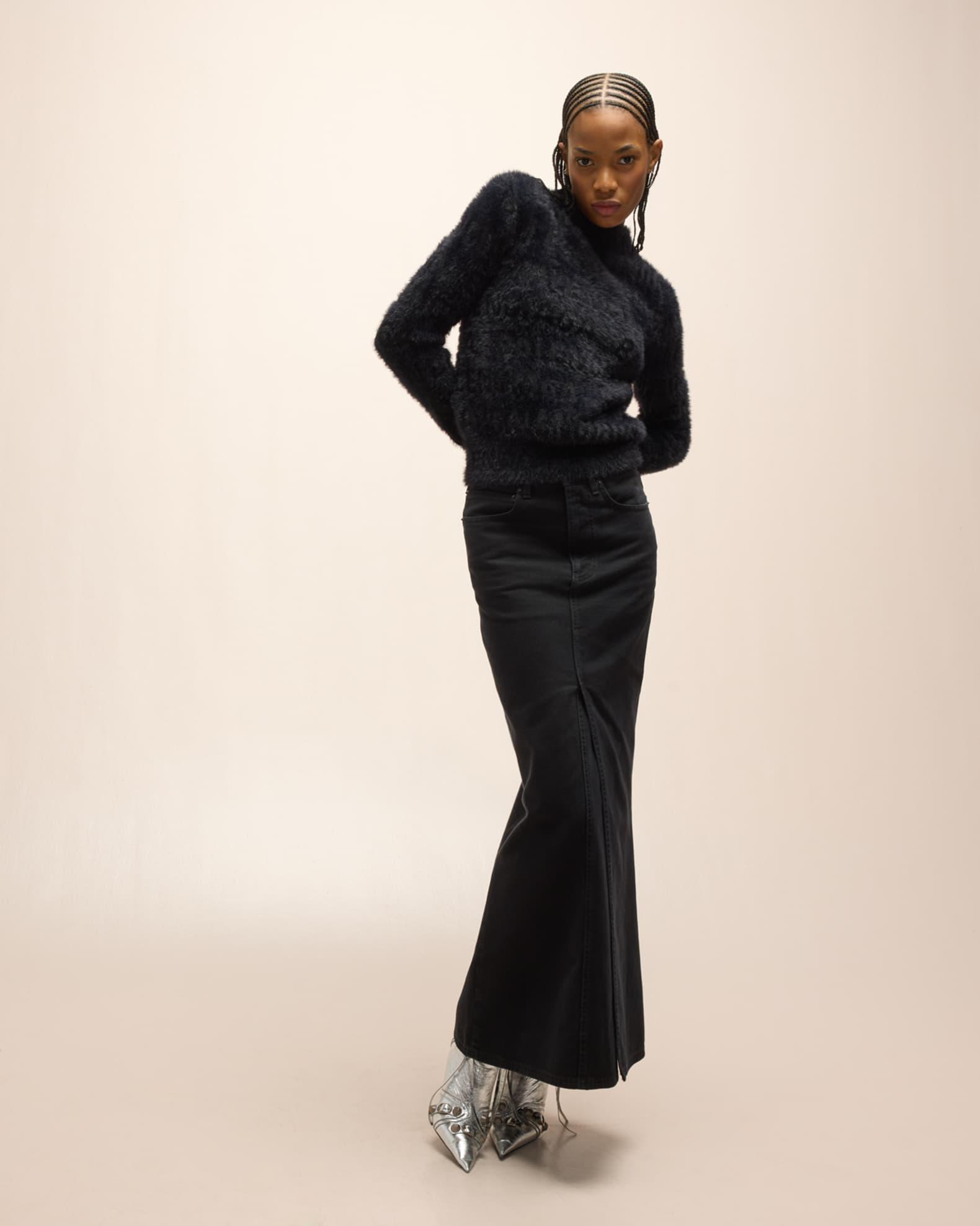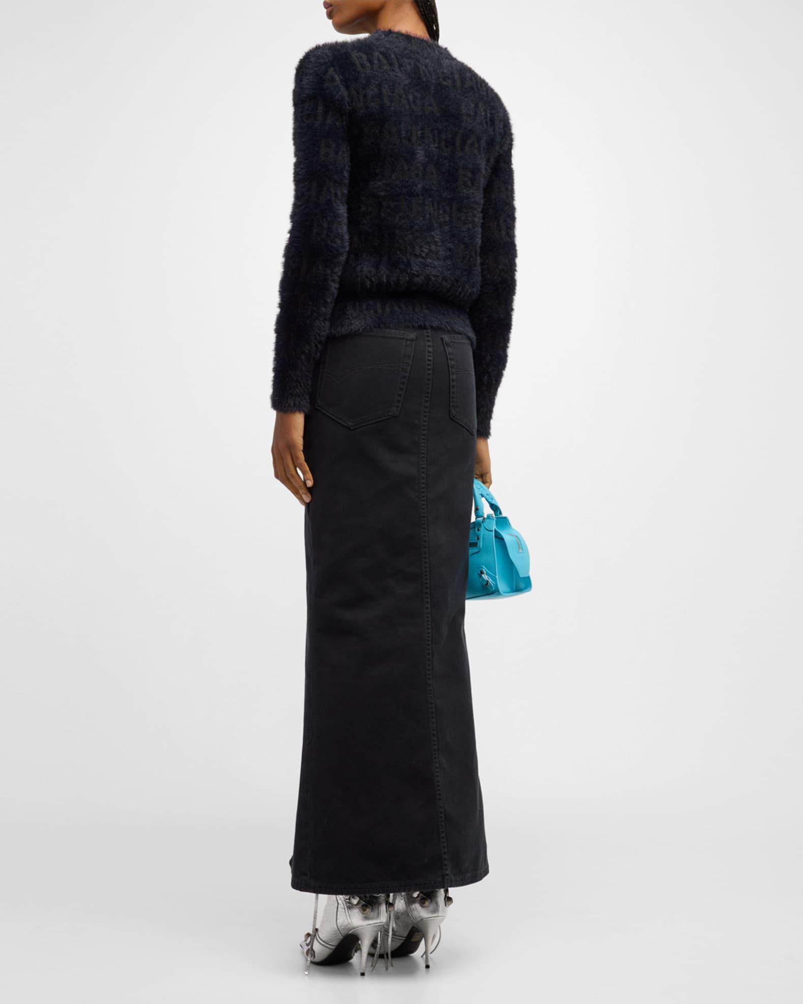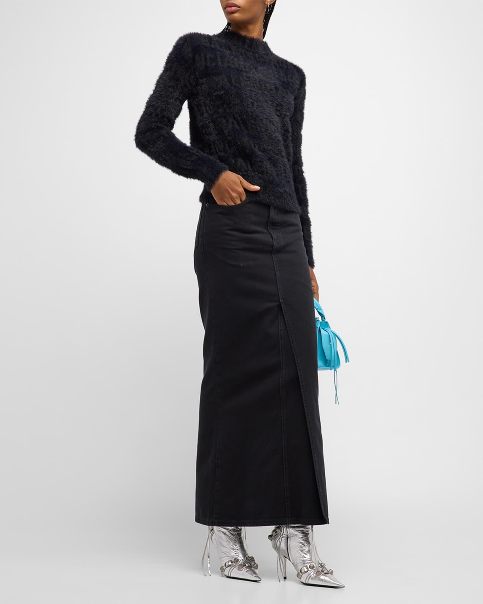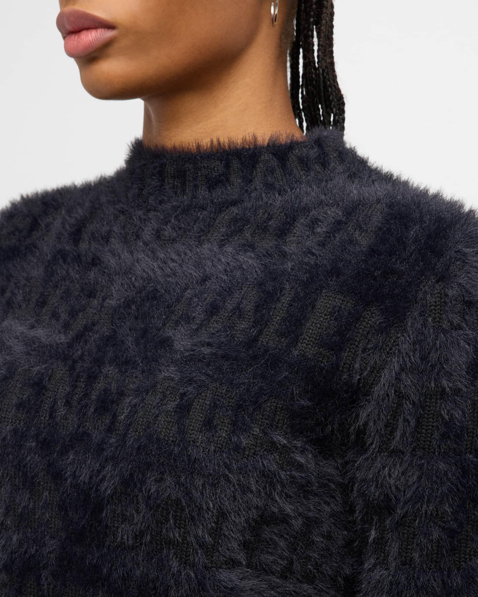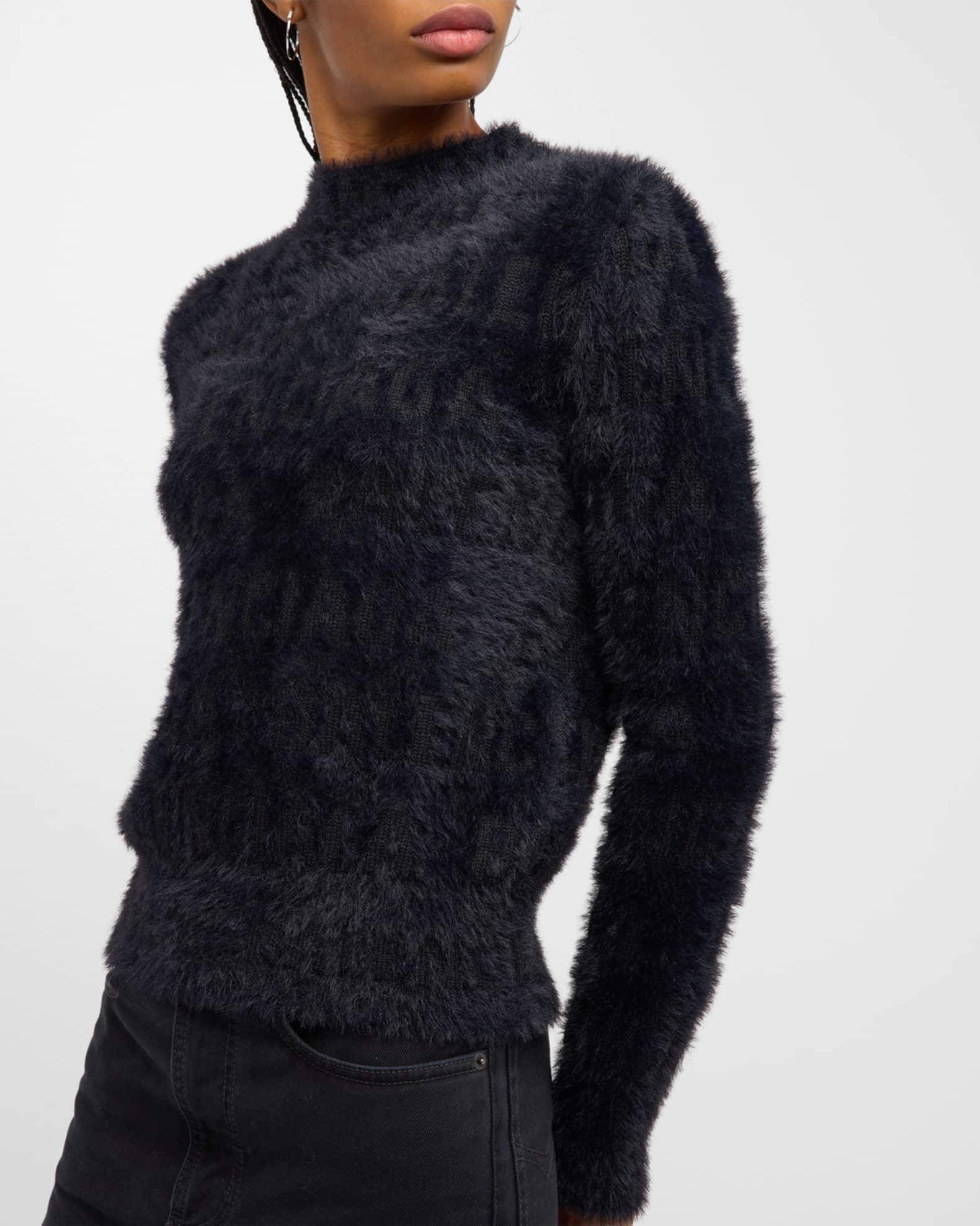 Balenciaga furry sweater with tonal logo intarsia Mock neckline Long sleeves Relaxed fit Pullover style Wool/nylon/polyamide Dry clean Made in Italy Size Note: Model height: 5'10"/178cm Model is wearing size small