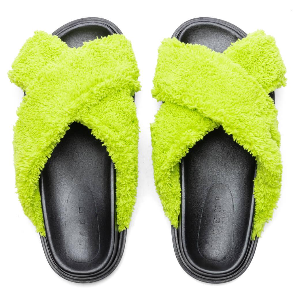 The Marni Fussbett Slide Sandal takes on an elevated aesthetic in its design. The sandal features a polyester criss-cross strap crafted from soft spongy terry cloth material. The leather insole, micro midsole, and jute outsole offer additional dimension. The embroidered Marni logo at the side ties together the Italian-crafted silhouette. Spongy terry cloth criss-cross strap Leather insole Micro midsole Jute outsole Embroidered branding Rubber outsole All sizes are listed in European Men’s sizing unless stated otherwise Style No: FBMR002501 P5441 00V07