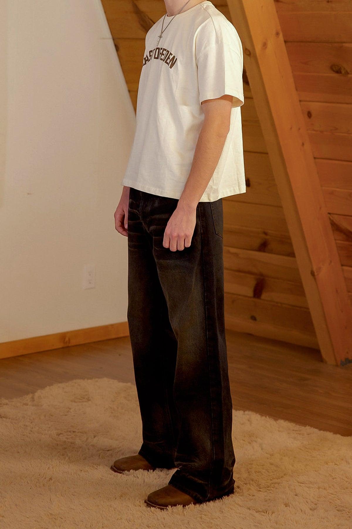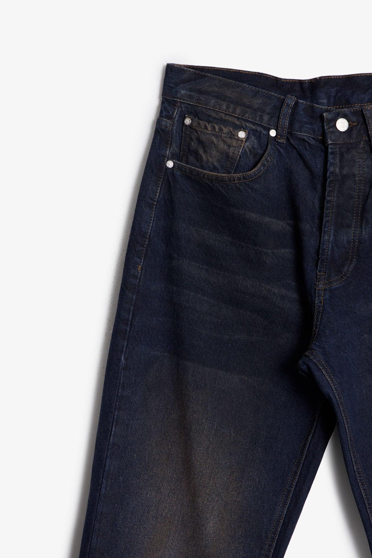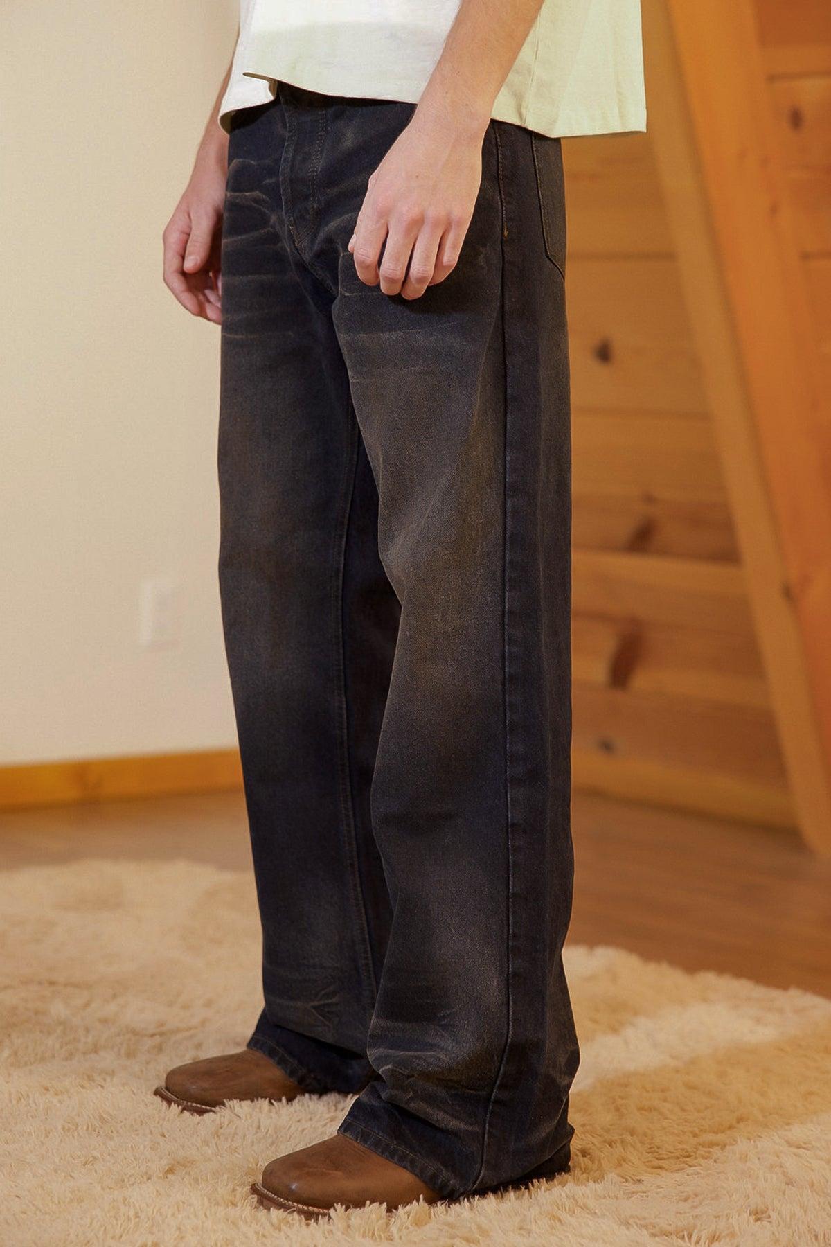 The G:04 Relaxed Flare Denim is constructed from 100% cotton denim in a bootcut silhouette with a wide flare. It features a dark wash finish with a vintage brown tint, light sanding and whiskering along the front, and subtle distressing at the hem. Designed with a relaxed fit through the thigh and standard five-pocket