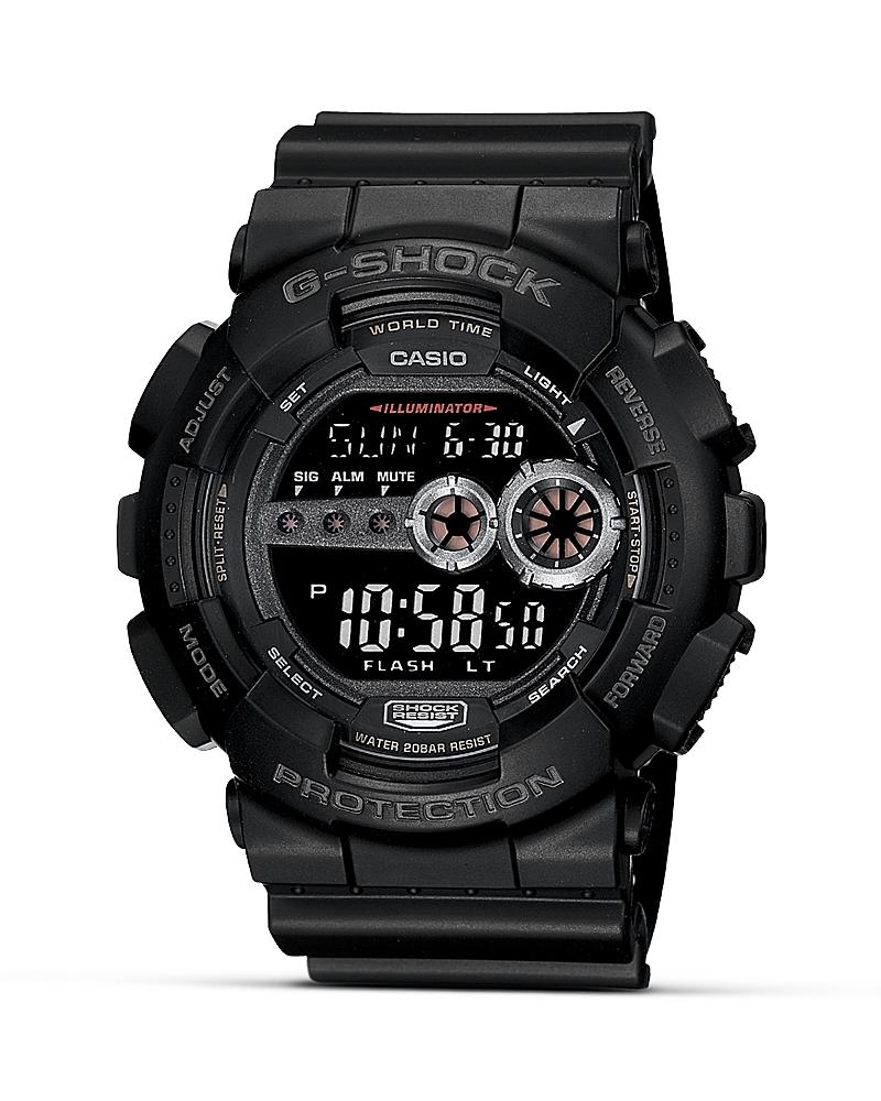 From G-Shock, the Black XL Resin Digital Watch features: black resin with blue accents and black gloss bandround caseshock and magnetic resistantauto LED light with afterglowfour daily alarmsone snooze alarmhourly time signalworld time for 29 time zones and 48 cities1/1000-second stopwatchfull auto-calendarcountdown calendarcase size approx. 51.2mm Water Resistance: 20 ATMImported.