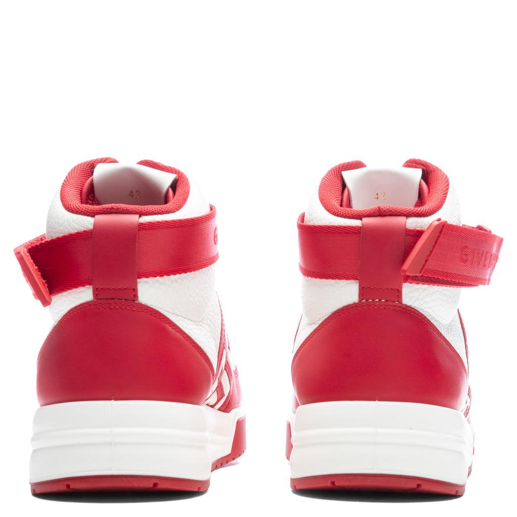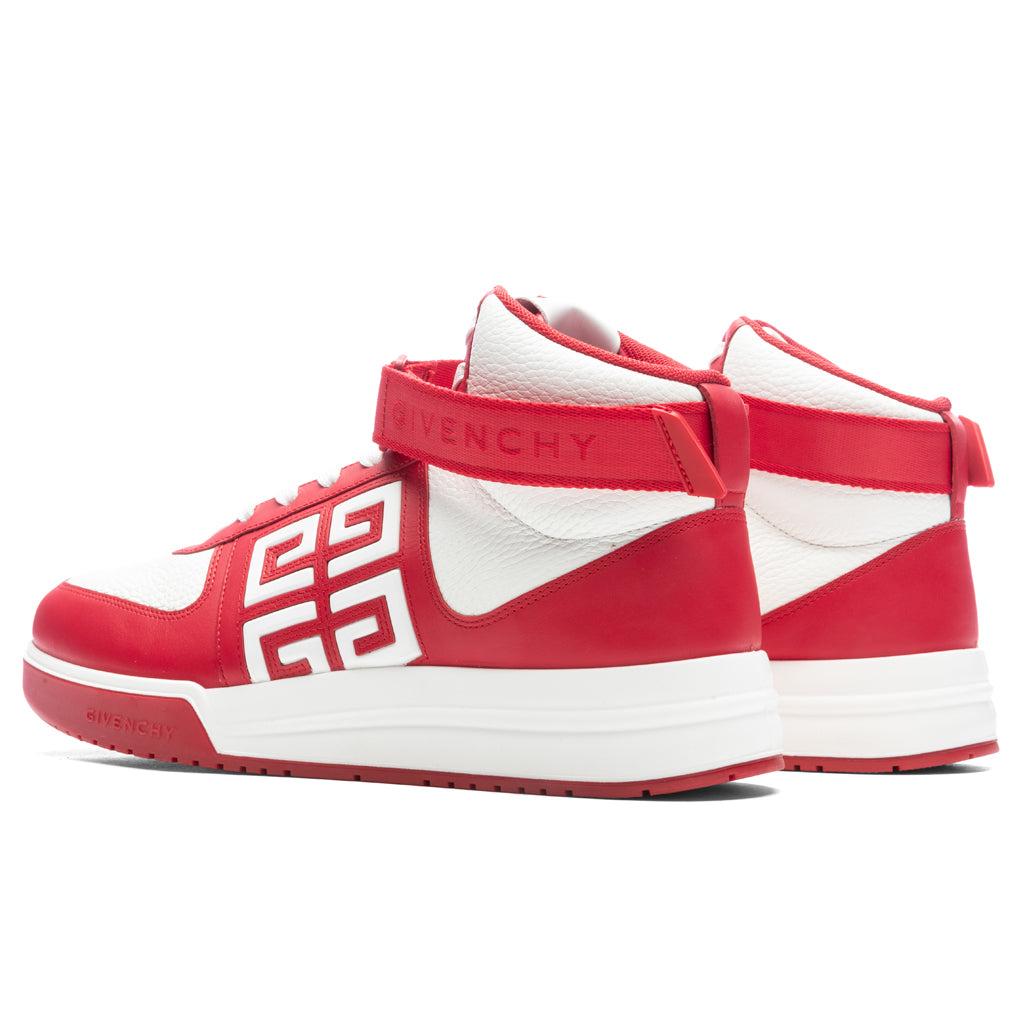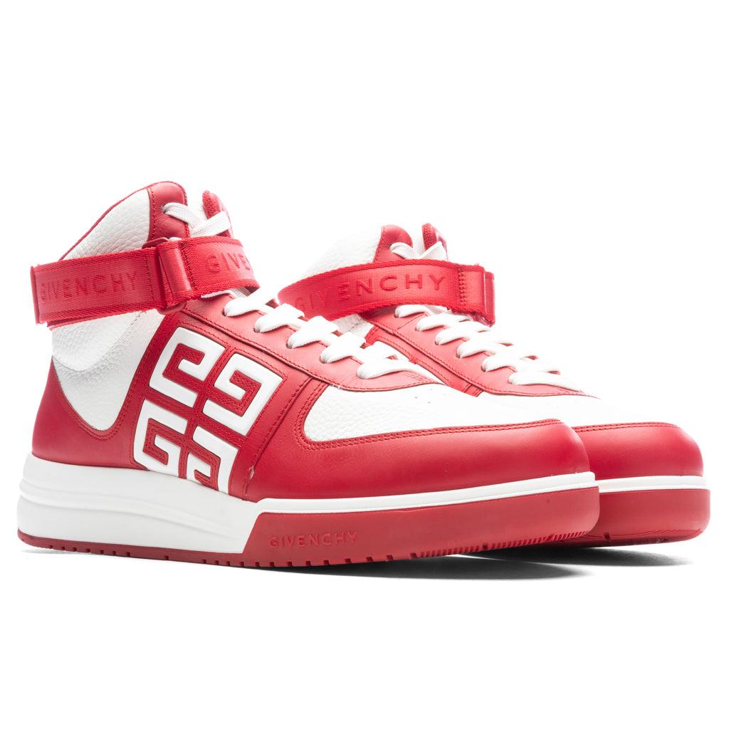 Givenchy’s G4 High-Top Sneakers make a statement in their smooth calfskin and leather upper. The sneaker features a removable webbing strap around the ankle. The embossed emblem at the side paired with a calfskin leather insole adds further comfort. The rubber outsole underneath completes the rest of the design. Calfskin/tumbled leather upper Webbing strap Embossed branding Calfskin leather insole Rubber outsole All sizes are listed in European Men’s sizing unless stated otherwise Style No: BH008UH1GM616