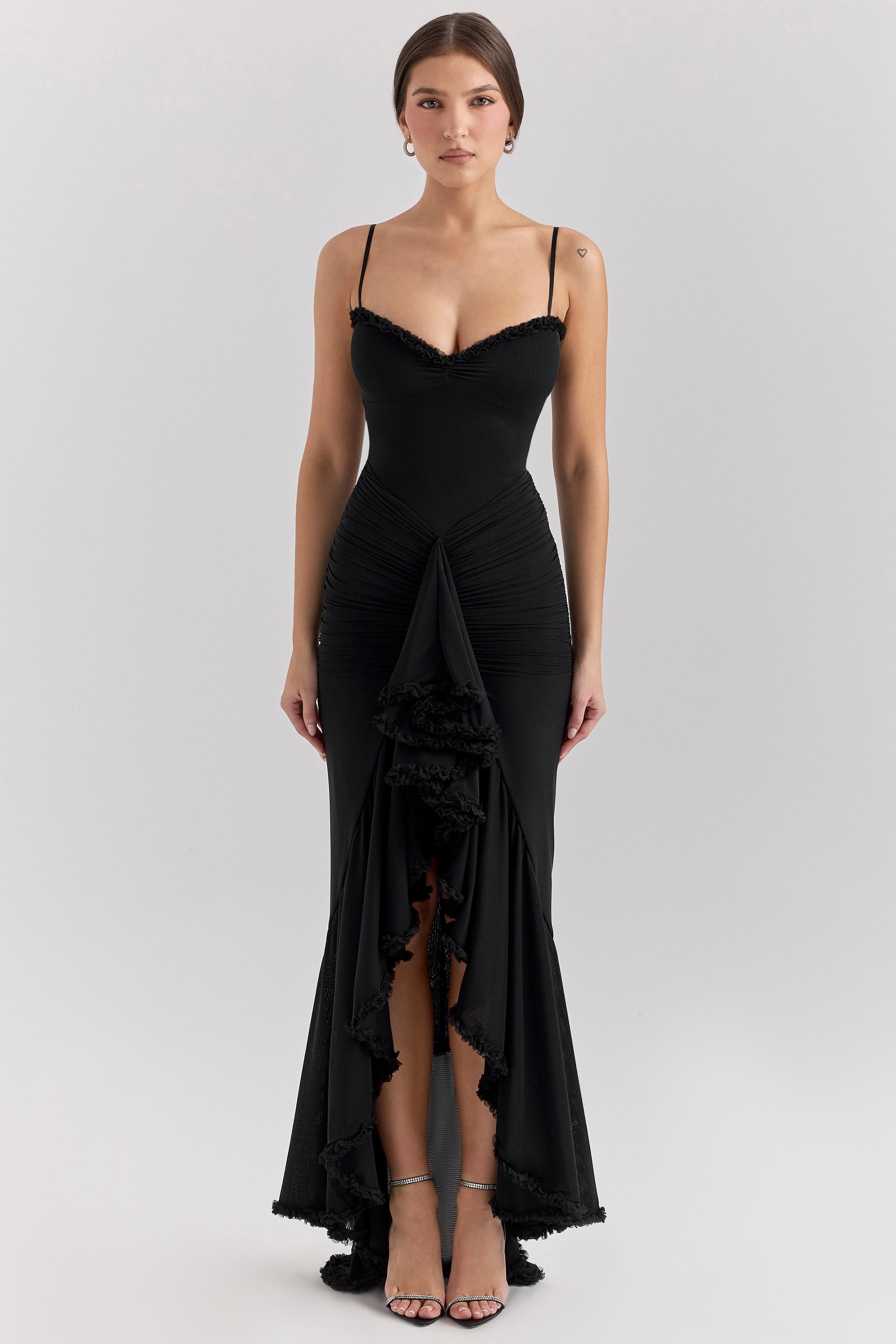 The ruffle-front drama of 'Gabbi' steals the show, but there’s so much more to this gown. Crafted from gathered stretch mesh in classic black, it’s secretly your best-kept secret for a sculpted silhouette, thanks to the power mesh lining that acts like built-in shapewear, hugging and smoothing in all the right places.