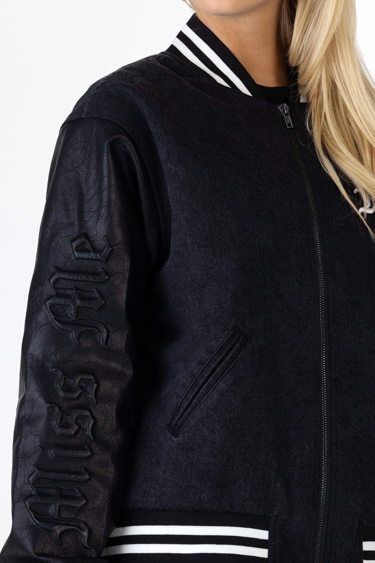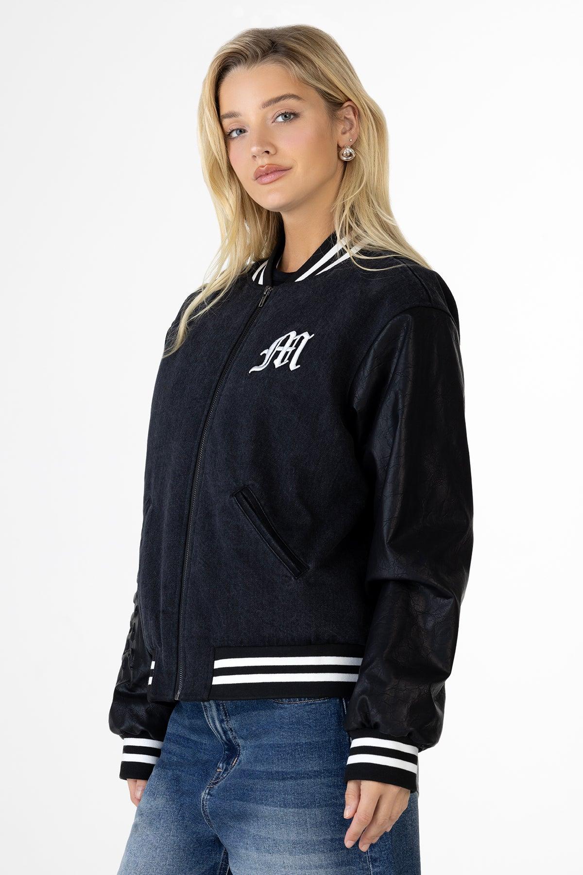 Varsity bomber jacket- Contrasting faux leather sleeves- Embossed gothic Miss Me sleeve detailing- Embroidered chenille patch Miss Me branding- Striped ribbed neckline, cuffs, and hem detailing- Zipper designModel is wearing size: SModel Measurements:Height: 5'7"Bust: 32BCWaist: 24"Hips: 34"Fabric Content: -Self 85% Cotton, 10% Polyester, 5% Viscose; Cont. 1: 50% Polyurethane, 50% Polyester; Cont. 2: 95% Polyester, 5% SpandexCare: Gentle machine wash inside-out with like colors in cold water. Tumble dry low.Style No. MJ0755L-BLACK