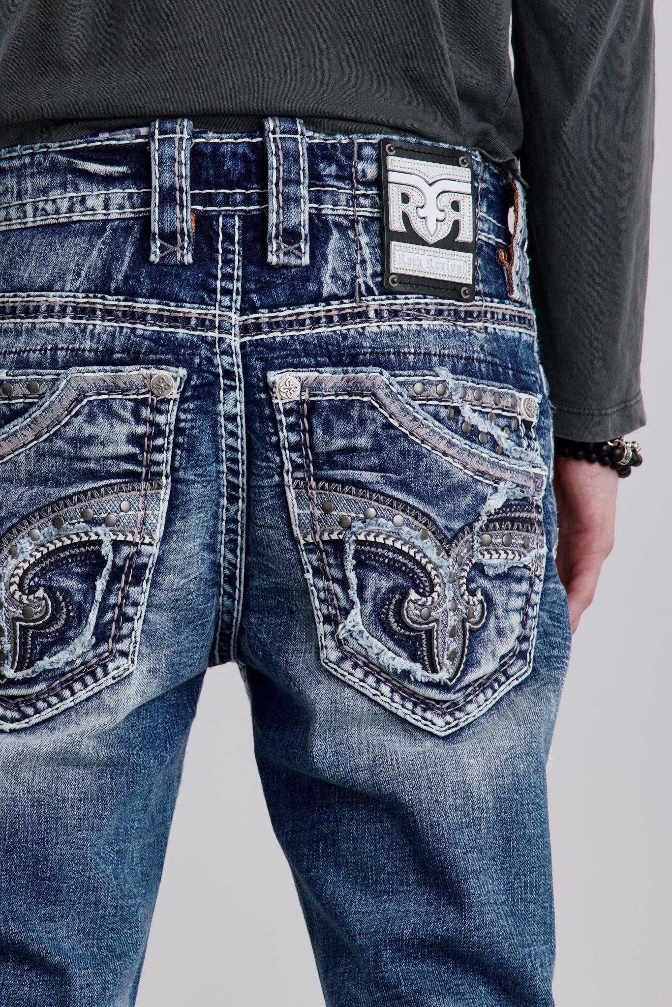 Silver white brushed rivets and buttons throughout. 7-pocket design with iconic Fleur de Lis and studded back pockets. Black studs, denim patchwork on front legs, and black and white leather patch on belt loop. Designed with care and creativity in Los Angeles, California.