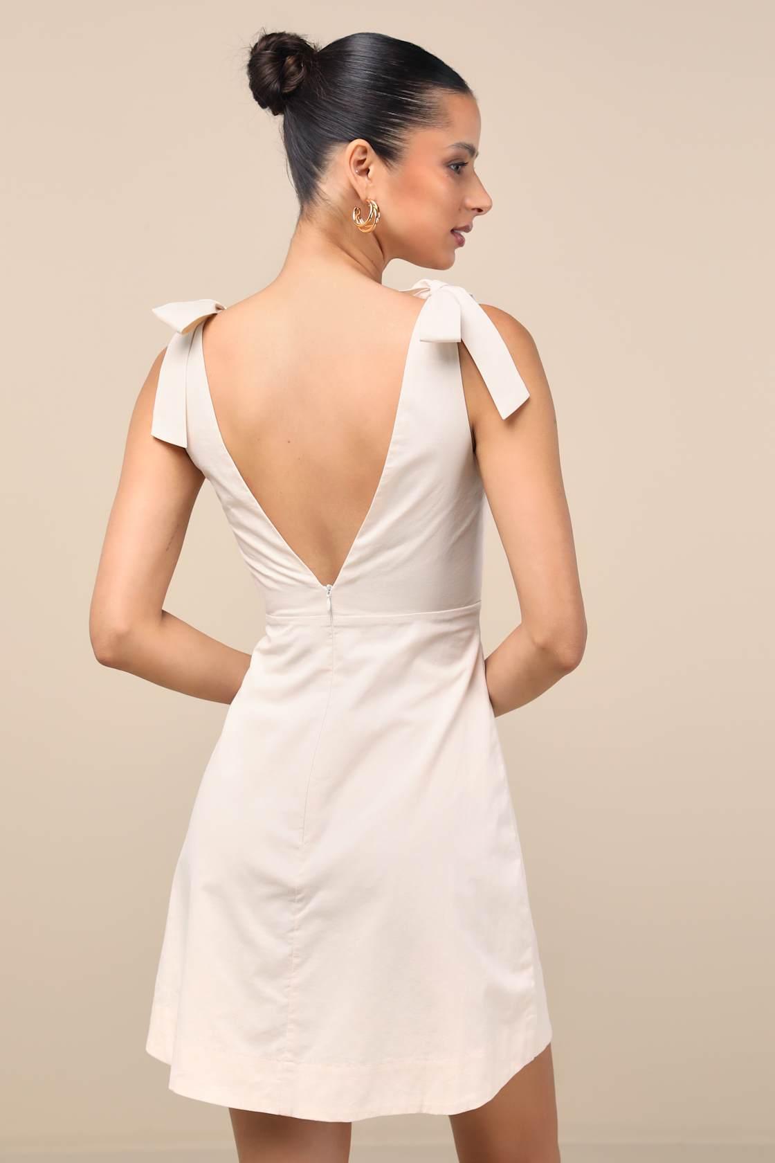 This lil' lightweight cotton mini dress encapsulates maximum chicness with minimal effort, making it a go-to look for the girlies with a busy schedule. Wide straps tie at the shoulders, supporting a figure-skimming silhouette with a plunging V-neck (and back), a flattering empire waist, and a cute A-line skirt. Hidden back zipper/clasp.