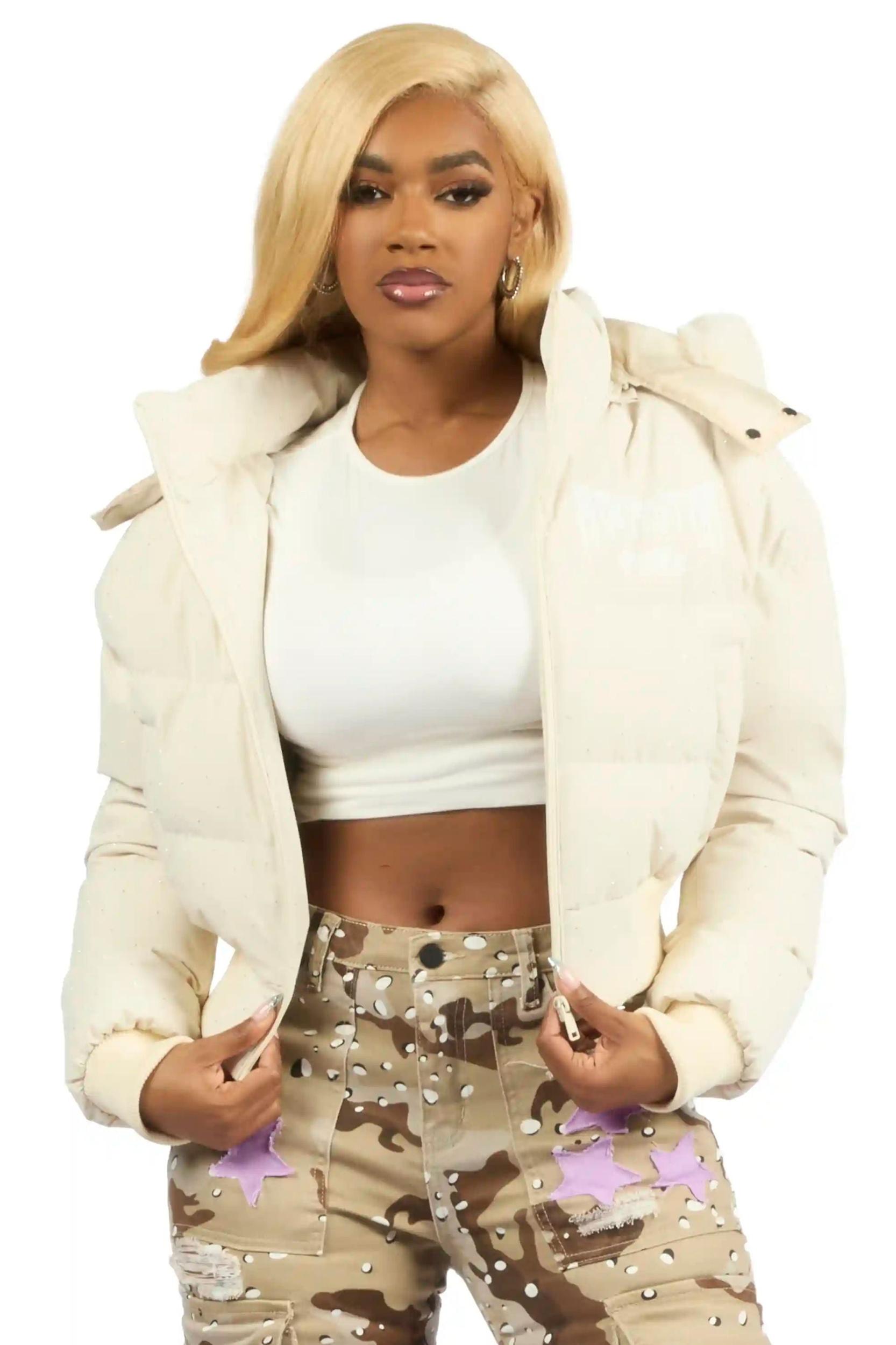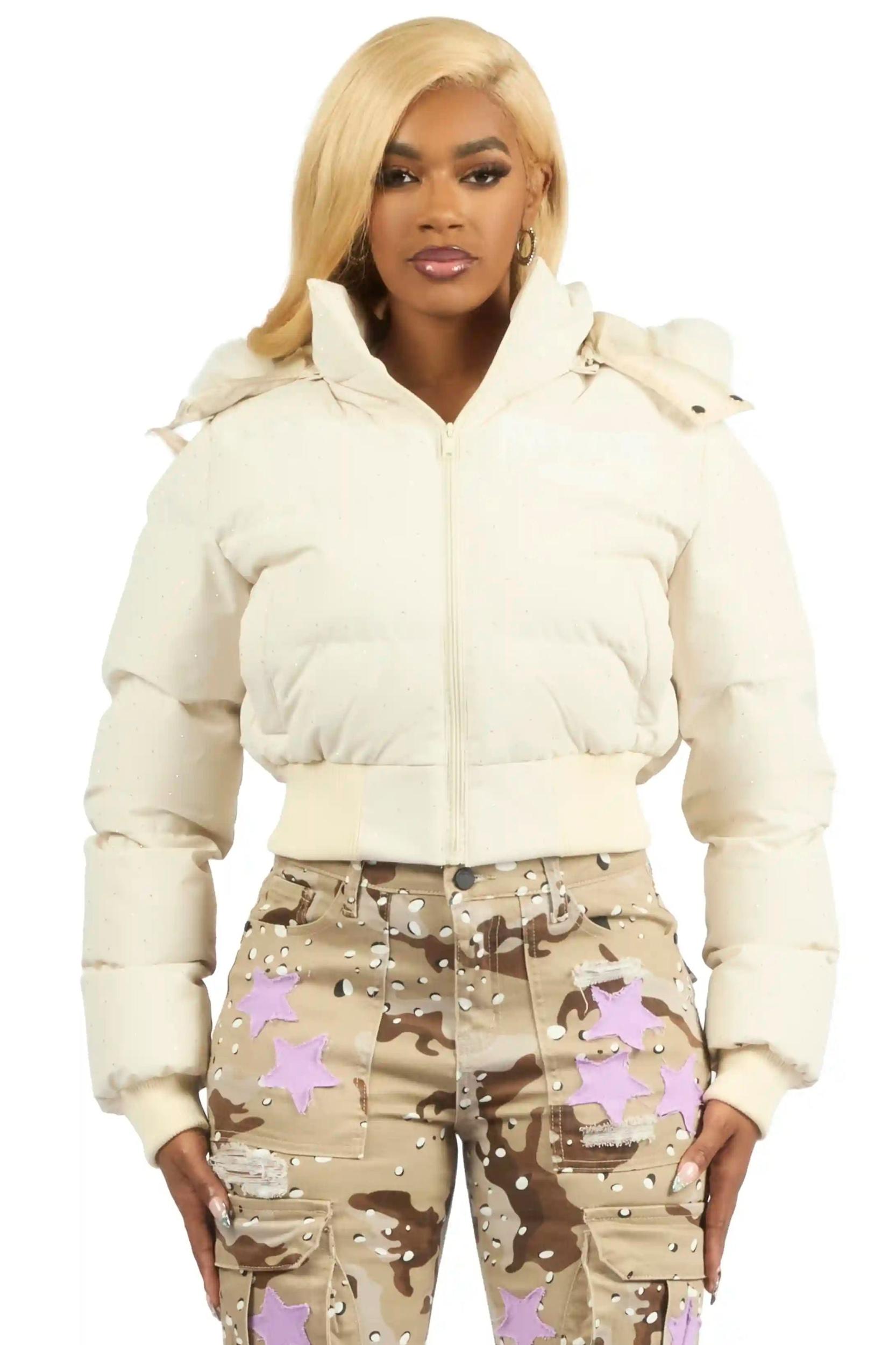 An urban quilted puffer jacket for women in beige. Designed with water-resistant fabric and insulation for a versatile streetwear style. Removable button faux fur hood Full front zip closure Long sleeves Ribbed knit cuffs Dual slant pockets Cropped length Embroidered RSO logos Rhinestone detailing