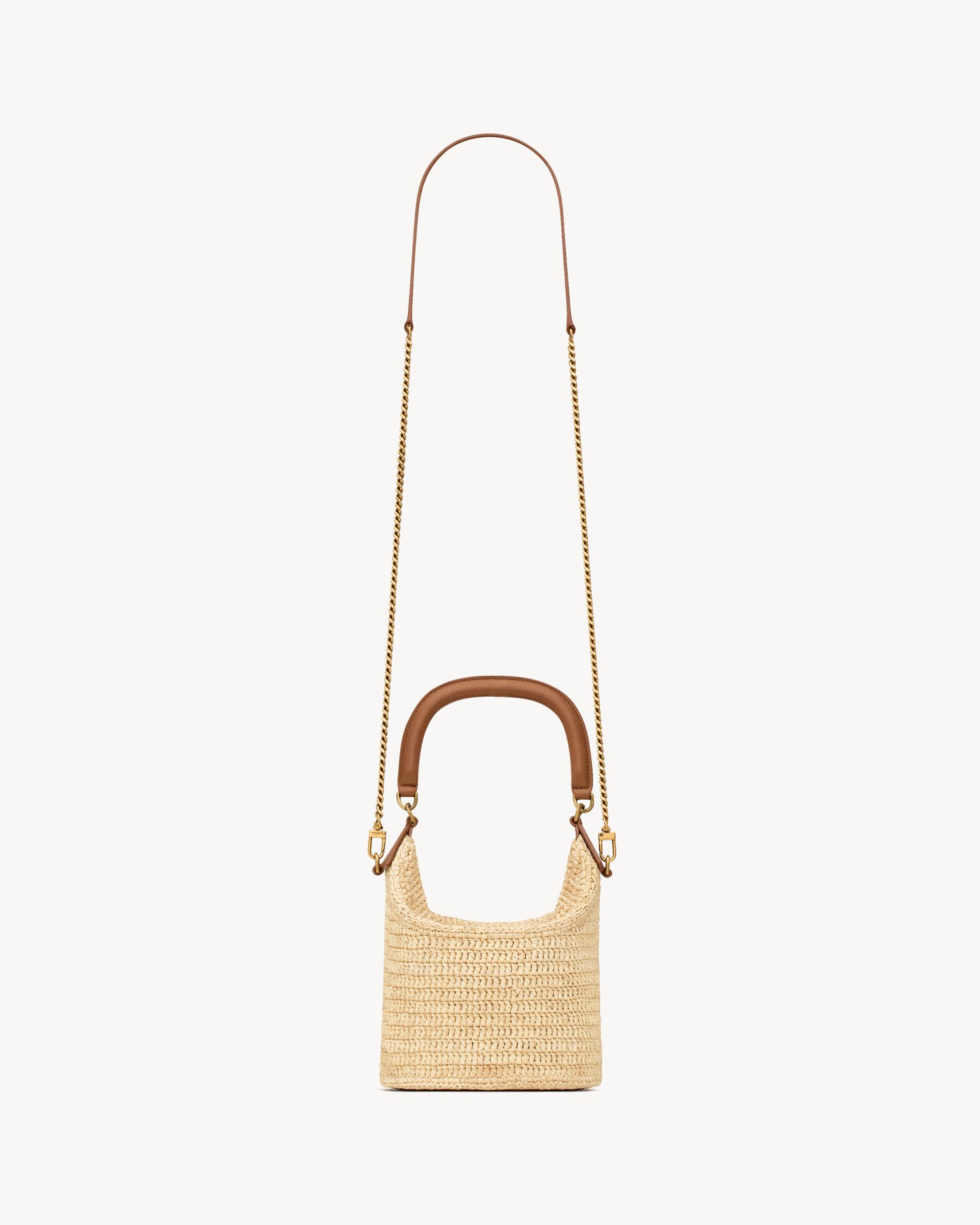 bucket bag in woven raffia with a semi-rigid construction, decorated with the CASSANDRE. The bag is secured with a magnetic double-flap closure. Featuring a top handle in vegetable-tanned leather and a detachable leather-and-chain strap for multiple carry options.