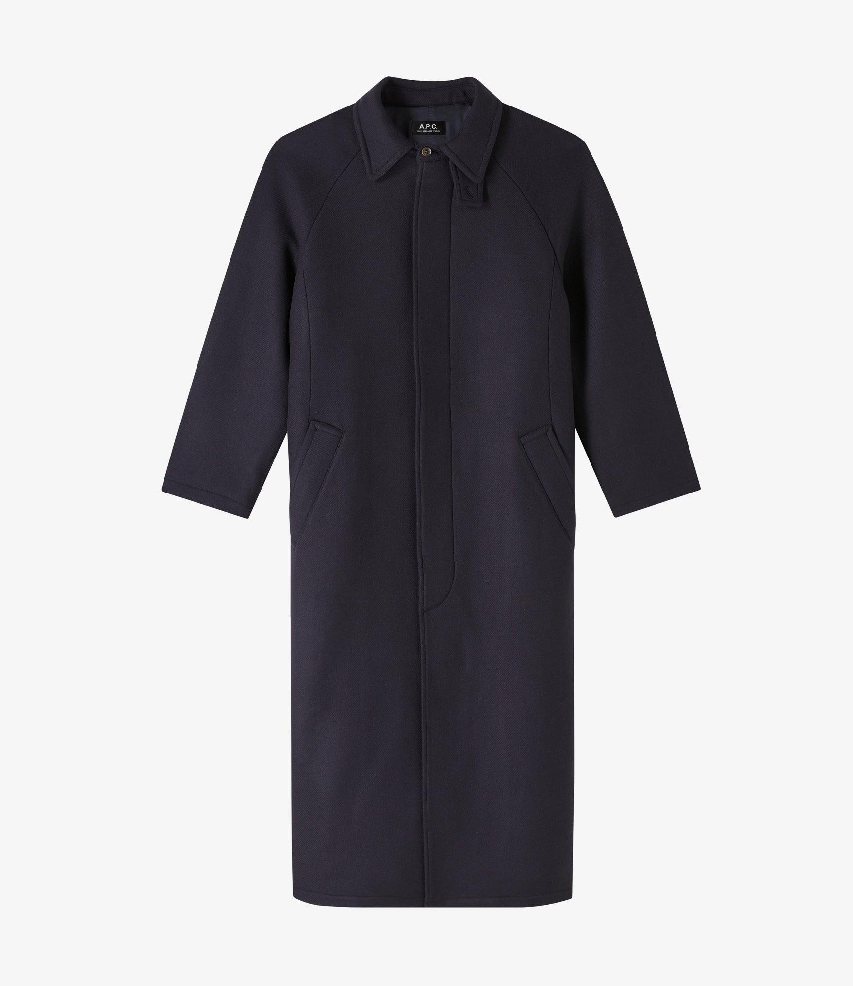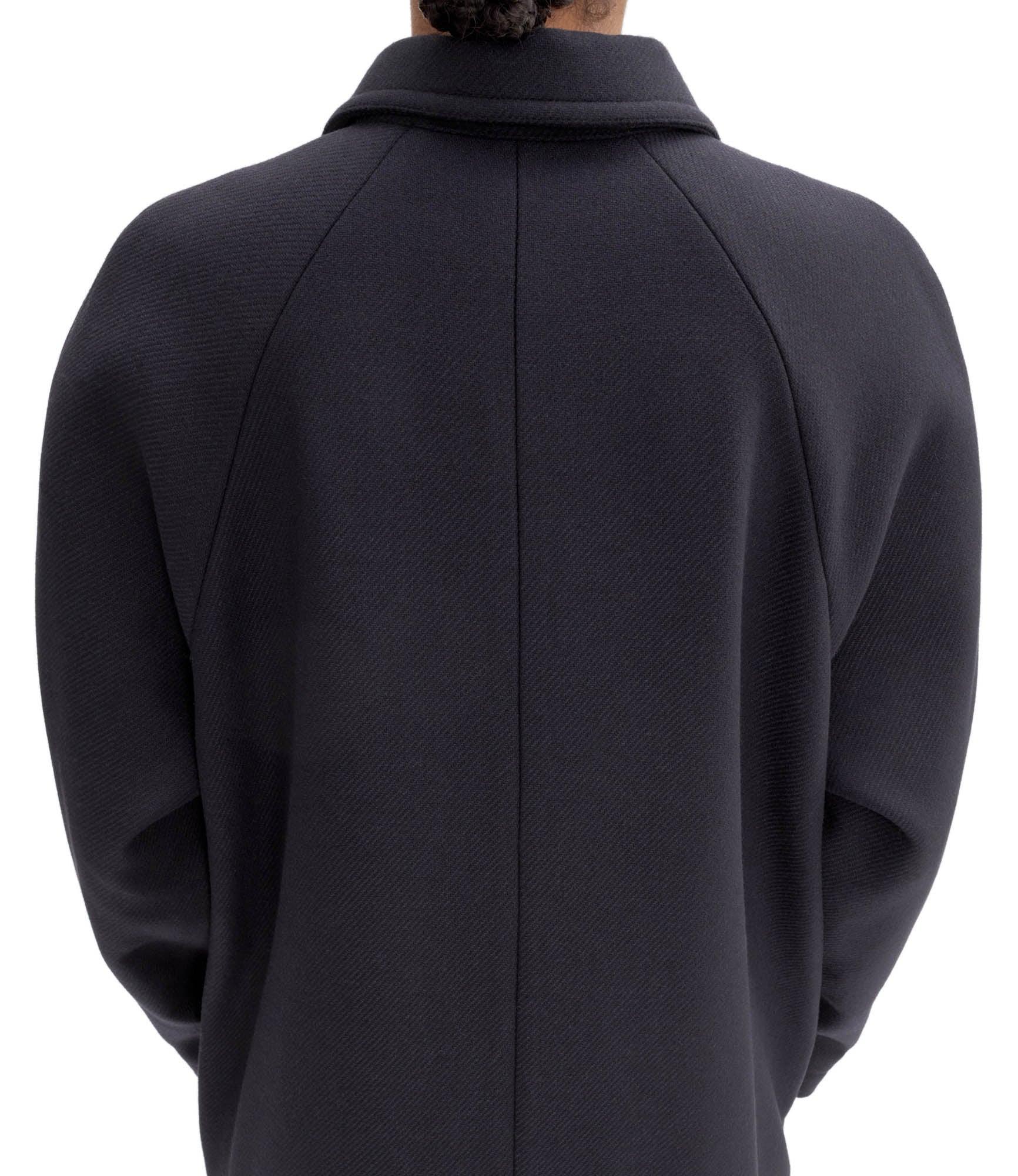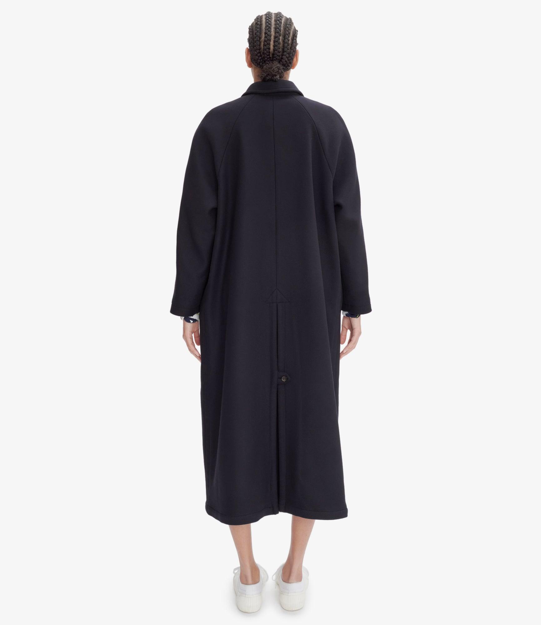 - Dense, warm material. - Loose fit. - Mid-calf length. - Sloping raglan shoulders. - Two side pockets. - Back vent. - Viscose lining. - Faux horn buttons.