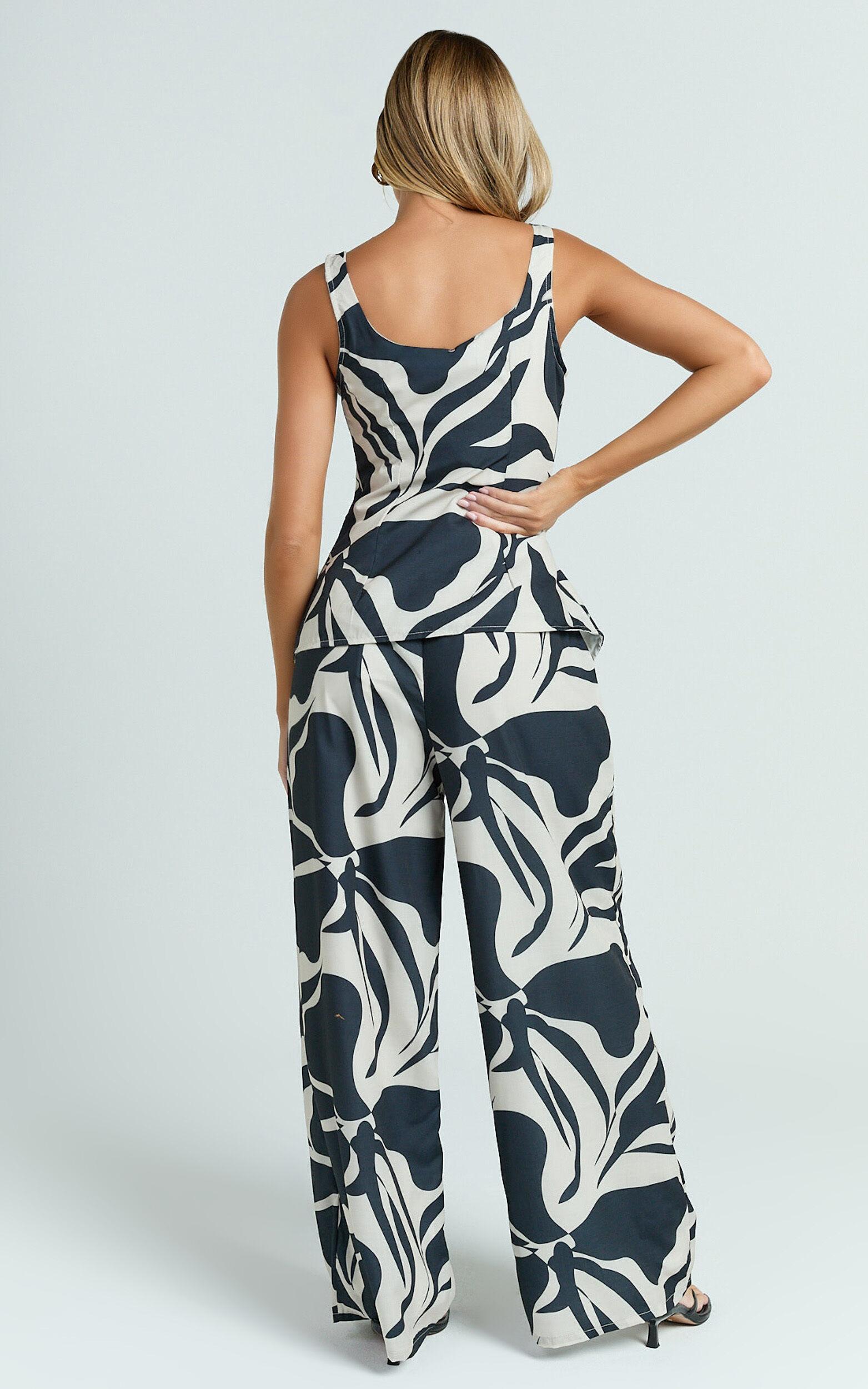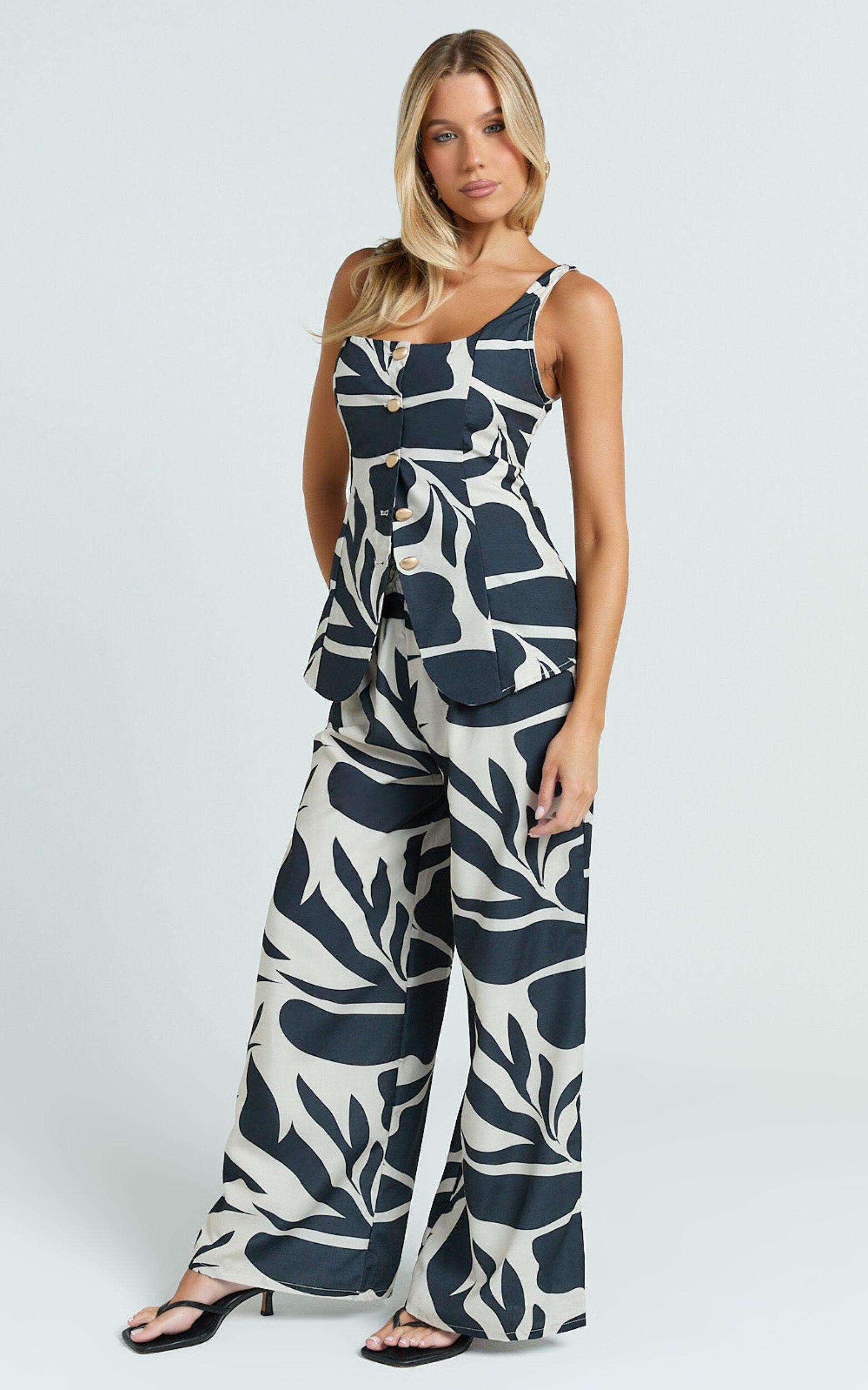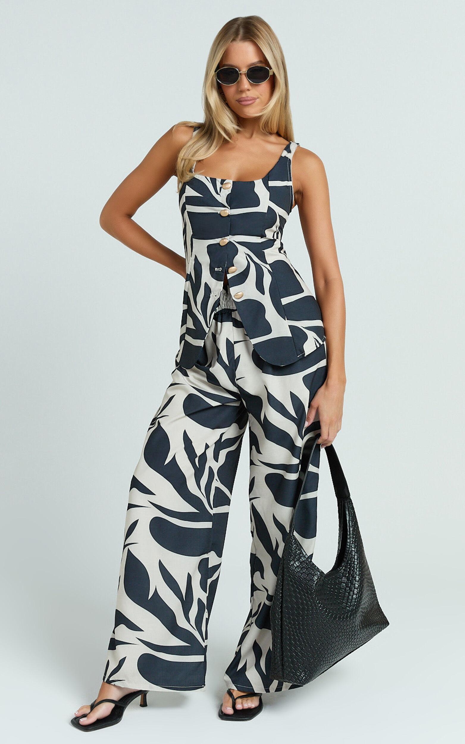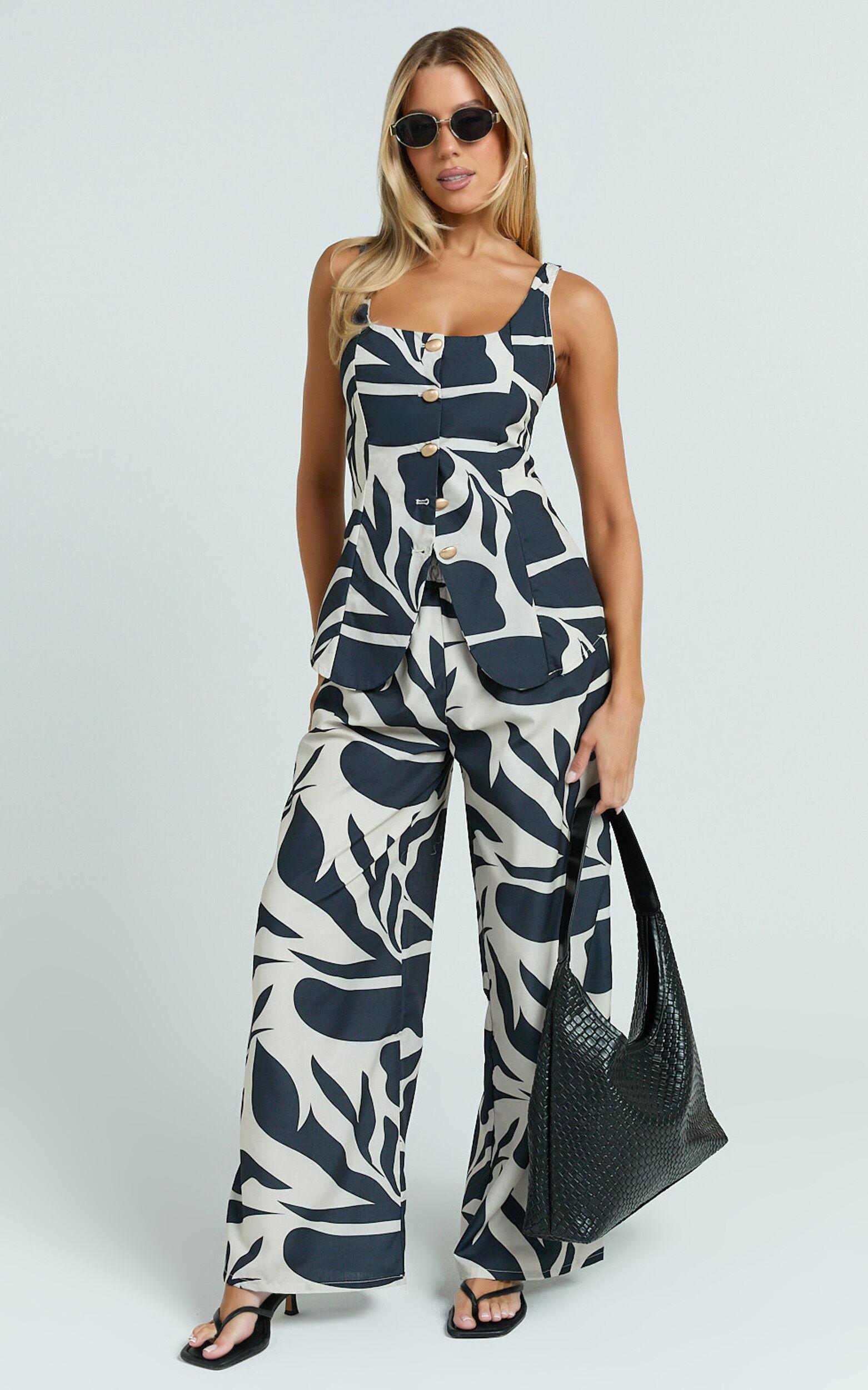 This standout combo features a bold abstract mono print, pairing an on-trend button-down vest effortlessly with wide-leg co-ord pants. With its vintage-inspired silhouette, this set strikes the ideal balance between polished chic and streetwear cool, perfect for turning heads from brunch dates to cocktail hour.Wear this statement set with chunky platform sandals for laid-back daytime hangs, or dress it up with sleek kitten heels and gold jewelry for evenings out. Whether worn together or styled separately with your favorite pieces, the Gail Two Piece Set brings iconic confidence to any occasion.Product Details:Cotton Polyester blendScoop necklineSleeveless designFull length trousersIdeal for partiesMaterial and Care100% PolyesterLow / No stretch