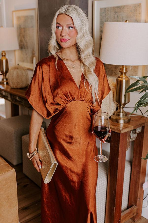 - Go full glam with this gorgeous maxi! Its flattering fit, and sleek material make it perfect for a stunning look. Get ready to turn heads in this fabulous piece! - Unlined material with a satin finish - A v-cut neckline with two hidden hook and eyes for additional coverage - Short, draped sleeves - Gathered detailing - Side zip closure under one arm - A flattering silhouette that ends in a straight, maxi length hemline with a side slit accent
