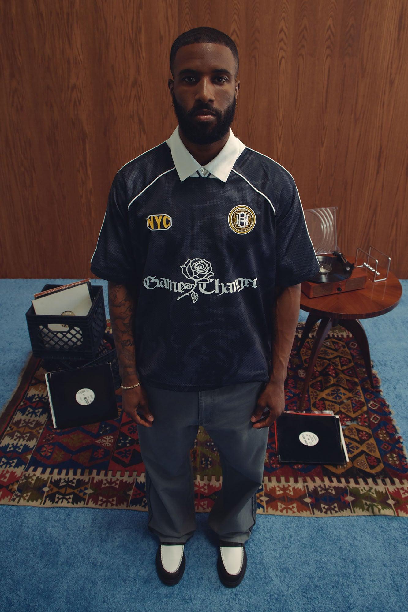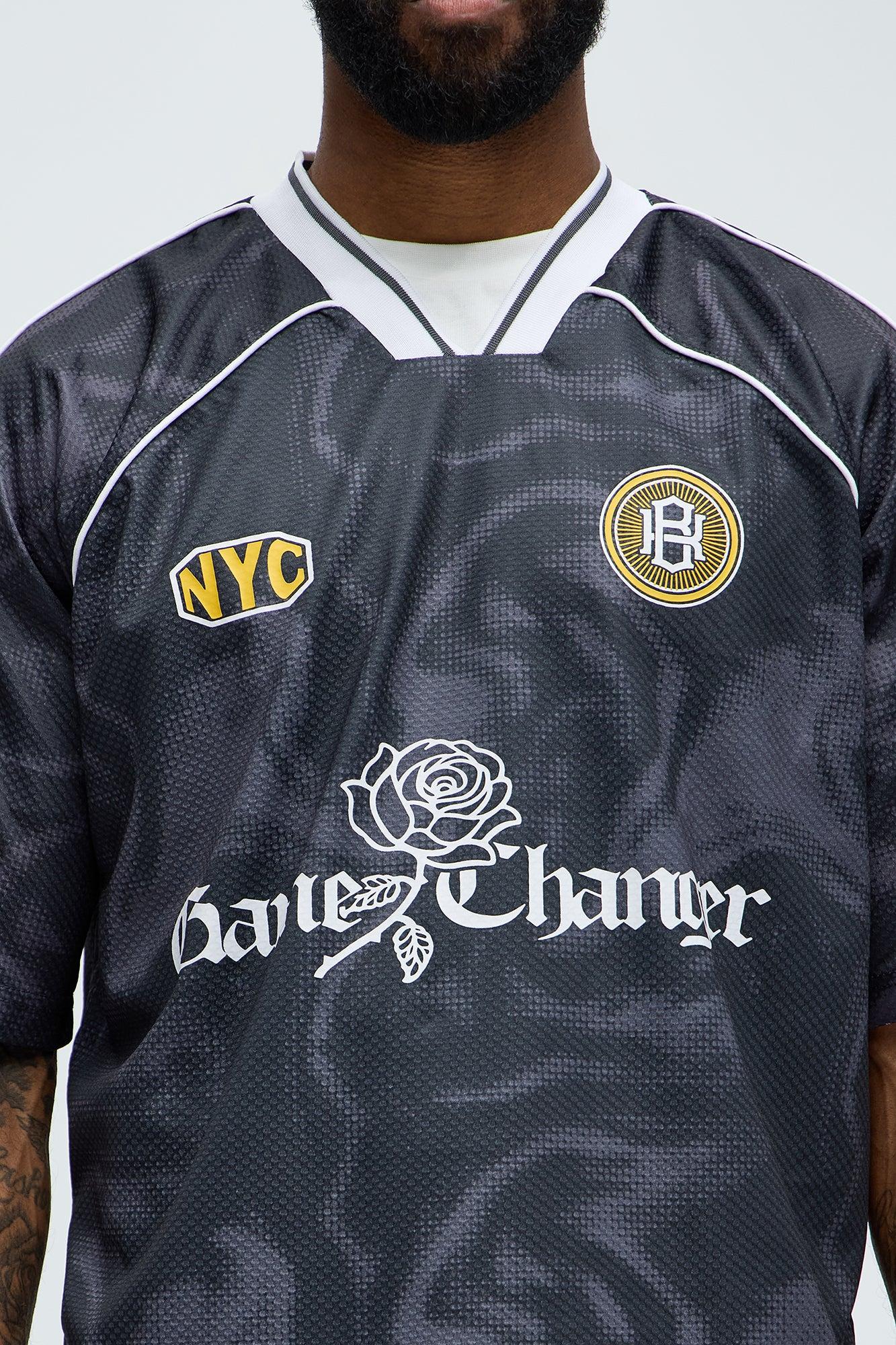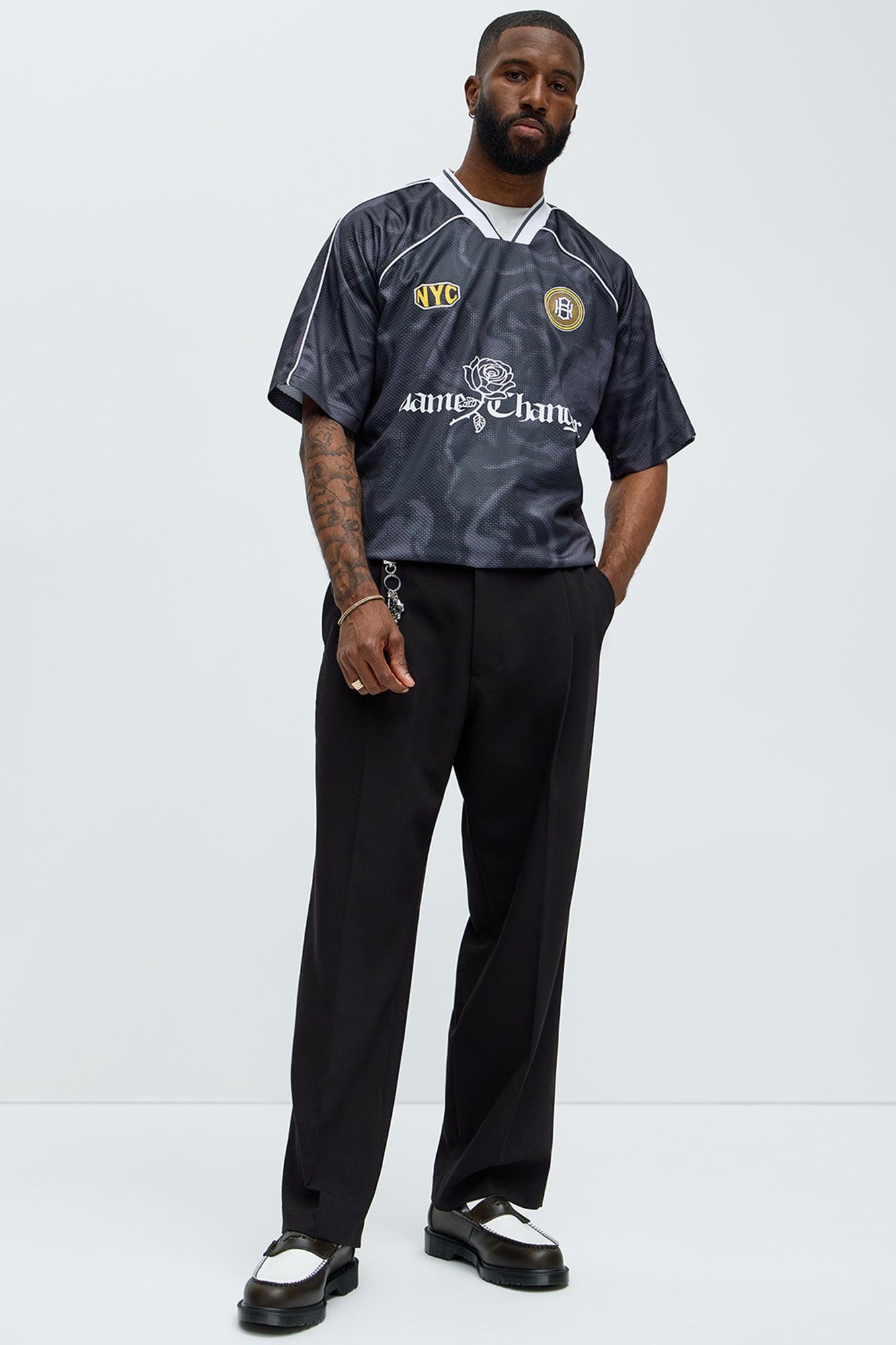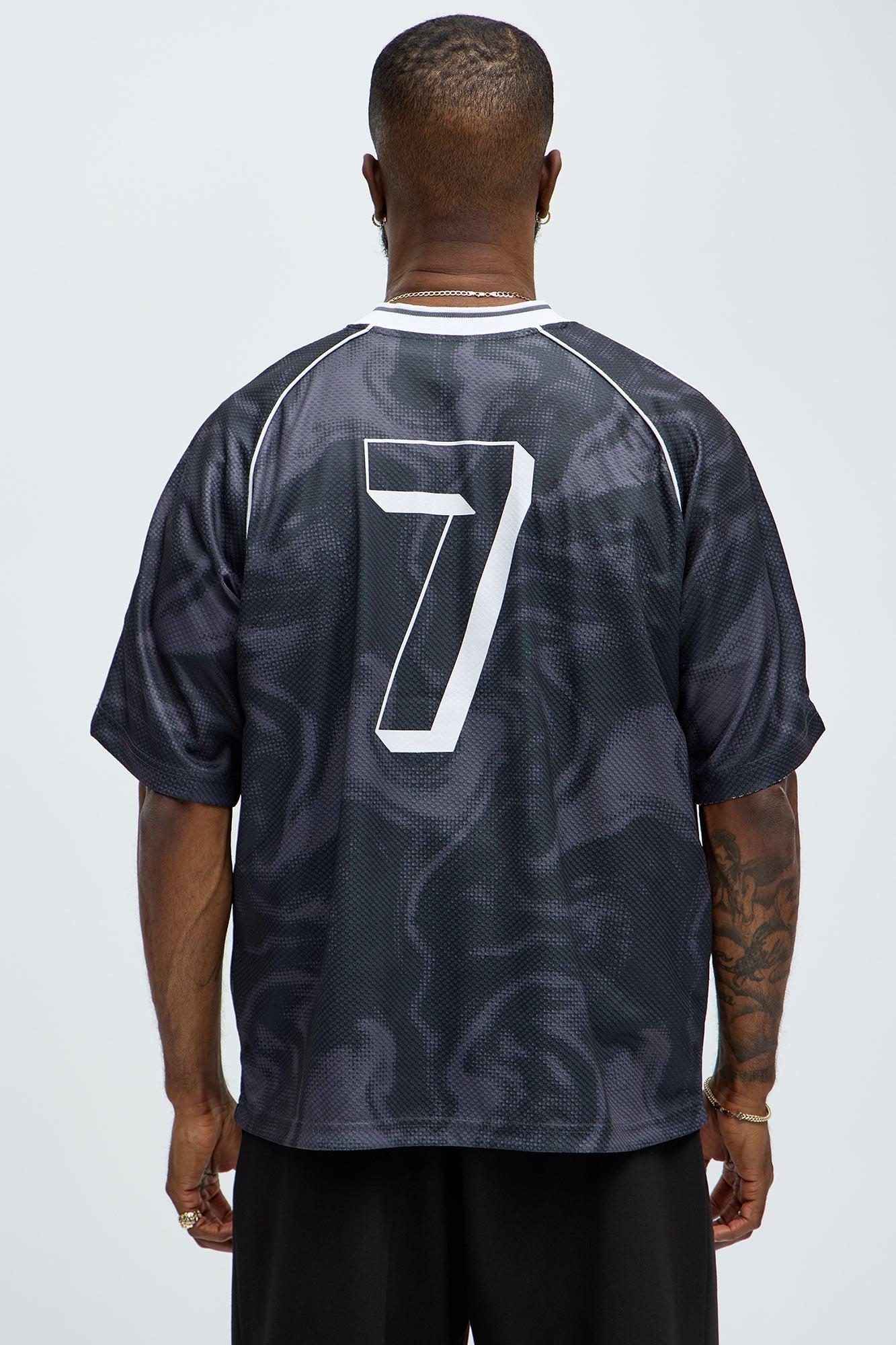 Available In Black. V Neck Short Sleeves Front And Back Jersey Inspired Graphics Heavyweight Fabric 100% Polyester Disclaimer: Due To The Printing Process A Difference In Saturation May Occur. Each Garment Is Unique. Print Placement Will Vary. Imported