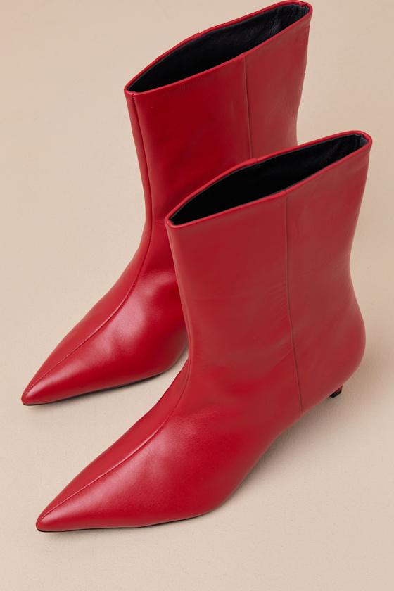 Flirty fall 'fits always finish with the Seychelles Game Changer Red Leather Pointed-Toe Mid-Calf Boots! Smooth genuine leather shapes these trend-setting boots with a pointed-toe upper that rises to an 8.25" mid-calf shaft with a 12.5" circumference. Seaming details lend a chic aesthetic to the slip-on design, all atop a sophisticated, low stiletto heel.