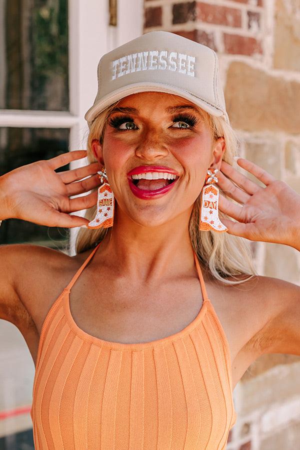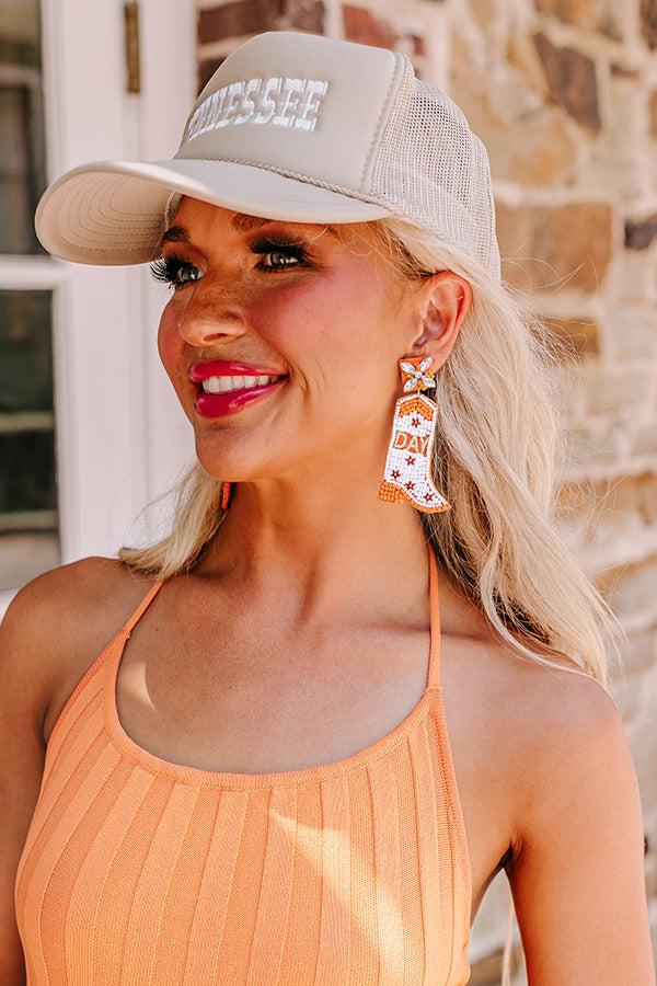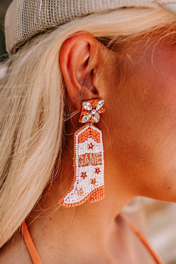 - These adorable earrings are proof that we do game day right down south! - Square studs with rhinestones as well as beading and a dangling beaded boot design featuring gold colored 'GAME DAY' embroidery and star accents - Length: 3 inches