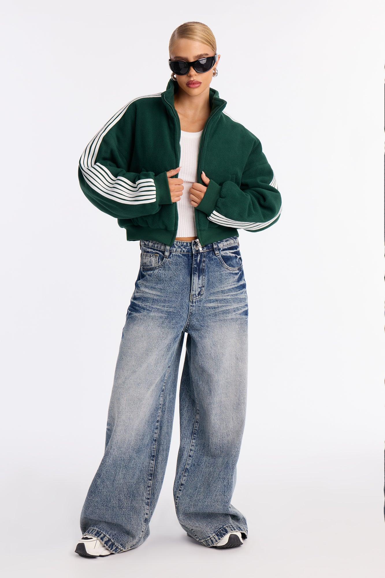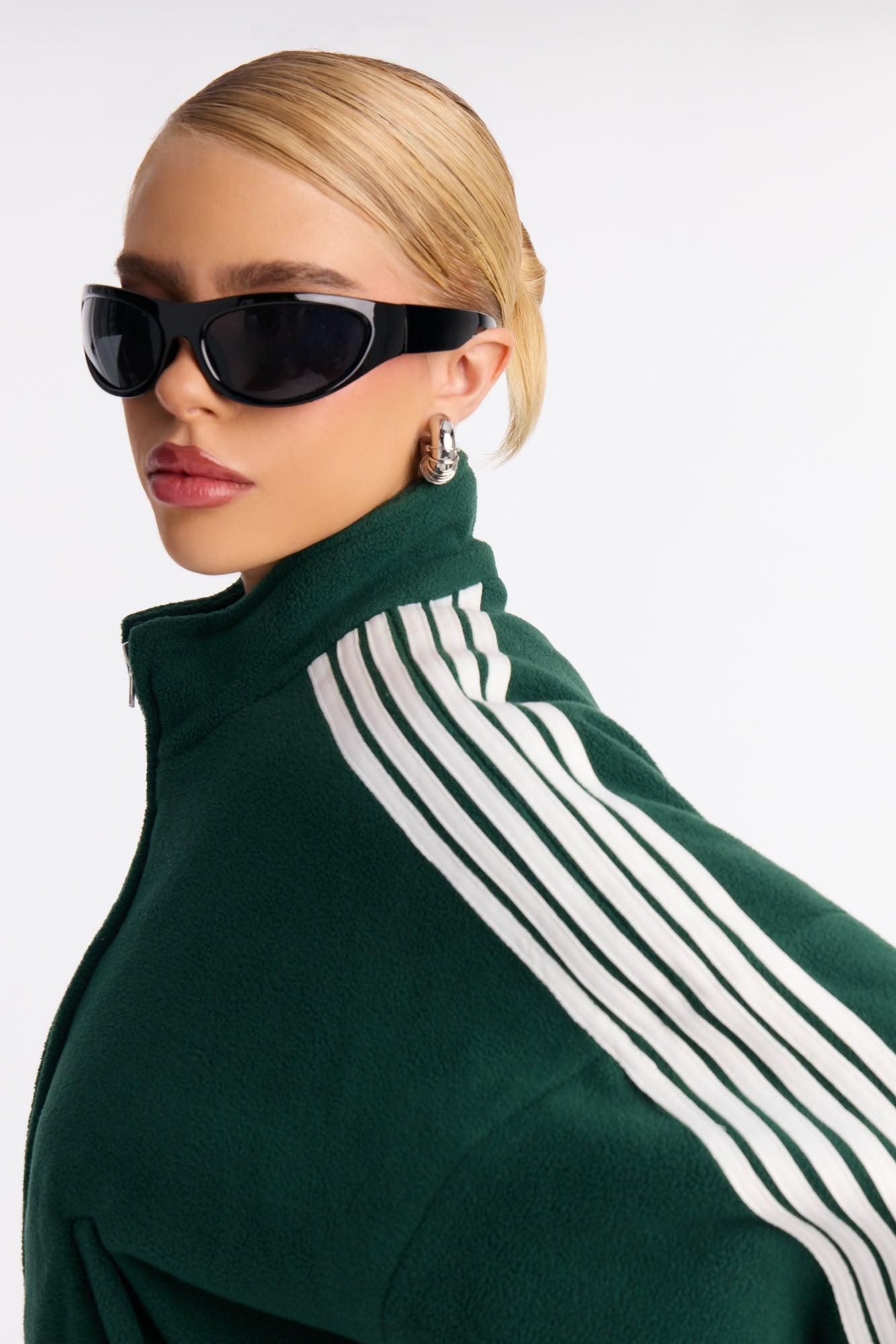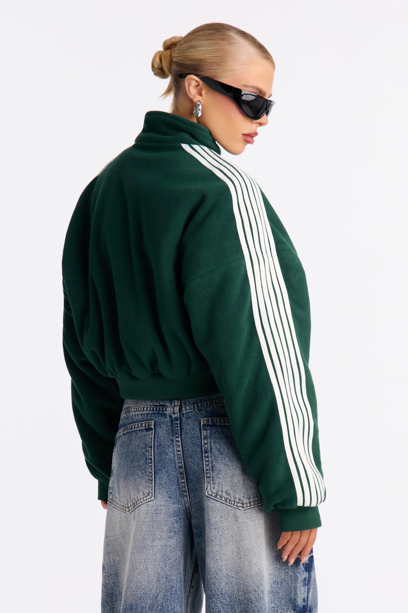 Available In Hunter And Red. Fleece Bomber Jacket Mock Neck Long Sleeves Zipper Closure Athletic Stripes Ribbed Hem And Cuffs Fully Lined Self: 100% Polyester Lining: 100% Polyester Filling: 100% Polyester Imported California Proposition 65WARNING: Cancer and Reproductive Harm - www.P65Warnings.ca.gov.