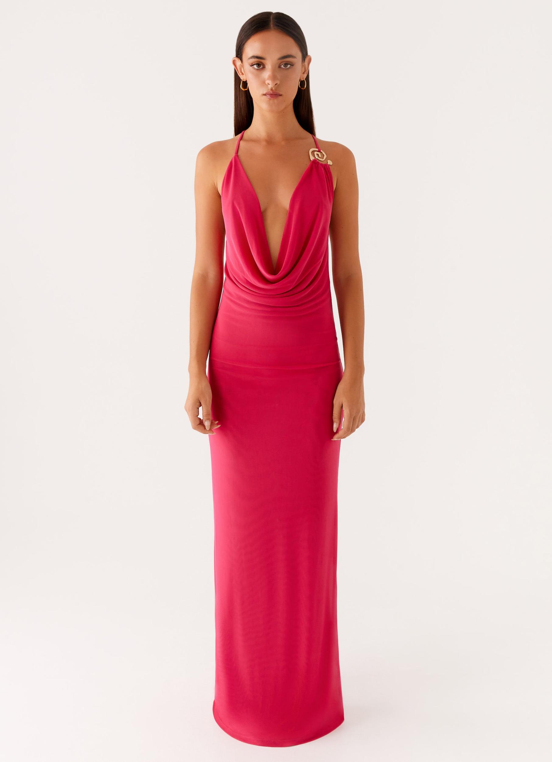 Peppermayo ExclusivePlay to win. The Game Player Maxi Dress brings drama after dark with a low front cowl and barely-there thin straps. Liquid-like drape meets a floor-skimming silhouette—made for golden hour entrances and moonlit exits.- Maxi length - Low front cowl neckline - Thin straps - Front and back metal embellishment - Open back - Self lined - Semi sheer - Stretch mesh - 95% Polyester / 5% SpandexSize AU 8 / US 4 garment measurements:Length: 147 cm / 57.87 inWaist: 78 cm / 30.71 inHip: 82 cm / 32.28 inHem: 110 cm / 43.31 inRoberta is 177cm and wearing a size AU 6 / and US 2