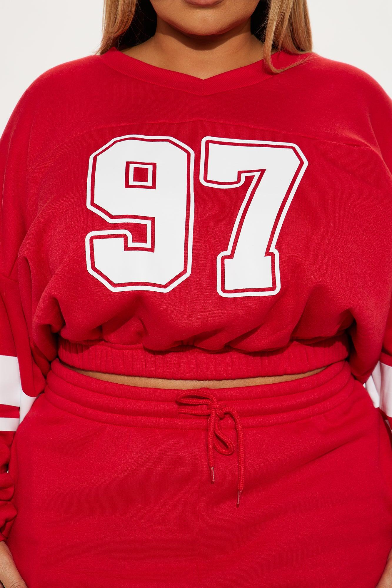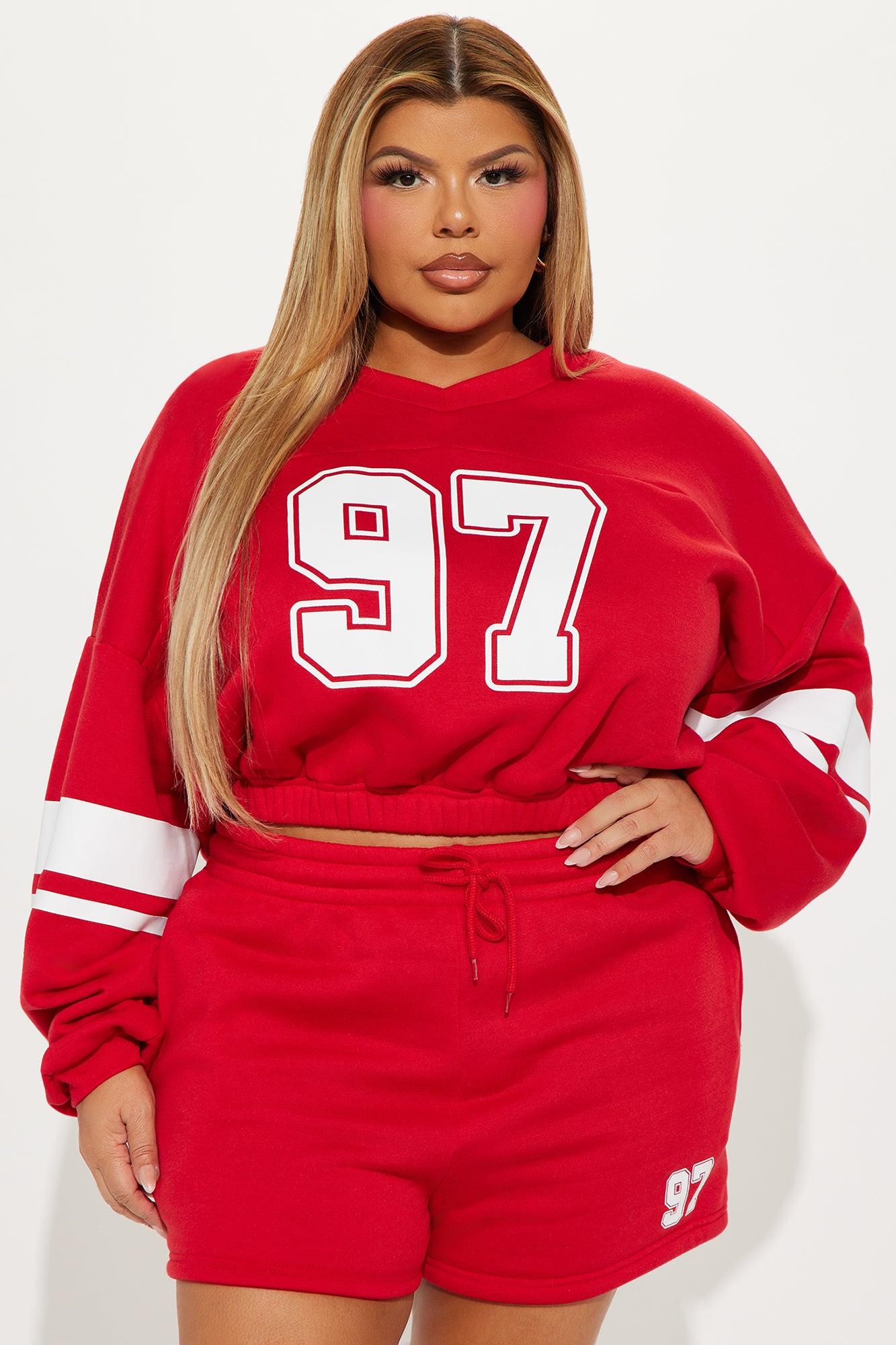 Available In Red. Fleece Sweatshirt and Short Set Stretch Elastic Waistband Pockets Disclaimer: Due To The Screen Printing Process A Difference In Saturation May Occur. Each Garment Is Unique. 100% Polyester Imported