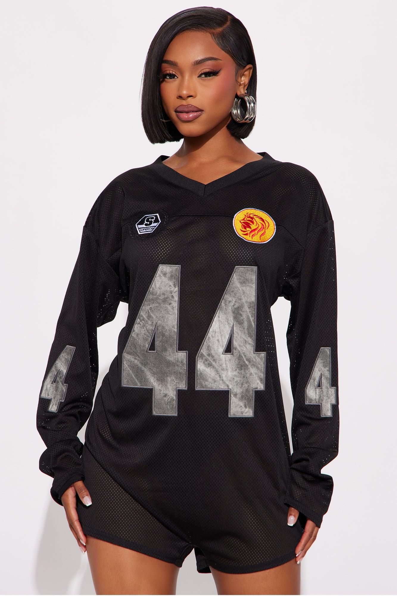 Available In Black. Romper Stretch Long Sleeve Jersey Straight Short Invisible Back Zipper Self: 100% Polyester Contrast1: 100% Polyester Contrast2: 55% Cotton 45% Polyurethane Imported California Proposition 65WARNING: Cancer and Reproductive Harm - www.P65Warnings.ca.gov.