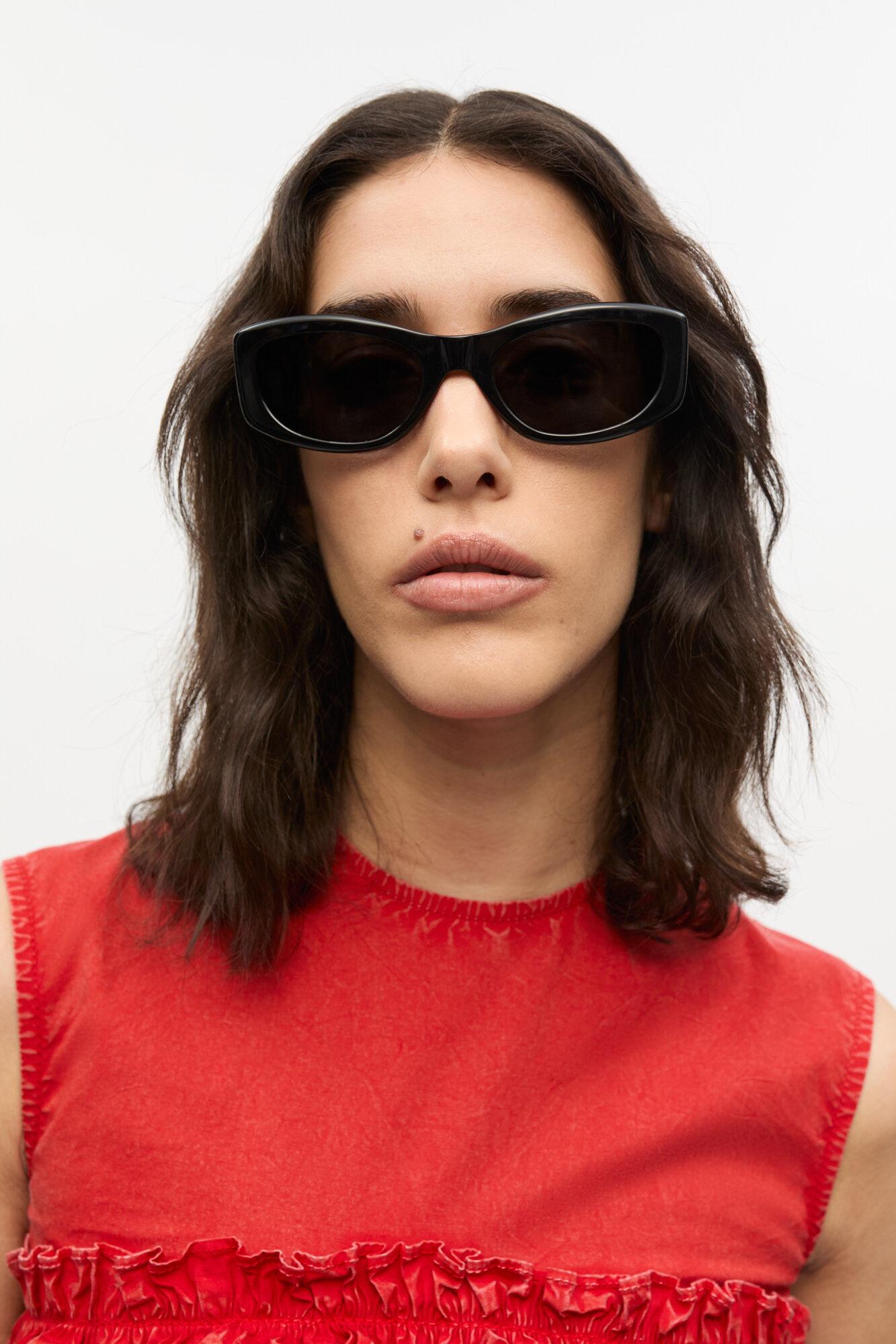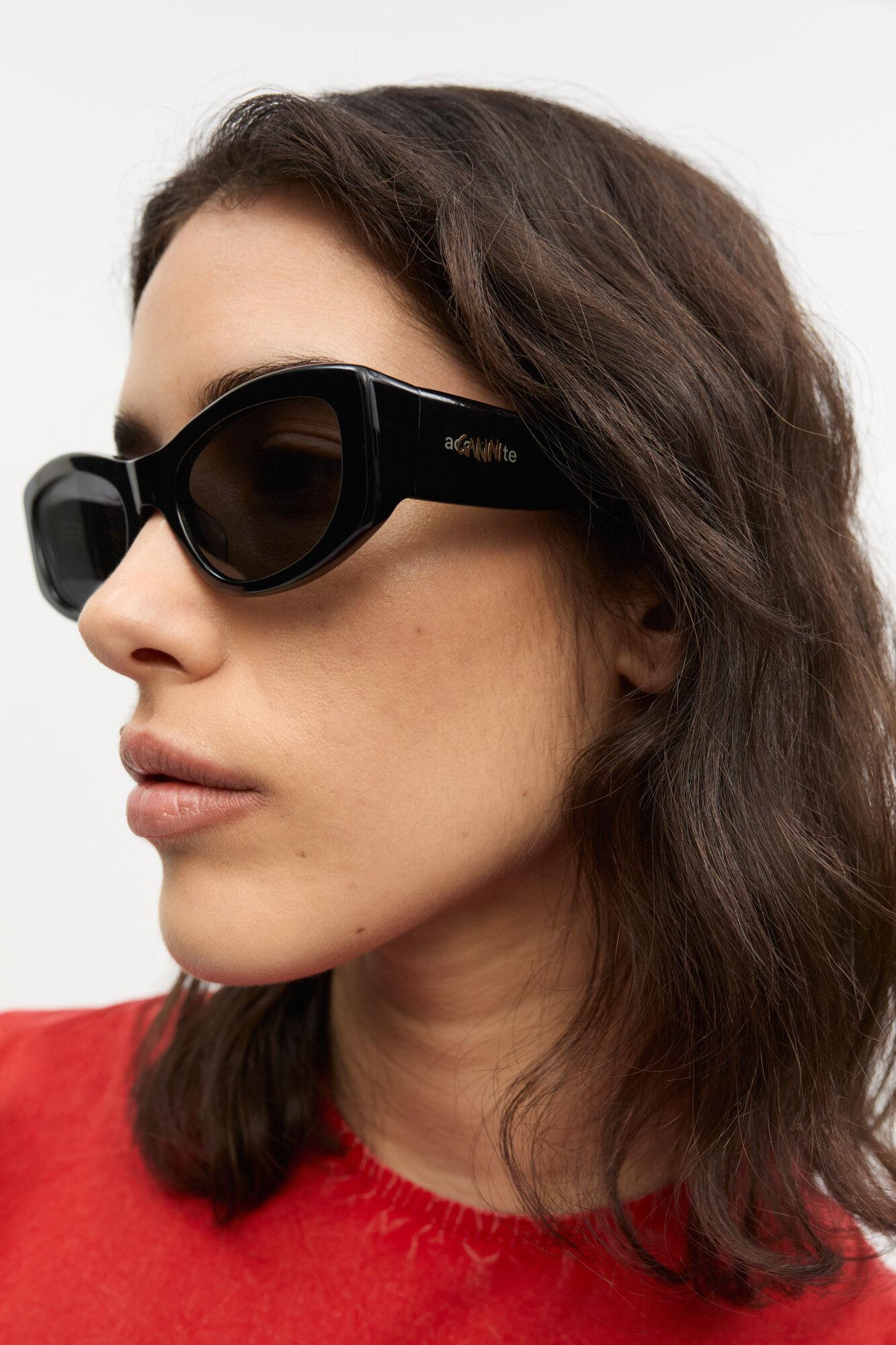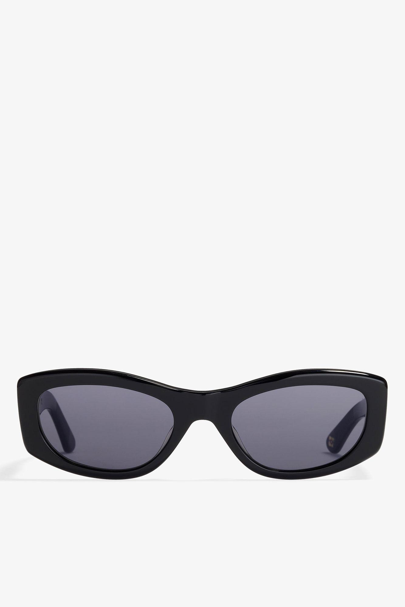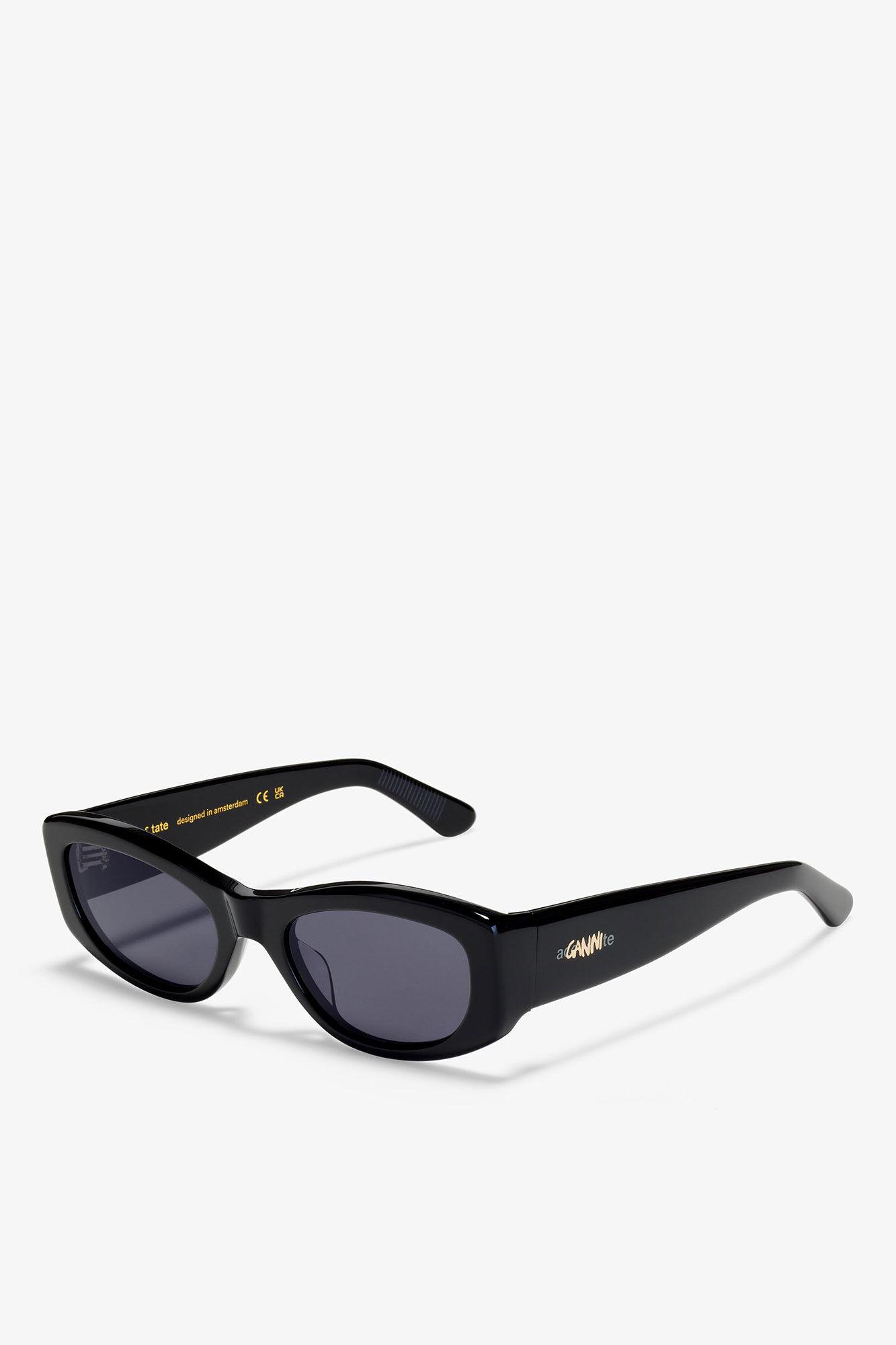 GANNI x Ace & Tate returns with three limited-edition sunglasses silhouettes designed to frame every side of your personality. These sunglasses feature a black rectangular frame. The tinted lenses provide UV protection and include logo detailing on the temples and middle end pieces.