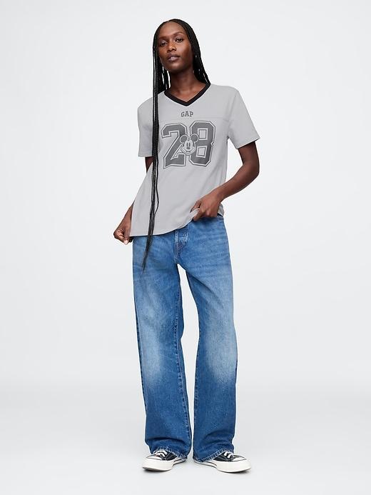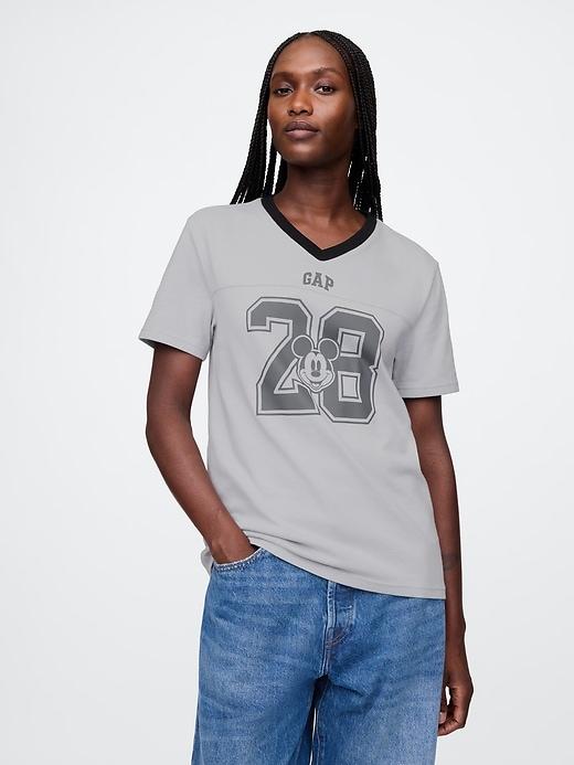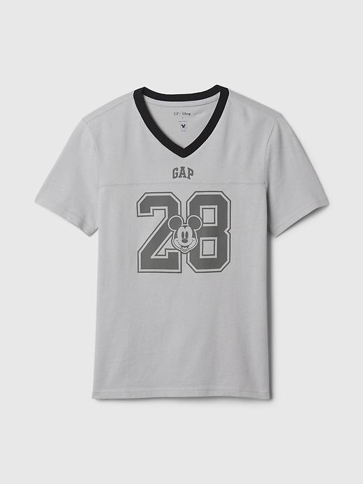 Soft cotton jersey T-shirt. Contrast v-neck. Short sleeves. Varsity-style numbers with assorted Disney character graphics and Gap logo at front. #710879