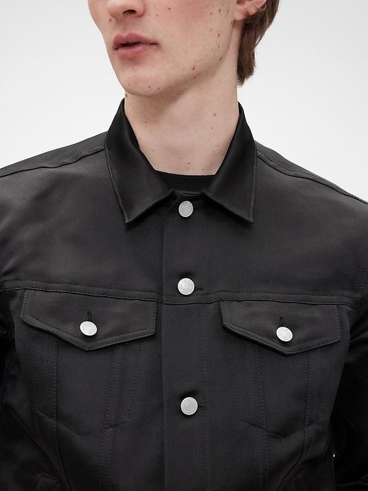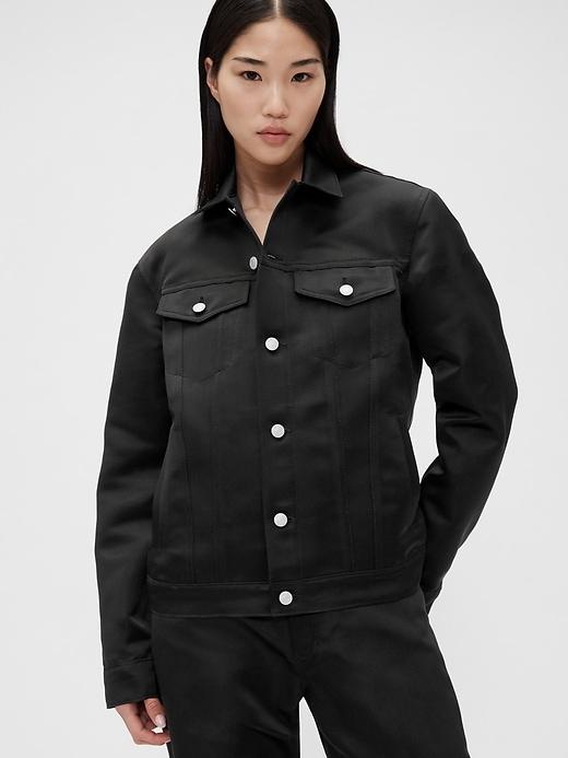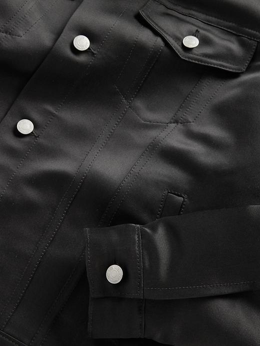 Satin icon jacket. This style is designed to be worn genderfully. Point collar, button front. Long sleeves. Pockets at front. Responsibly Made: Made with 100% recycled polyester. Compared to virgin materials, using recycled materials helps reduce resource use and waste. #833874