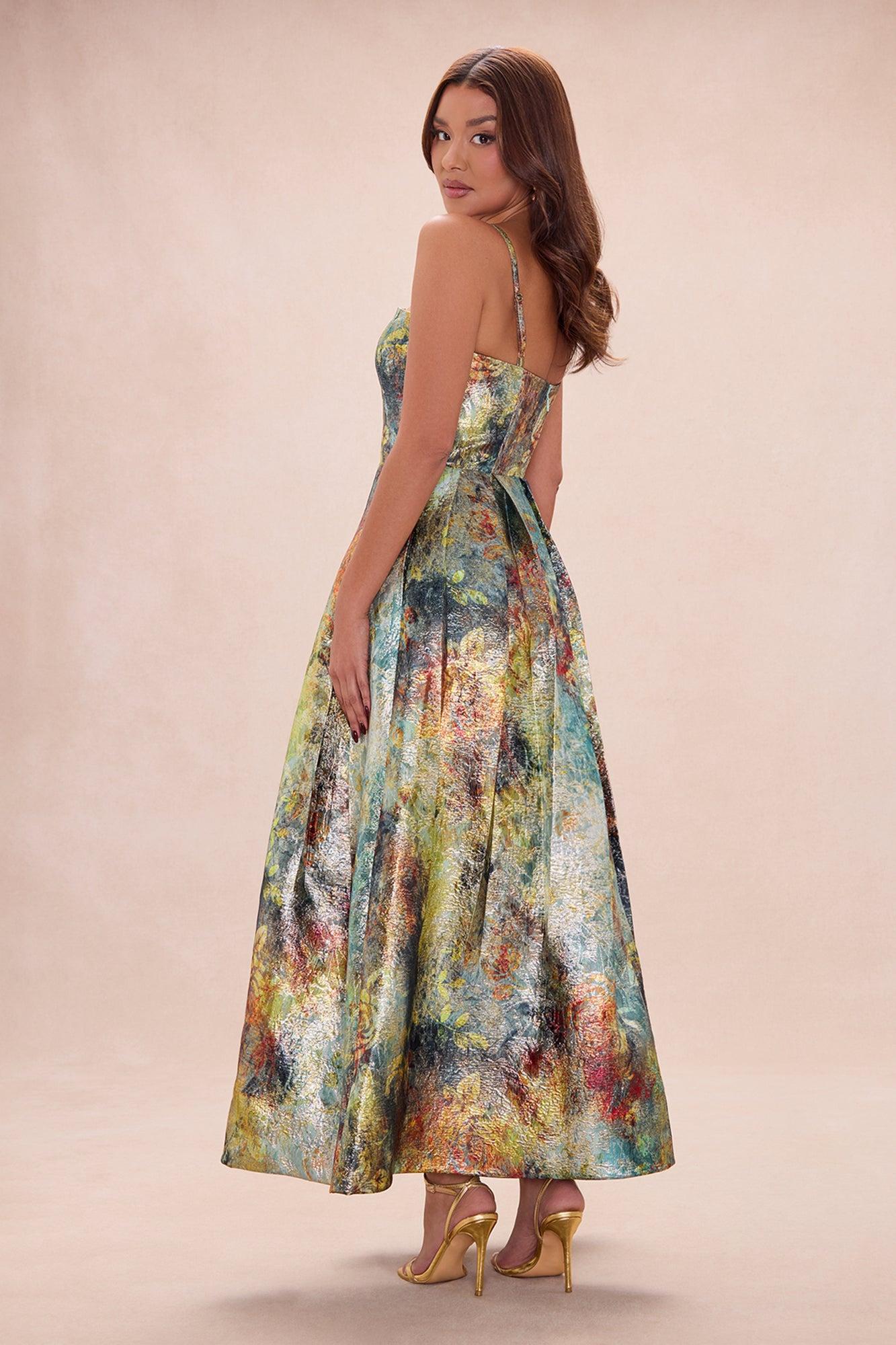 Available In Green/combo. Jacquard Maxi Dress Adjustable Spaghetti Straps Square Neckline Boning Pleated Detail Hidden Back Zipper Closure Lined Non Stretch Disclaimer: Print Placement May Vary Shell: 100% Polyester Lining: 95% Polyester 5% Spandex Imported