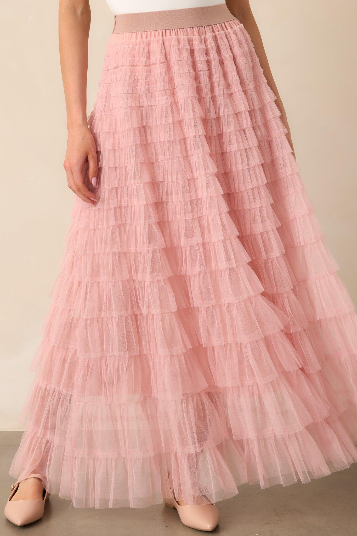 Indulge in the romantic and feminine charm of our Garden Gathering Dusty Pink Tiered Ruffle Tulle Maxi Skirt. Made with delicate tulle and adorned with elegant ruffles, this skirt will gracefully sway with your every step. Perfect for any occasion, it's a must-have addition to your wardrobe. Enhance your style with this dreamy and enchanting skirt. This dusty pink skirt features an elastic waistband, tiered tulle design, and maxi length.