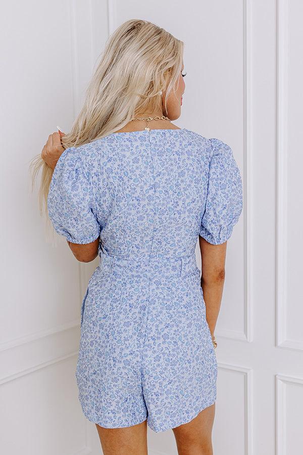 - Blossoming beauty has arrived with this darling floral jacquard romper! With delicate blooms, its puff sleeves add a touch of whimsy while the flattering belted waistline accentuates your curves with a sprinkle of charm. Perfect for picnics in the park or strolls through sun-kissed gardens, this romper radiates sweetness and bubbly flair, making every moment feel like a delightful adventure in full bloom. - Unlined floral jacquard material featuring blue hues - A square cut neckline - Back zip closure - Short puff sleeves with elastic cuffs - Belt loops and a removable buckle closure belt - Accent pleating below the waistline - Functional side pockets - A relaxed yet flattering silhouette that ends in upper-thigh length hemlines