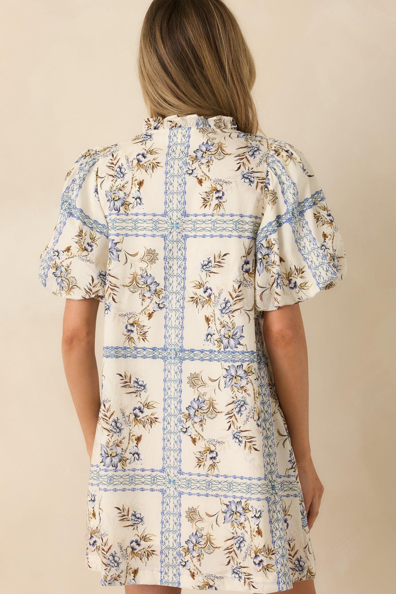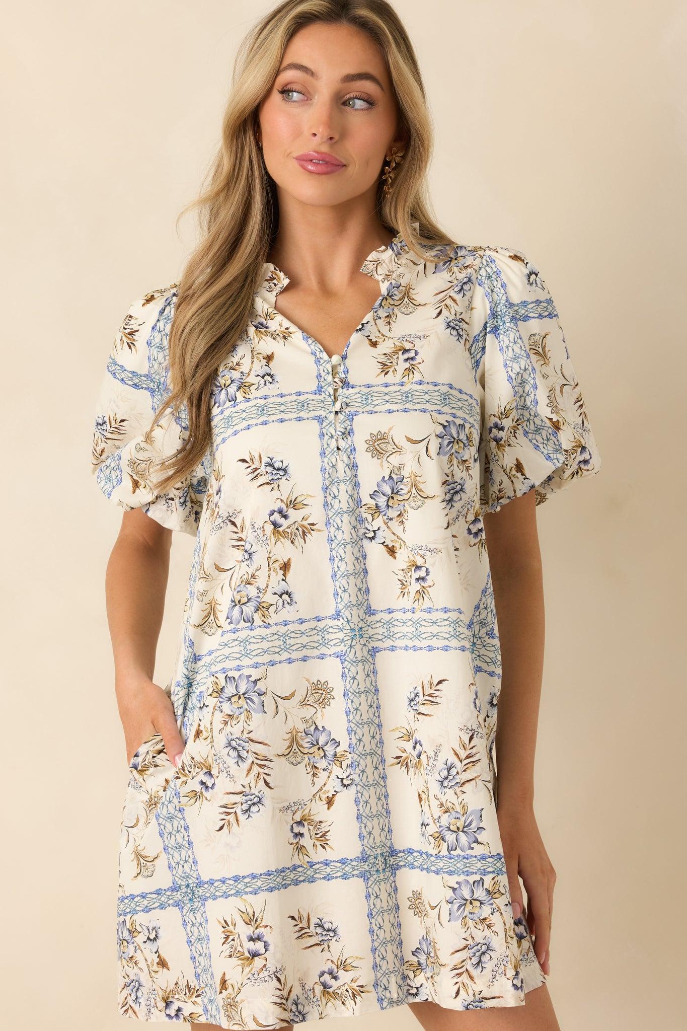 Garden Lattice Ivory Multi Cotton Floral Tile Print Mini Dress feels like a stroll through a sunlit courtyard, where soft florals meet classic pattern play. The vintage-inspired tile print gives this mini dress a timeless charm, while the easy silhouette keeps it feeling fresh, feminine, and endlessly wearable. It’s the kind of piece that looks just as good styled up for brunch as it does dressed down for everyday plans. This ivory cotton mini dress features a blue and neutral floral tile-inspired print throughout. Designed with a split V-neckline accented by subtle ruffle trim, functional button-front closure and side pockets. Short puff sleeves add gentle volume, while the relaxed bodice flows into a softly flared skirt. 100% Cotton Lining: 100% Polyester Hand Wash Cold Manufactured in China Designed in The USA Model is 5'8" and Wearing a Size Small, Clipped, Model is a True X-Small