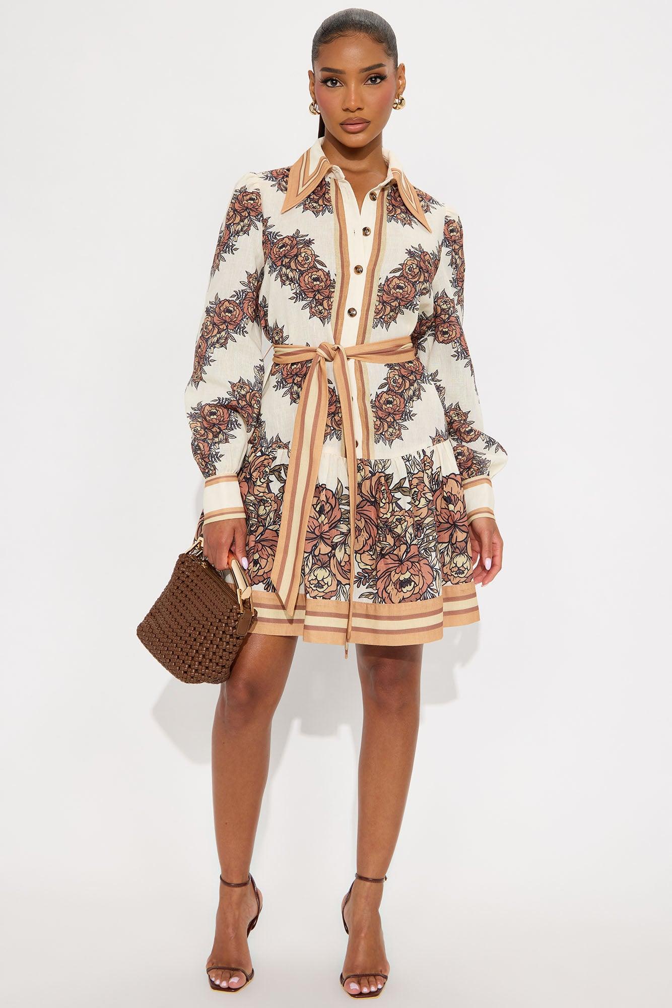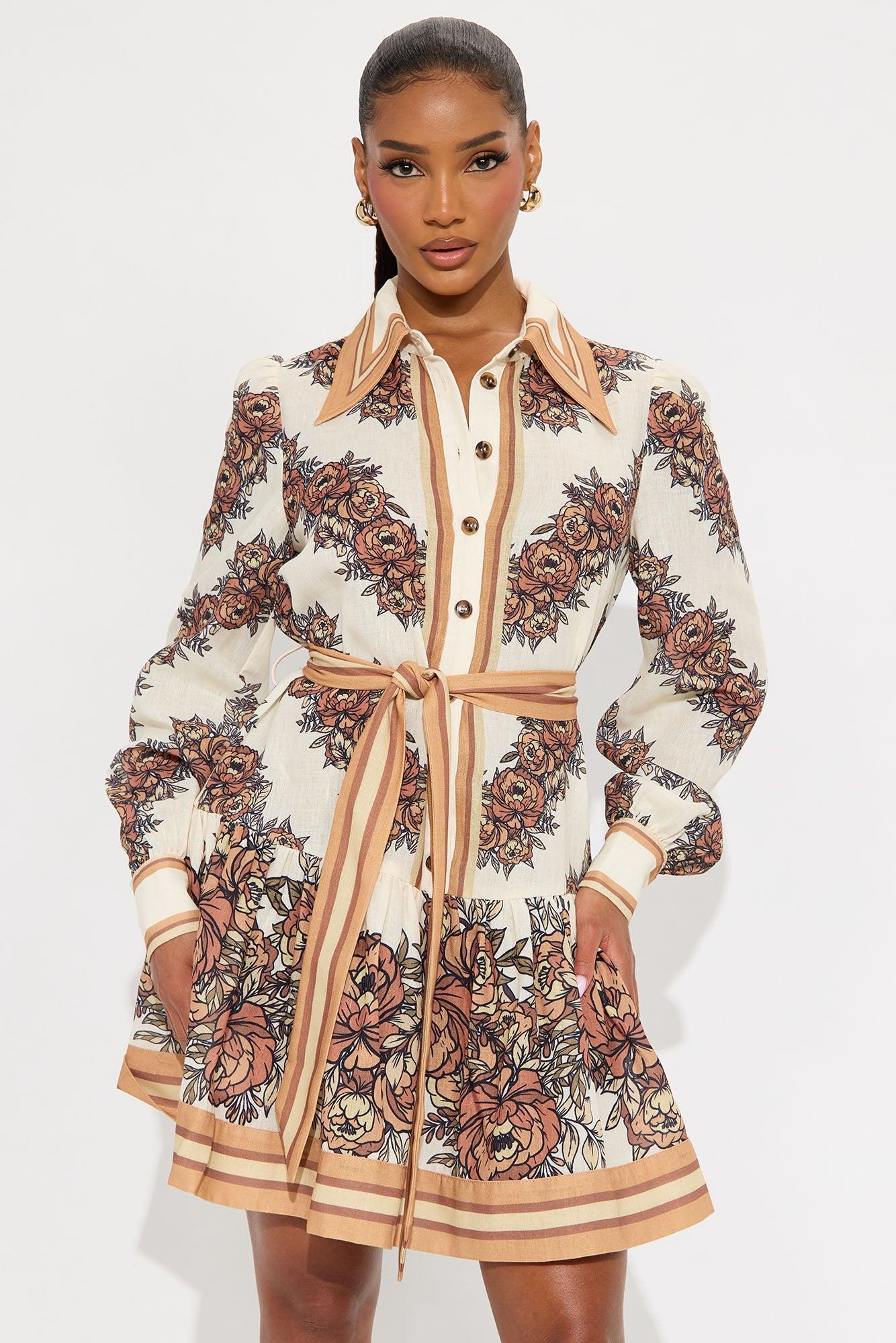 Available In Mocha And Yellow/combo. Linen Mini Dress Collar Neckline Long Balloon Sleeves Button Up Tie Waist Length Measured Flat = 33" Disclaimer: Print Placement Will Vary Self: 93% Polyester 7% Rayon Imported California Proposition 65WARNING: Cancer and Reproductive Harm - www.P65Warnings.ca.gov.