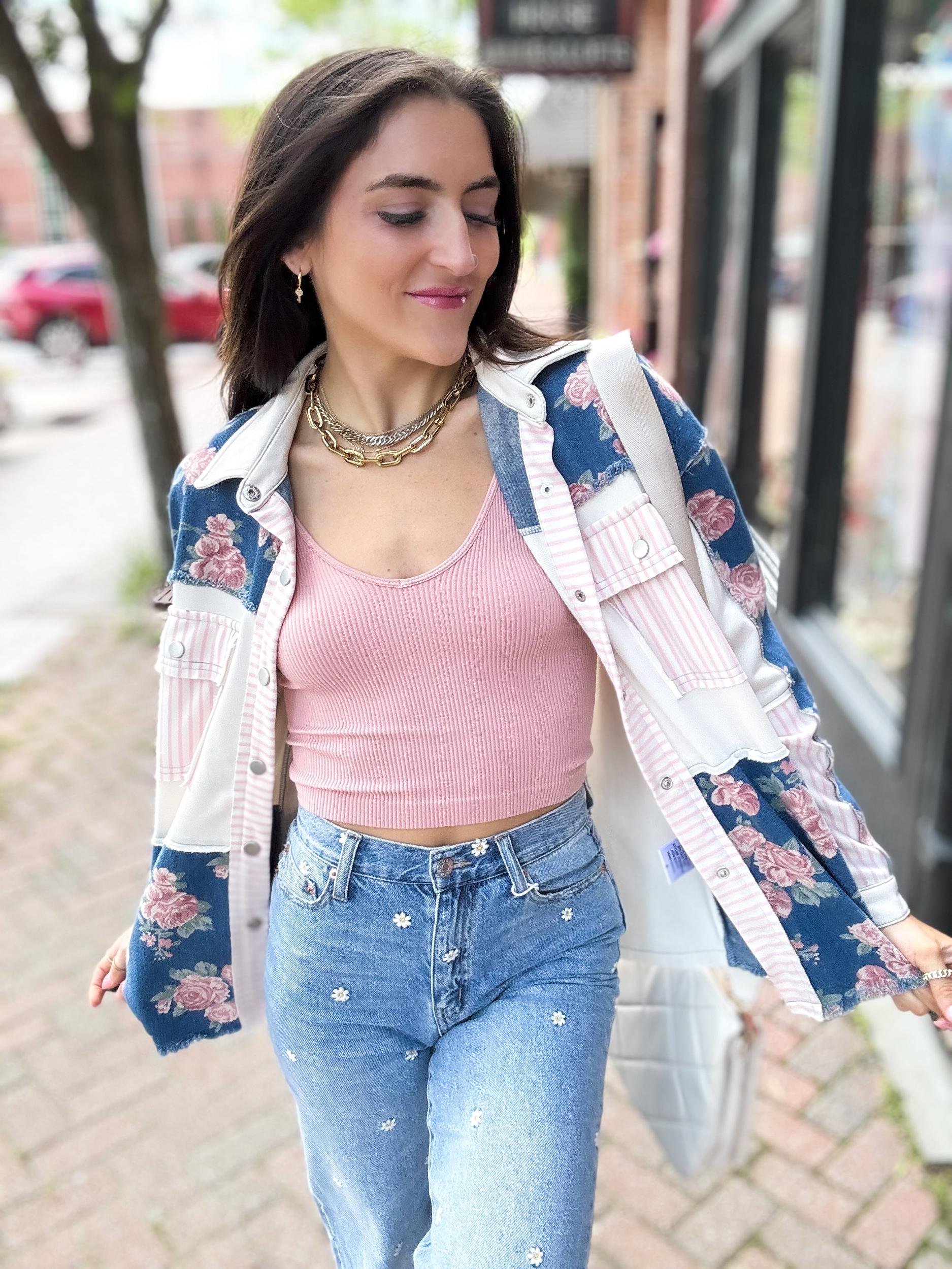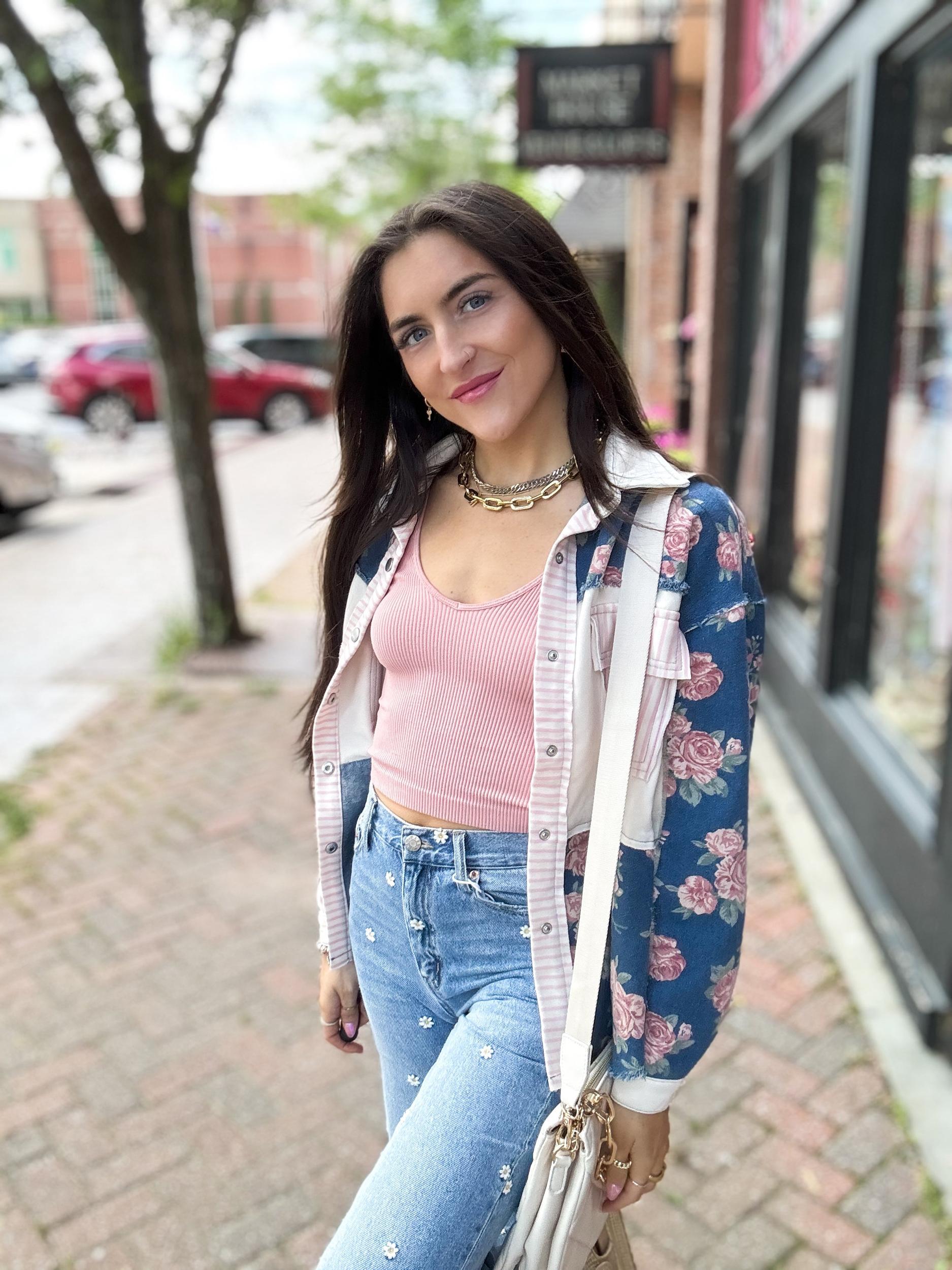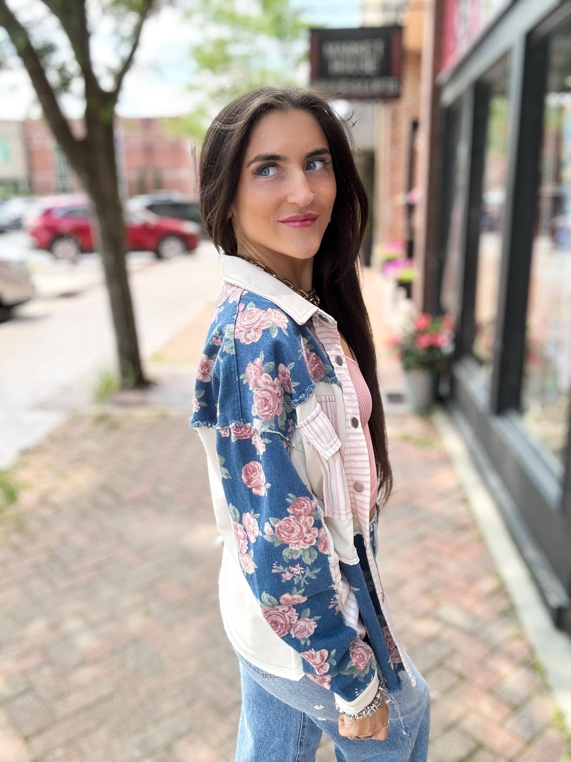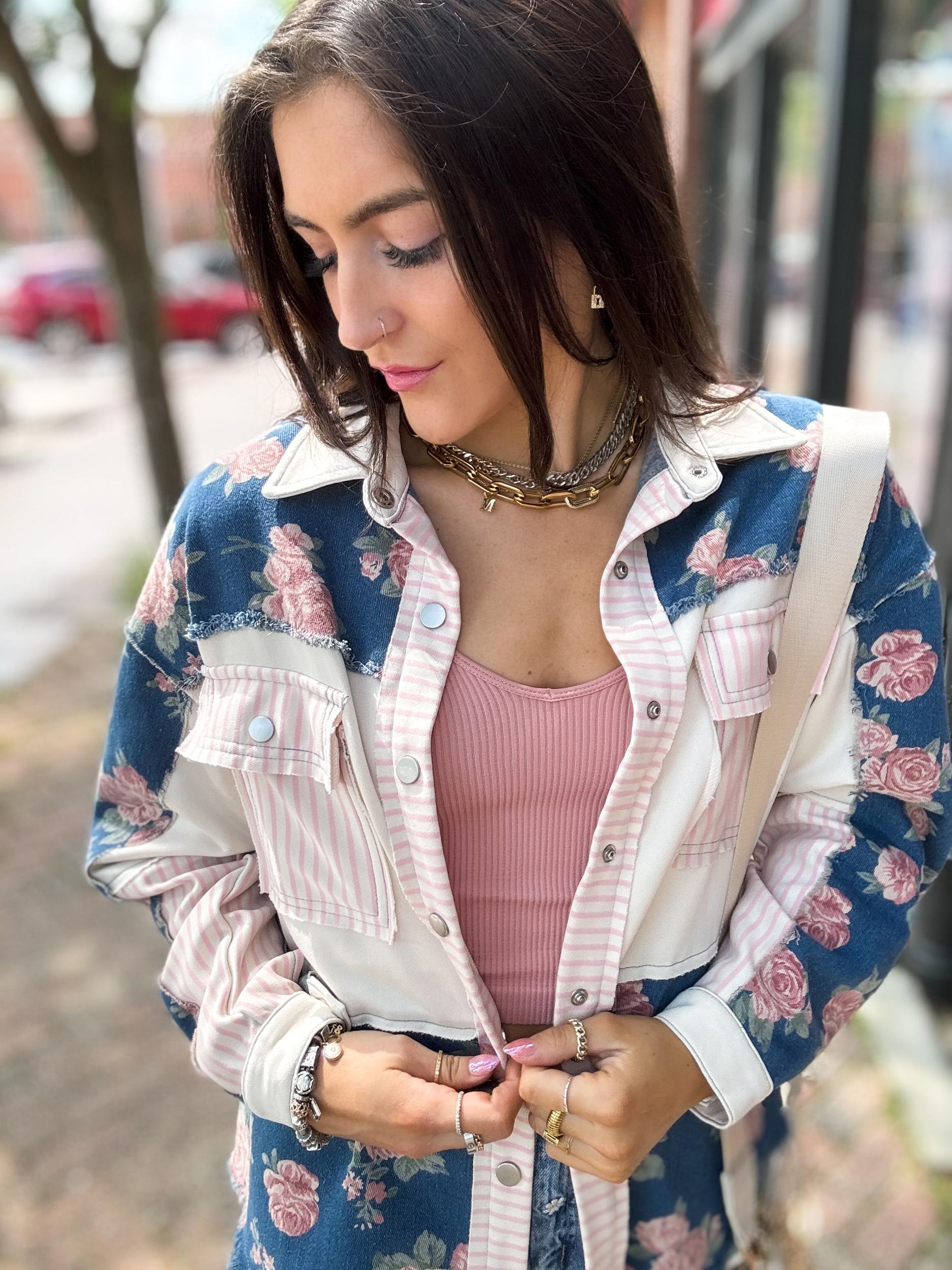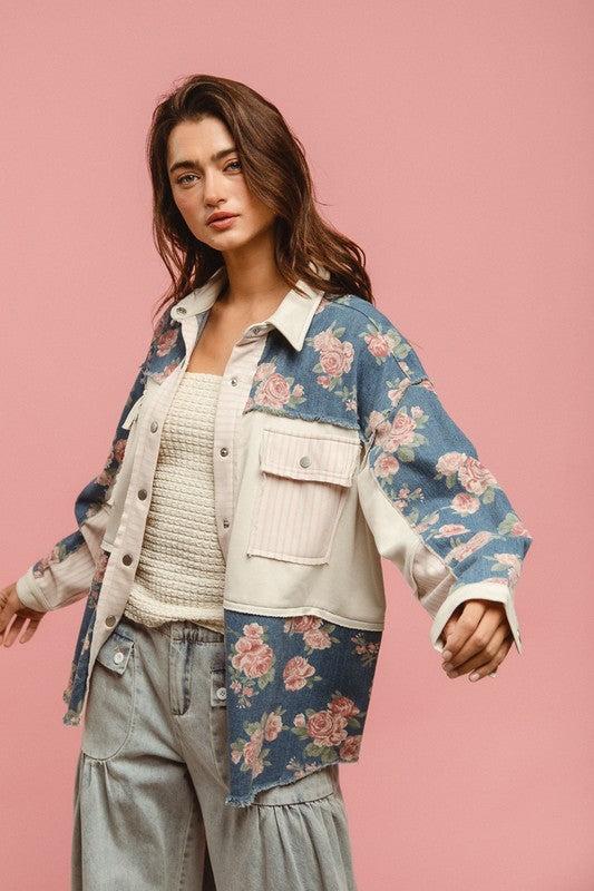 Get ready to turn heads with our Garden Patch Shacket! Made with a mix of washed and printed denim, this oversized shirt top features contrast cut edge detailing for a unique look. Perfect for mixing and matching to create your own personal style.