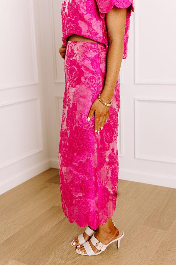 - This floral skirt brings elevated style with the sweetest scalloped detailing! It's a charming pick that adds a chic touch to any outfit. - Floral jacquard material - A built-in lining ending above the knee - Back zip closure - A relaxed silhouette that ends in a scalloped hemline
