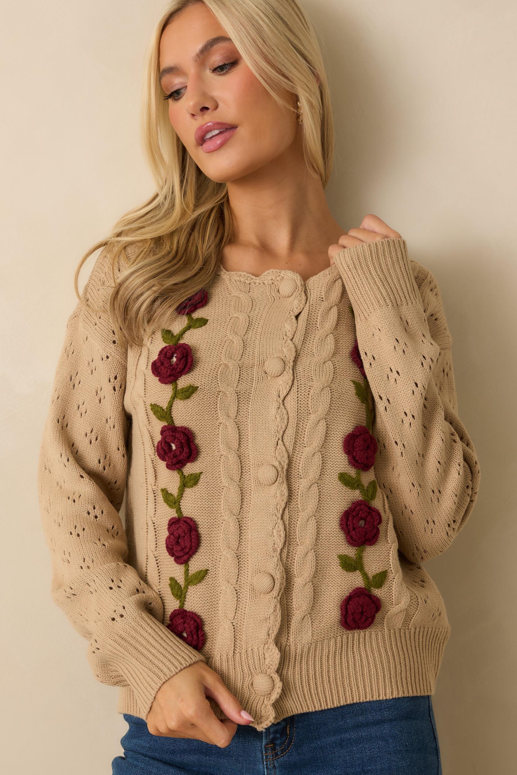 The Garden Variety Taupe Floral Knit Button-Up Cardigan is anything but ordinary. With its intricate cable-knit texture and charming 3D floral appliqués, it feels like a modern heirloom you’ll reach for again and again. Soft, feminine, and full of character, it brings a touch of cottage-inspired romance to even your simplest outfits. This taupe knit button-up cardigan features long sleeves, a cable-knit front with tonal button closures, openwork knit sleeves, and dimensional floral appliqué detailing for a textured finish. 100% Acrylic Unlined Hand Wash Cold Manufactured in China Designed in the USA Model is 5'6" and wearing size small.