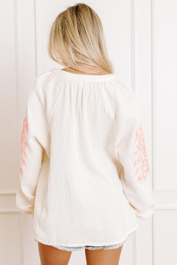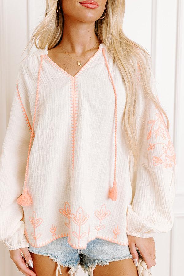 - Let the florals do the talking in this playful embroidered top. It's the kind of piece that instantly brightens your day and keeps you looking cute. - Unlined, subtly textured material - Neon orange accents - Neon orange floral embroidery - A v-cut neckline with a tie detail featuring accent tassels - Long sleeves with elastic cuffs - A relaxed silhouette that ends in a straight hemline