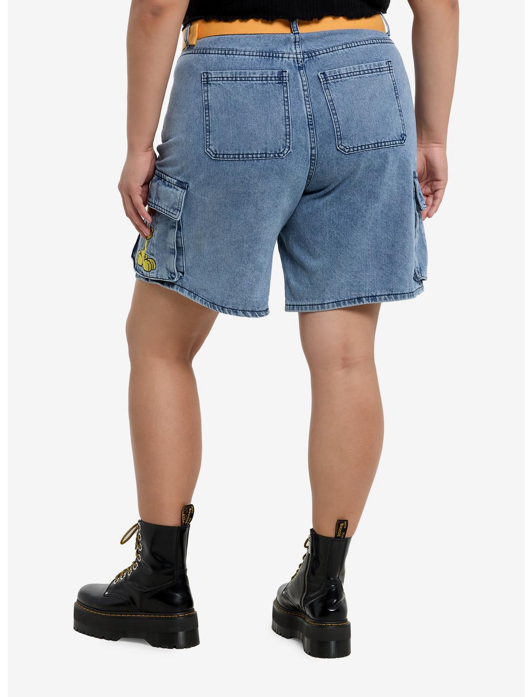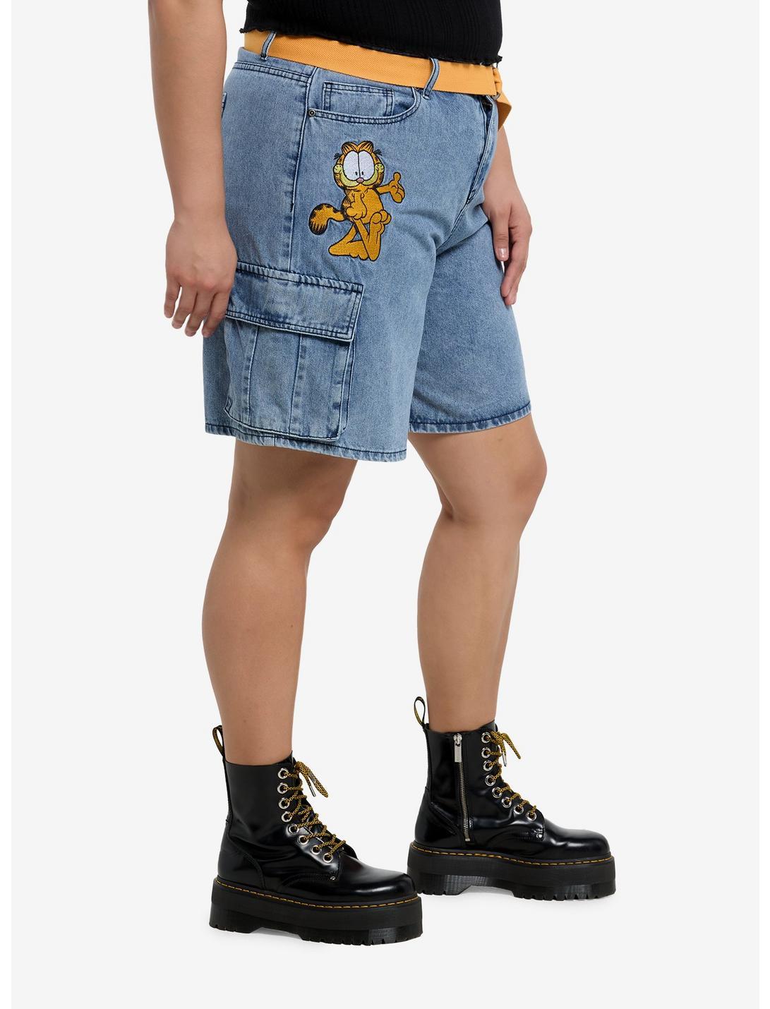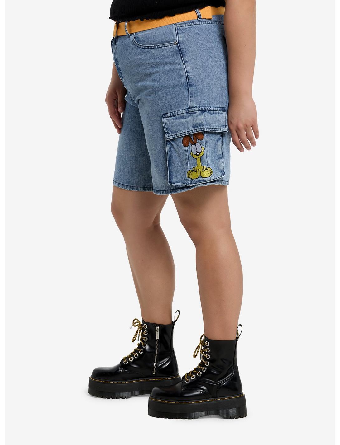 Feeling lazy? Throw on these blue denim cargo shorts inspired by Garfield. They're embroidered with portraits of Garfield and Odie, and come with a removable, Garfield-colored canvas belt. Complete with large cargo pockets.98% cotton; 2% other fabricsWash cold; dry lowImportedModel is 5'10"Model wears size 16