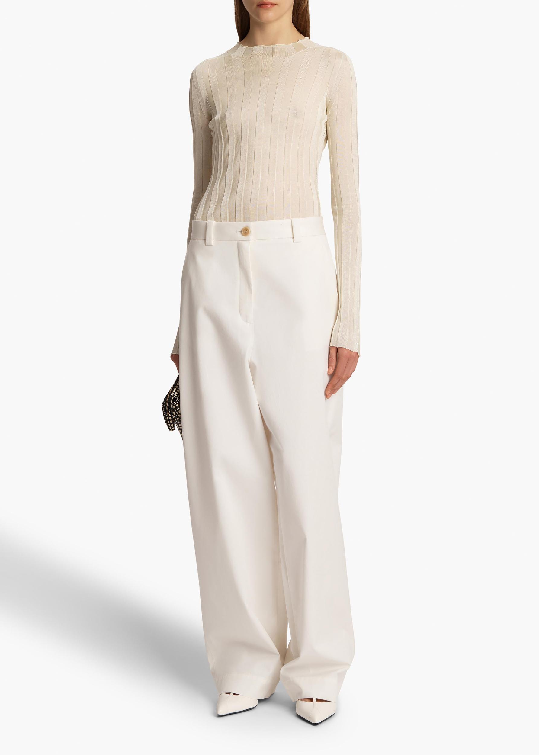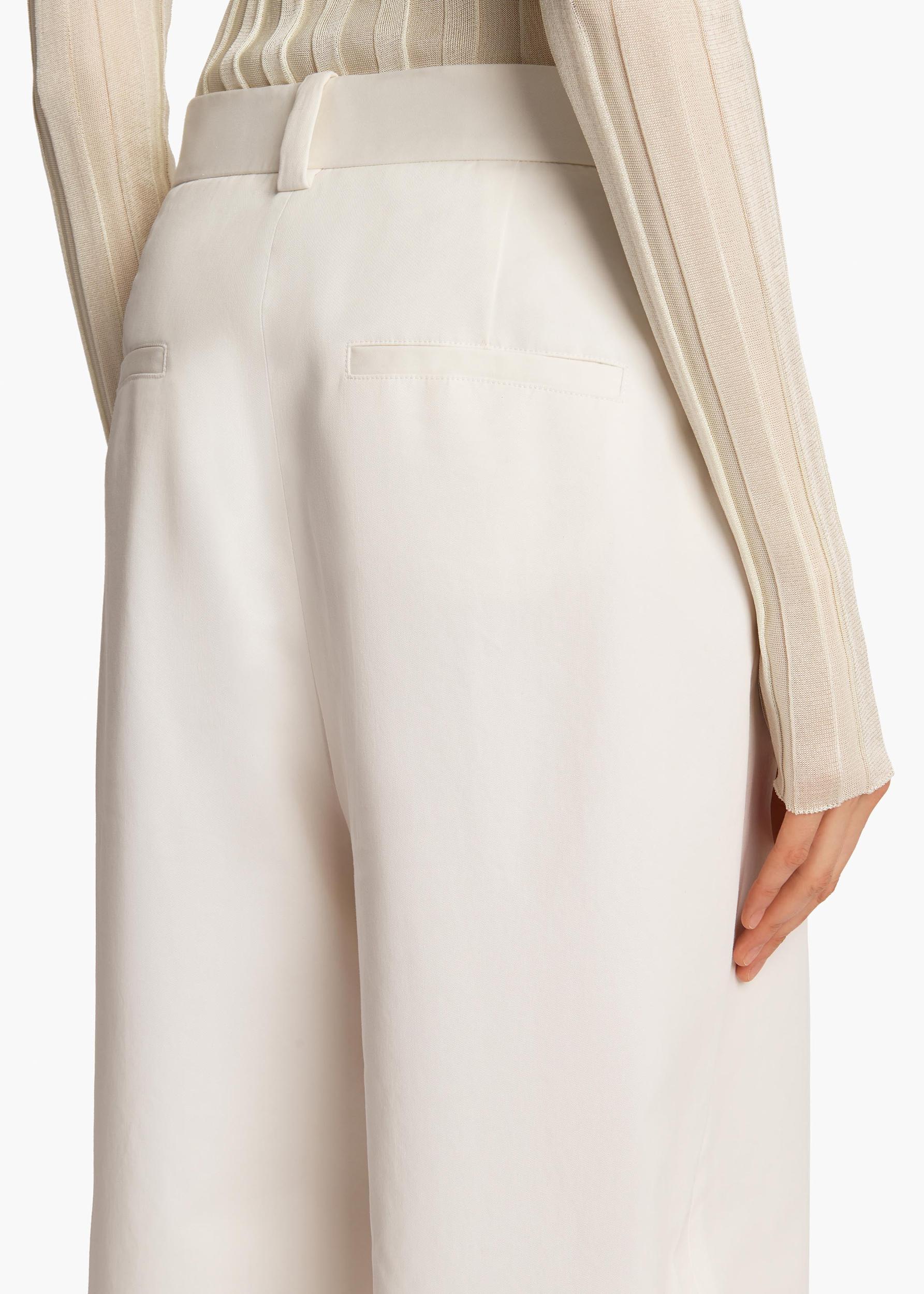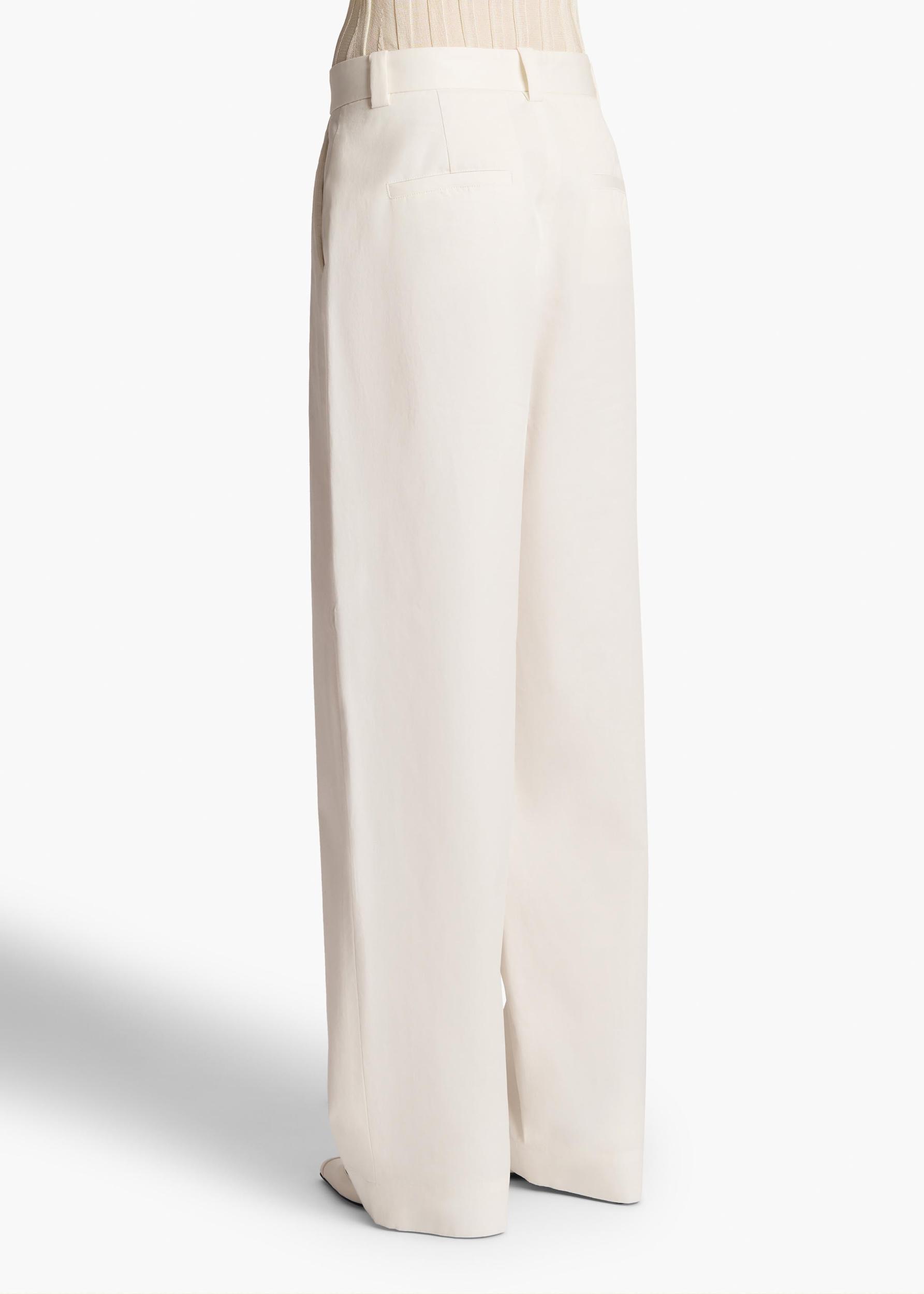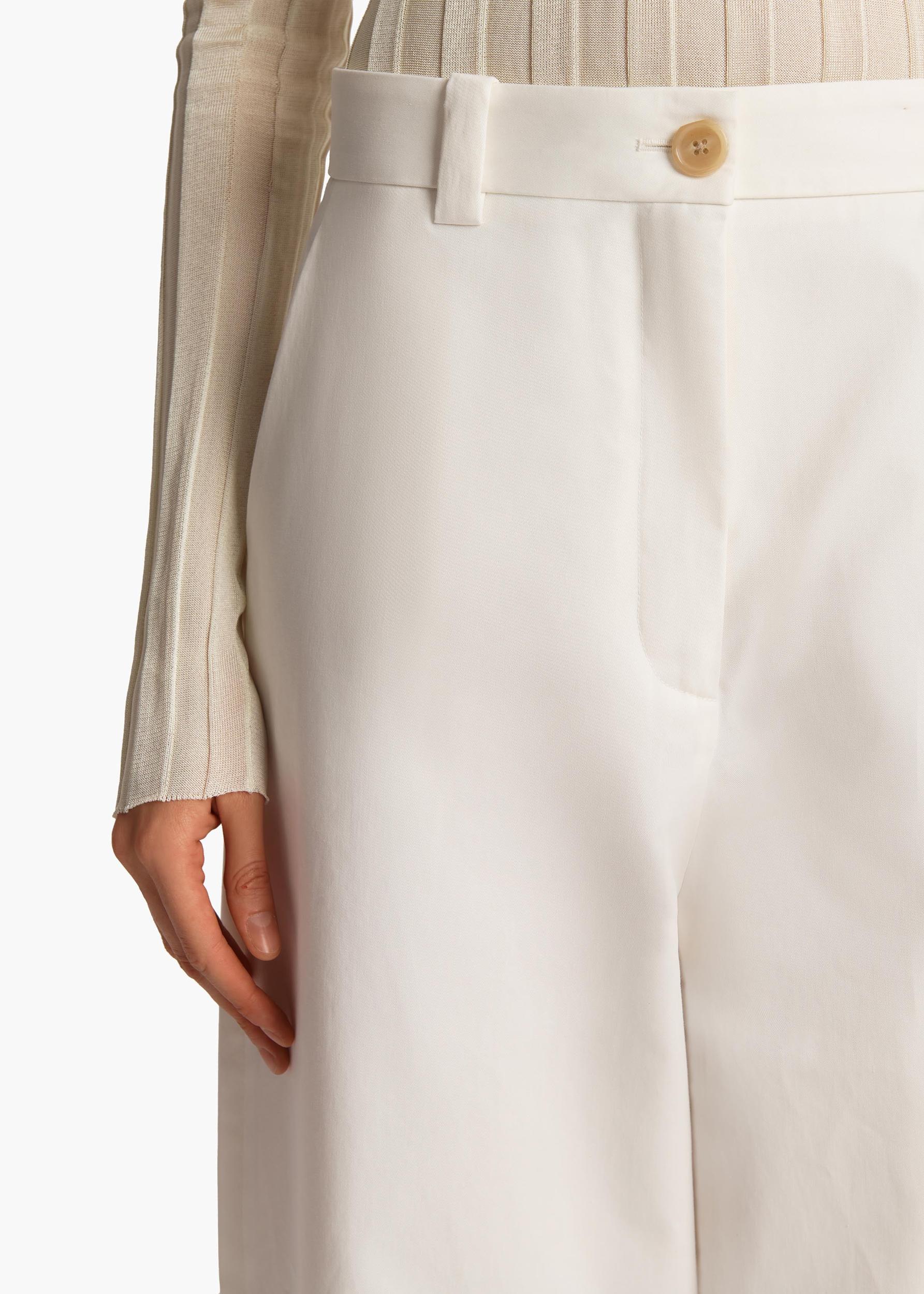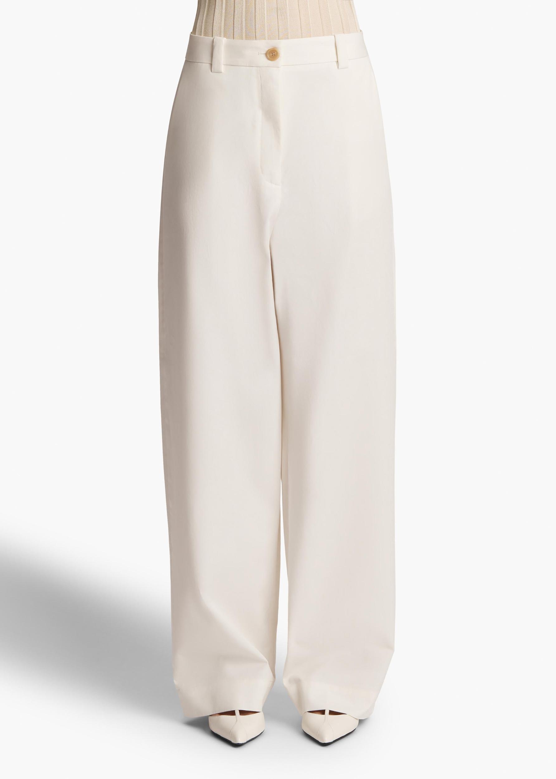 An easy-fitting, lightweight pant in waxed cotton gabardine. Trouser waistband with zip fly and button closure. In-seam side pockets and back welt pockets.
