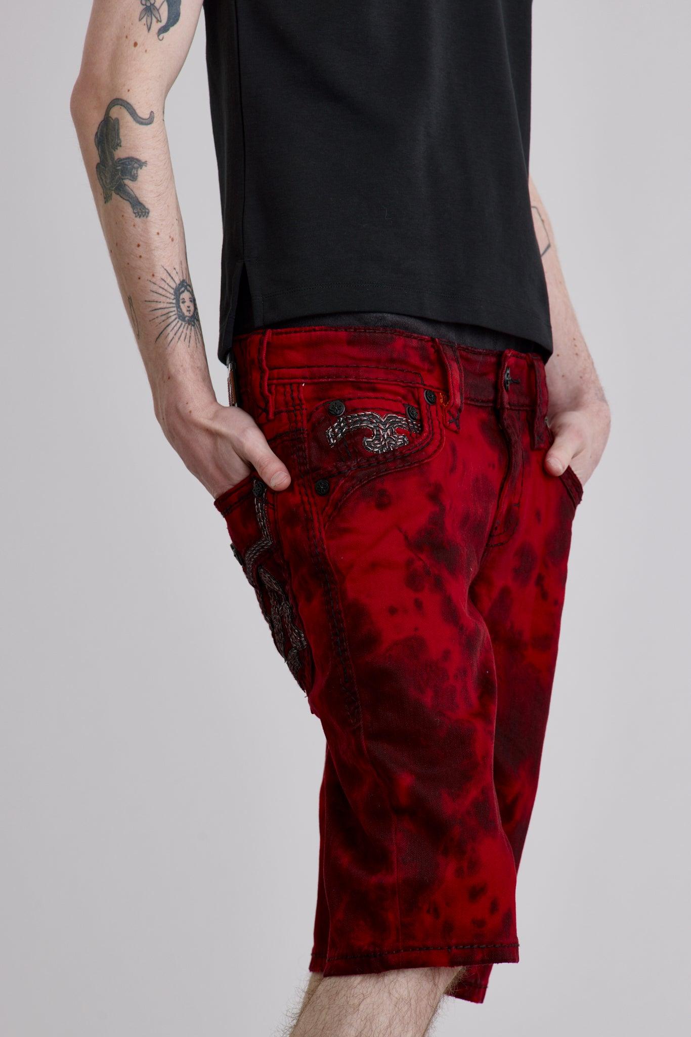 Custom matte black buttons and rivets hardware decoration throughout. Signature sizing arrow on fabric decorated with black stitching on both sides. Front legs feature a double coin pocket with an inverted Fleur De Lis logo, decorated with black leather and silver stitching. Back pockets featuring the iconic "ЯR" logo, filled with black leather and silver metallic stitching. "Rock Revival" pewter metal engraved on red and black leather patch on the belt loop. Designed with care and creativity in Los Angeles, California.