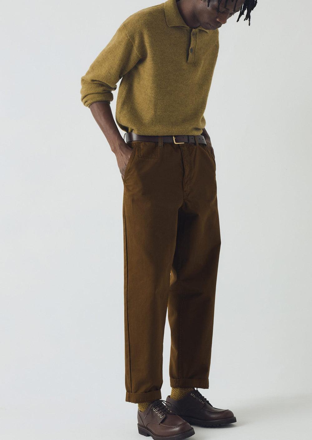 Organic cotton twill pants shaped with relaxed, tapered legs. Garment-dyed for natural colour variation. Finished with a coin pocket and back welt pockets. Fastened with a corozo button. Part of our Menswear collection.