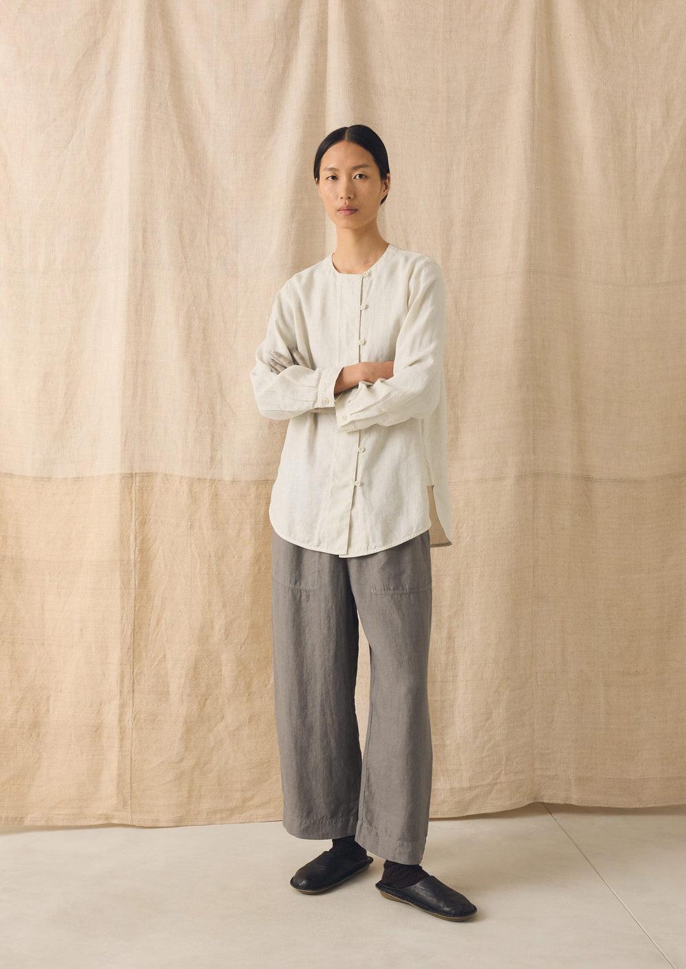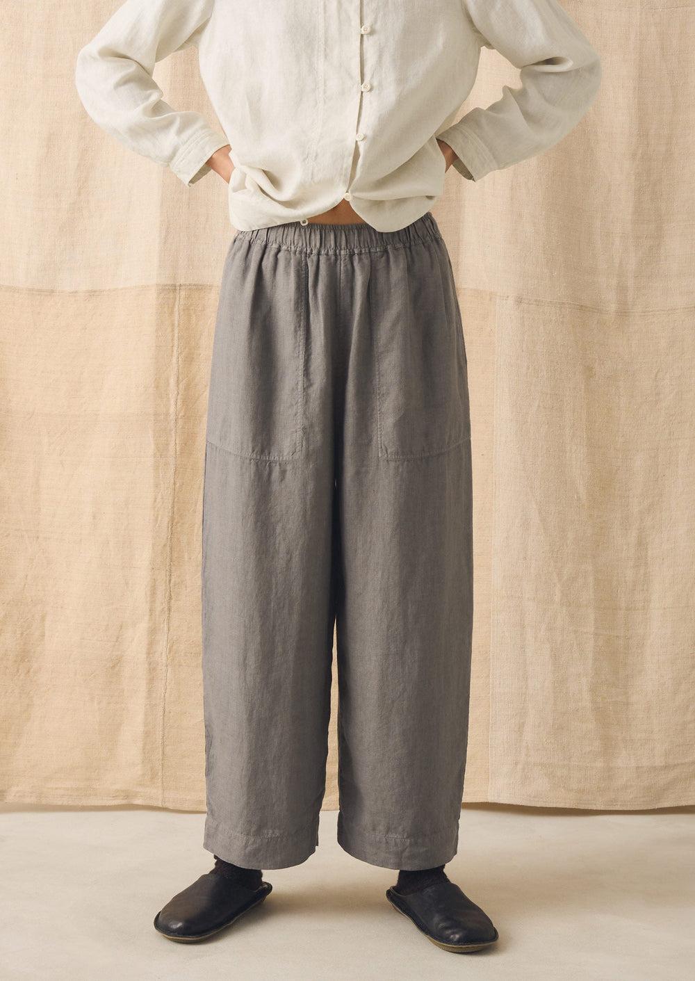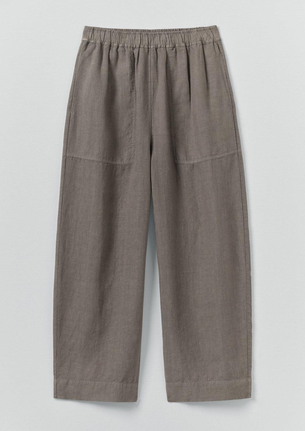Our linen pants are garment-dyed for a rich depth of colour. Falling from an elasticated waist to curved barrel legs with side pockets and cropped at the ankle.