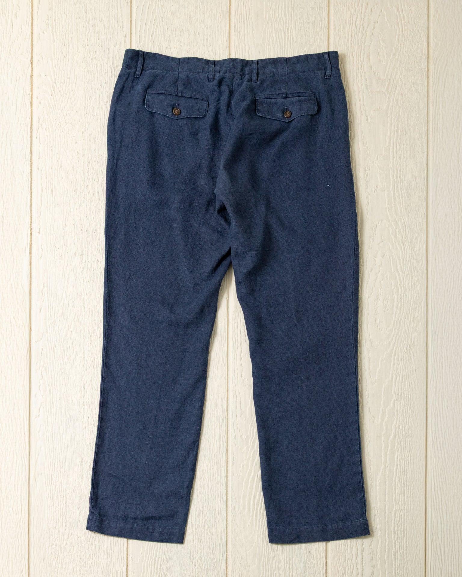 Our Camden pant is a relaxed, yet refined take on the chino, with a Hollywood waistband and a slim but not skinny fit. It is cut from with mid-weight linen that has been garment dyed for a broken-in look and feel. Complete with side slash pockets, and a small front coin pocket.