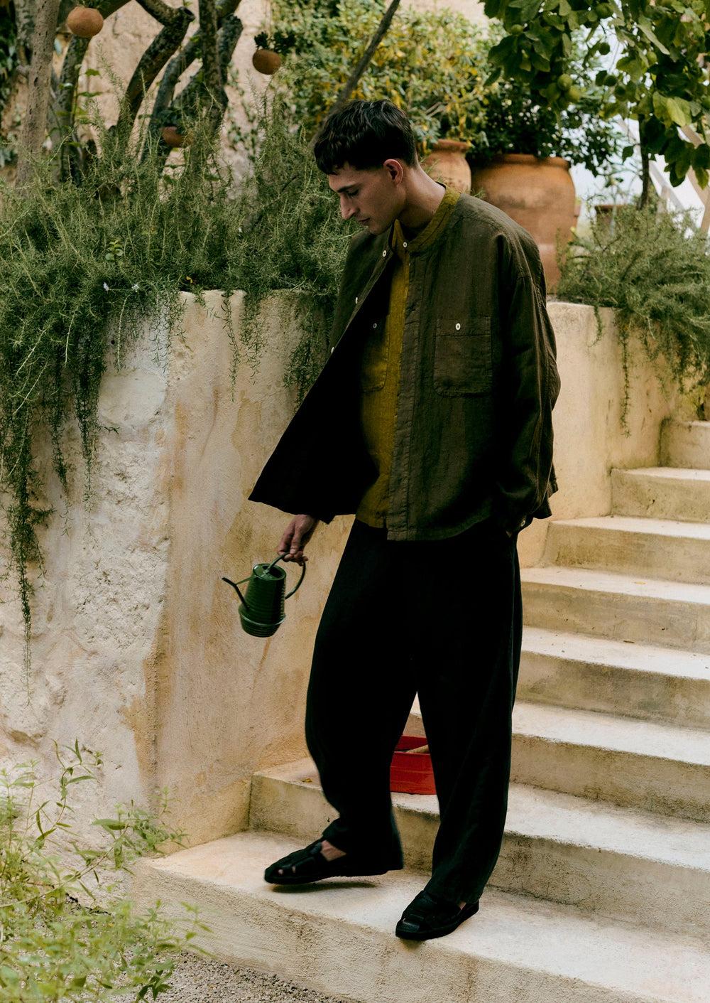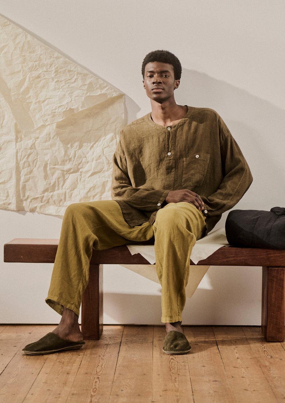 Our collarless shirt is made from garment-dyed linen, cut to a boxy fit accented by side hem slits and knife pleats below the back yoke. With a double placket and partially concealed buttons. Part of our Menswear collection.