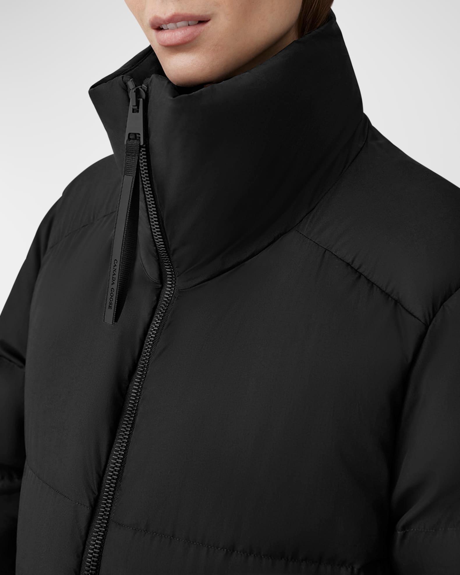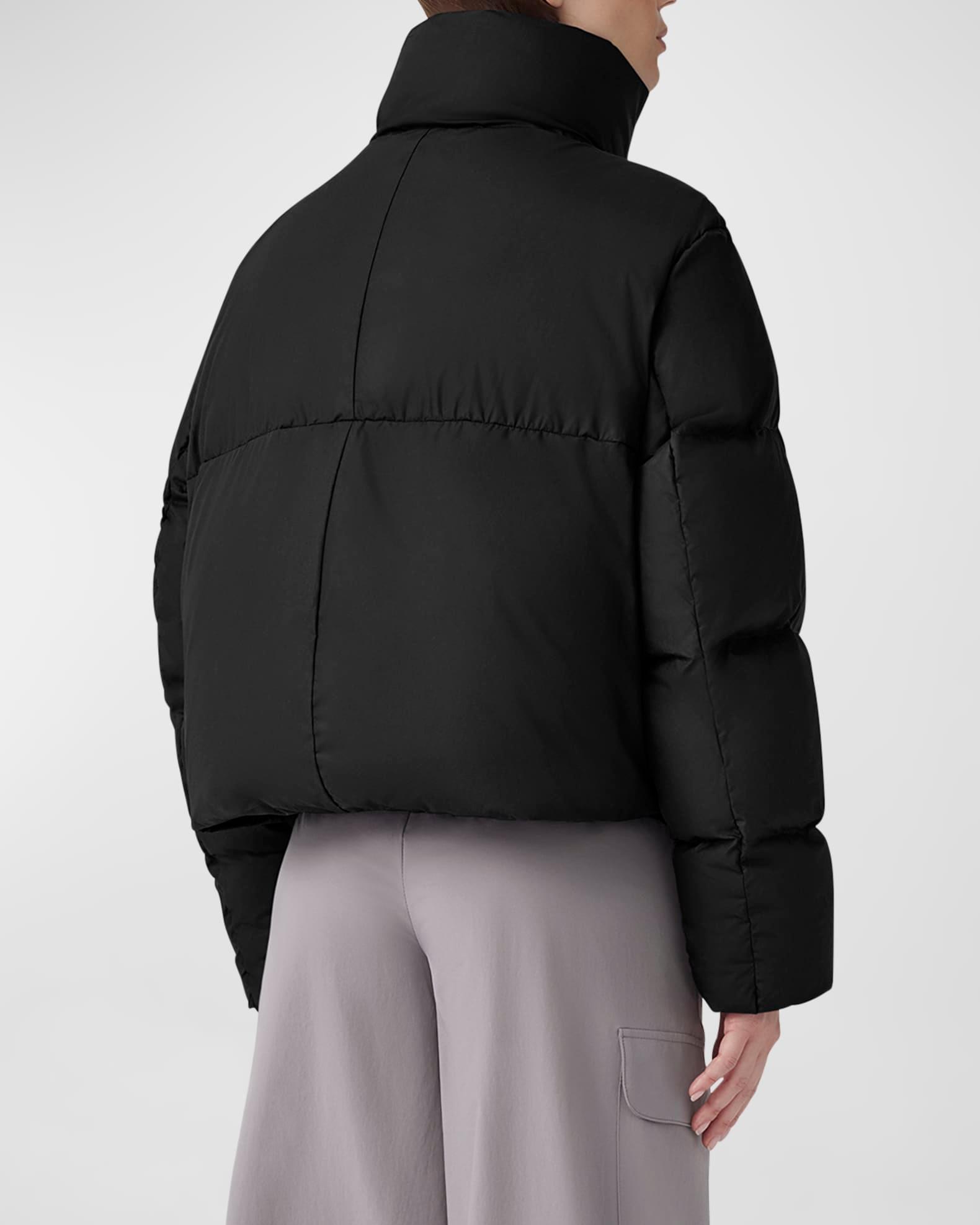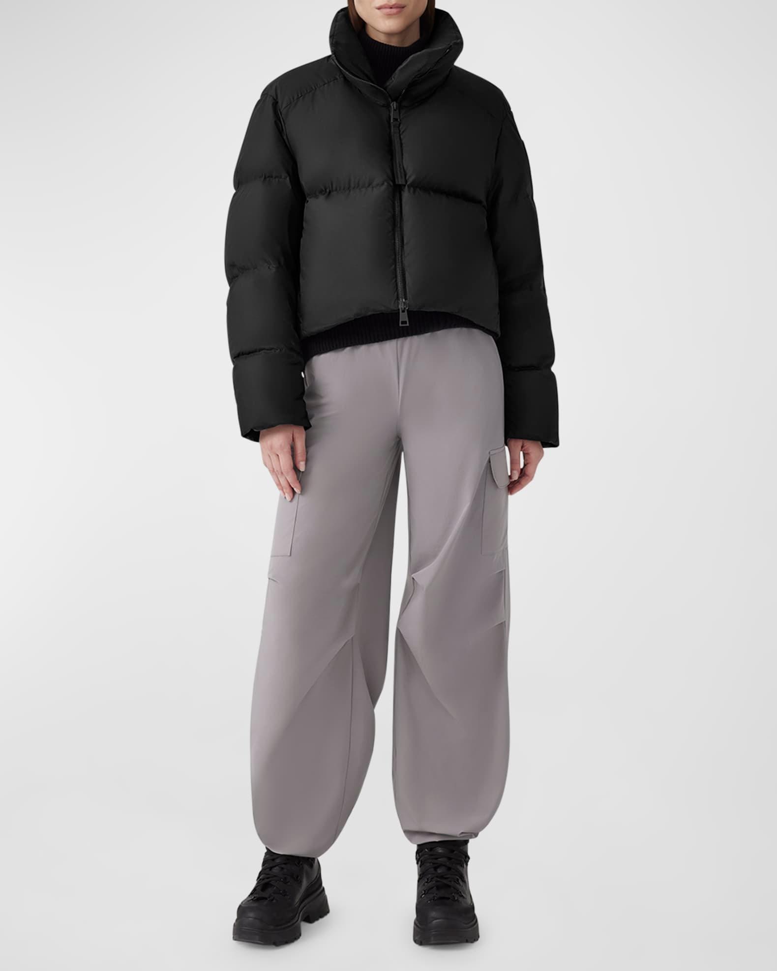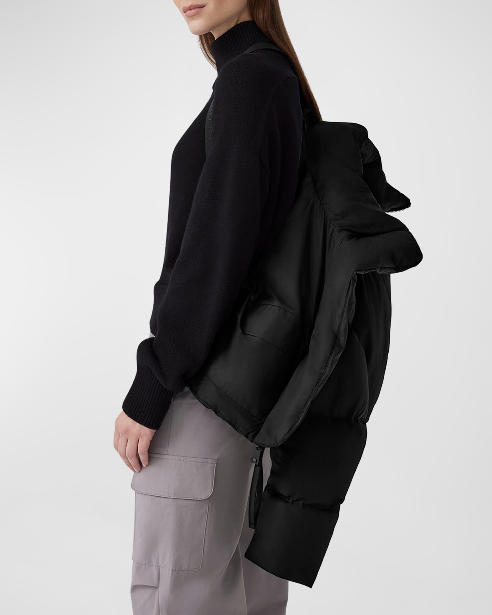 Canada Goose "Garnet" puffer jacket crafted in an ultra-luxe water-repellent fabric with a matte, dry finish Elevated with performance attributes - water-repellent, wind-resistant, durable, and down-proof Stand collar Down-filled storm guard under a two-way zipper closure Long sleeves; recessed rib-knit cuffs for added warmth Logo patch at left sleeve Removable backpack straps Two exterior zippered pockets Two interior drop-in pockets Cropped length Minimal streamlined silhouette Interior hem drawcord for enhanced fit Pima cotton Partially lined Fill: Down/Feather Do not iron, dry clean Made in Canada Model is 5'10"/177cm.