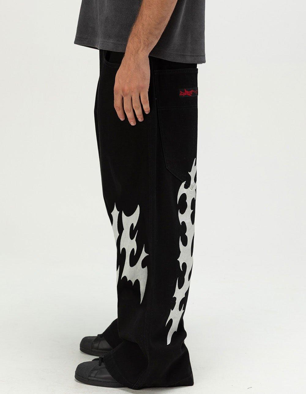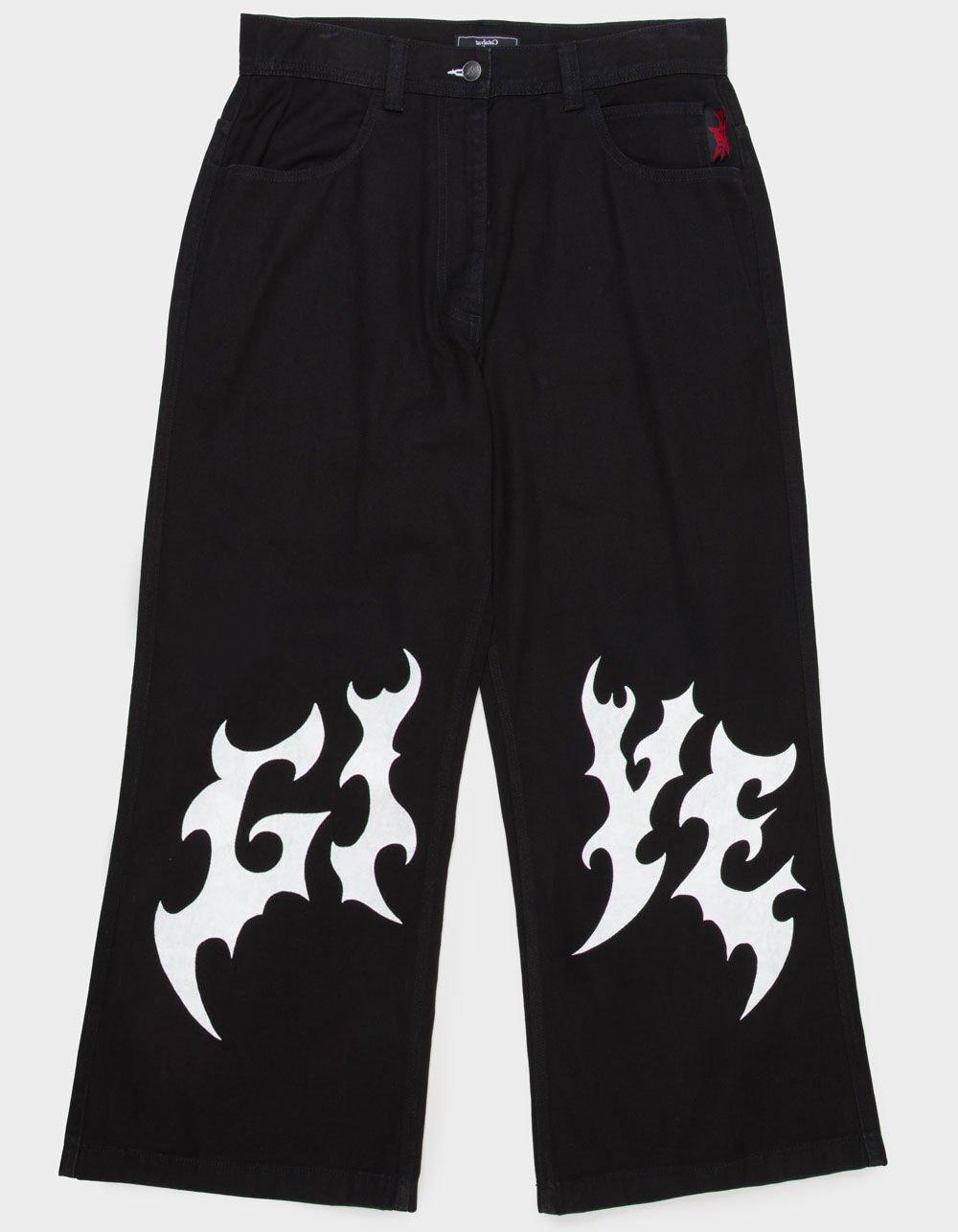 GAT Give 26" Leg Opening Ultra Baggy Jeans. The GAT Give 26" Leg Opening Ultra Baggy Jeans deliver standout style with an ultra-relaxed fit and bold graphic details. Designed with classic 5-pocket styling, these jeans feature woven labels on the coin pocket and back left pocket, along with a button closure, zip fly, and belt loops for everyday functionality. Oversized lettering on the front legs—“GI” on the right and “VE” on the left—spells out “GIVE,” while additional graphics accent the lower back legs for a statement finish. With an approximate 26" leg opening and a 30" inseam in size S, these jeans offer a dramatic, street-inspired silhouette. 100% Cotton. Machine wash. Imported.