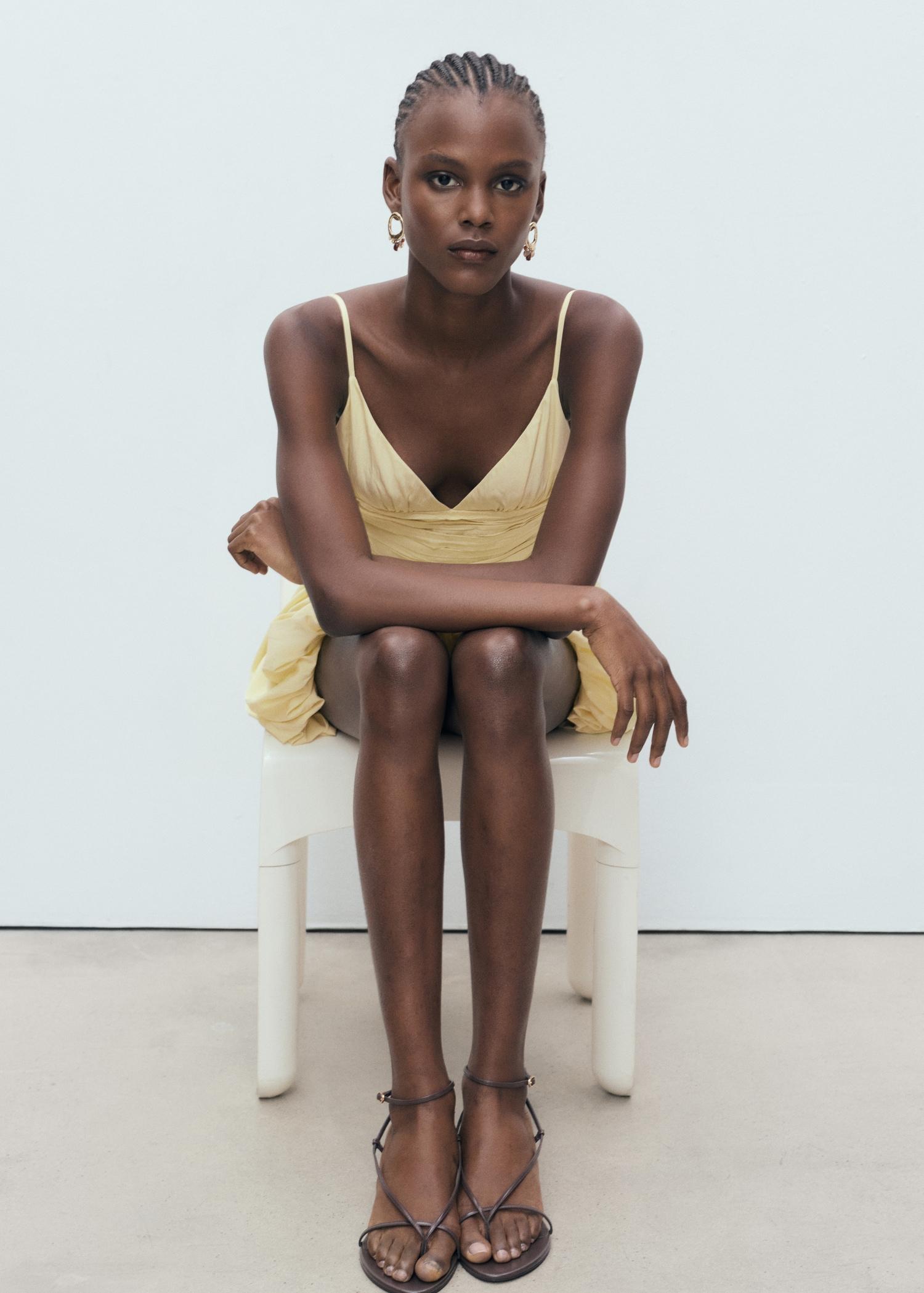 Short design. V-neck. Sleeveless. Thin straps. Gathered panel at the waist. Balloon-finish hem. Back zipper closure. 100% cotton lining. Side length 25.63 in. Back length 25.04 in
