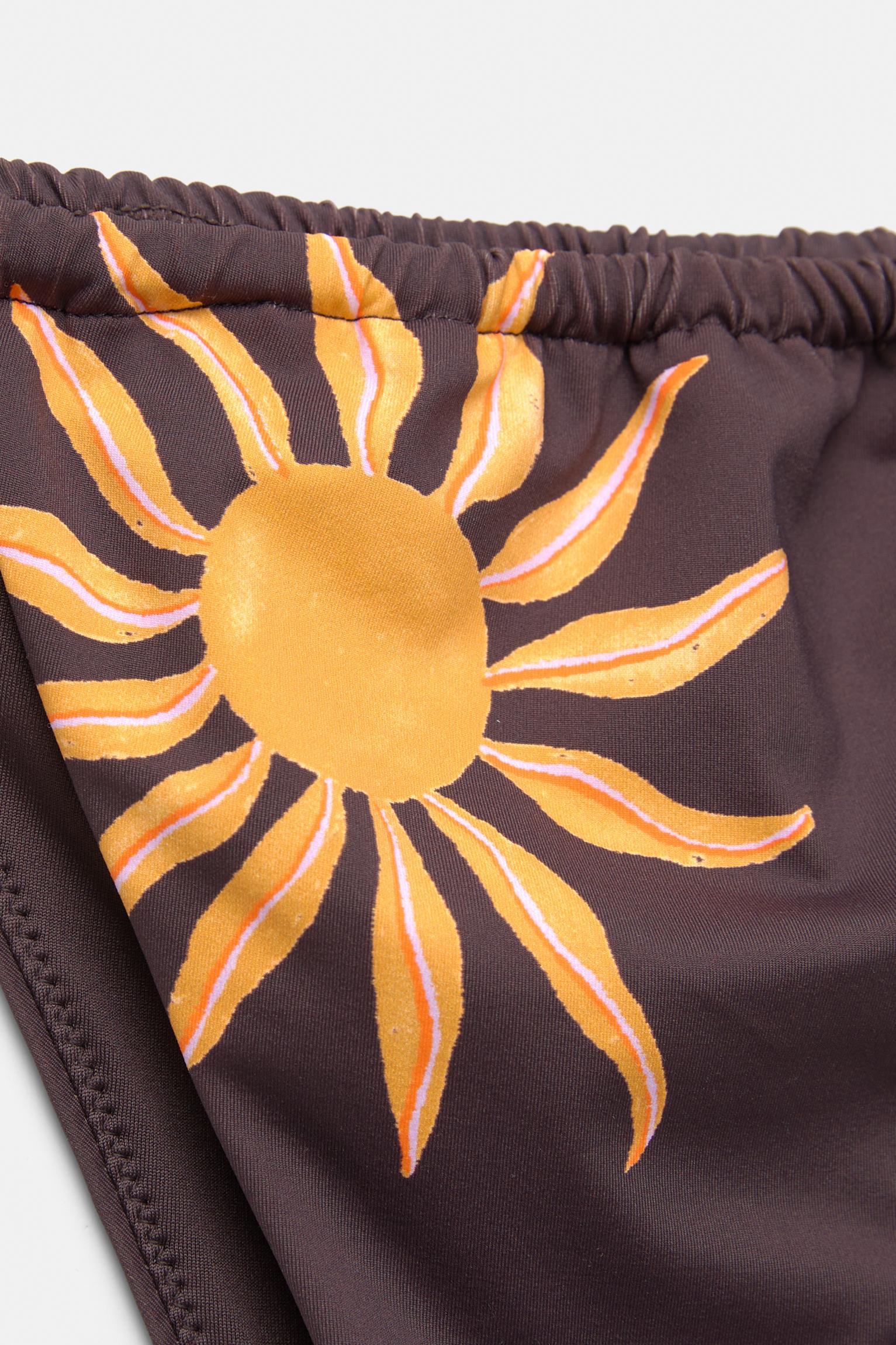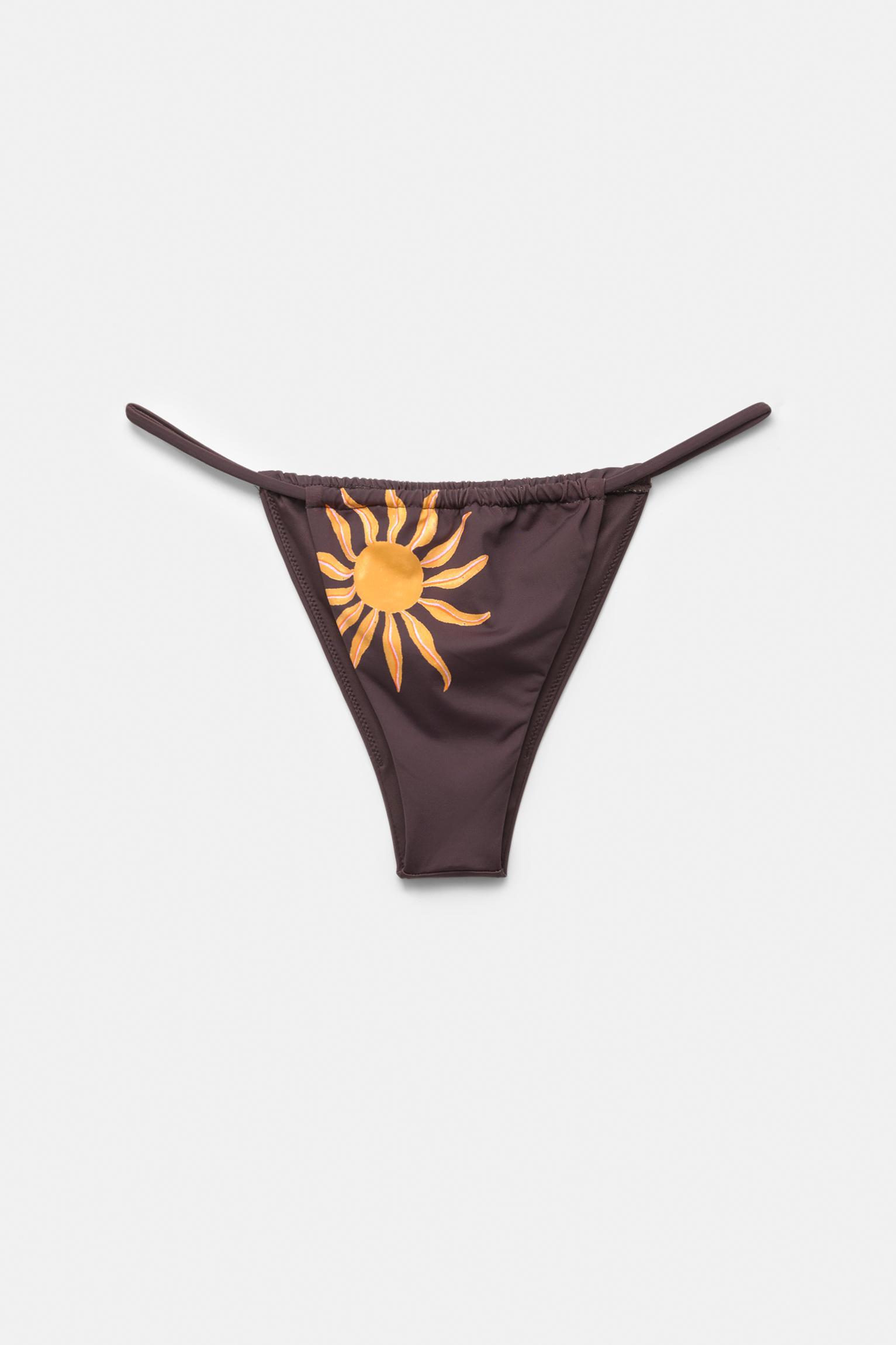 Brazilian bikini bottoms with a sun graphic and straps. Made of stretchy polyamide fabric.