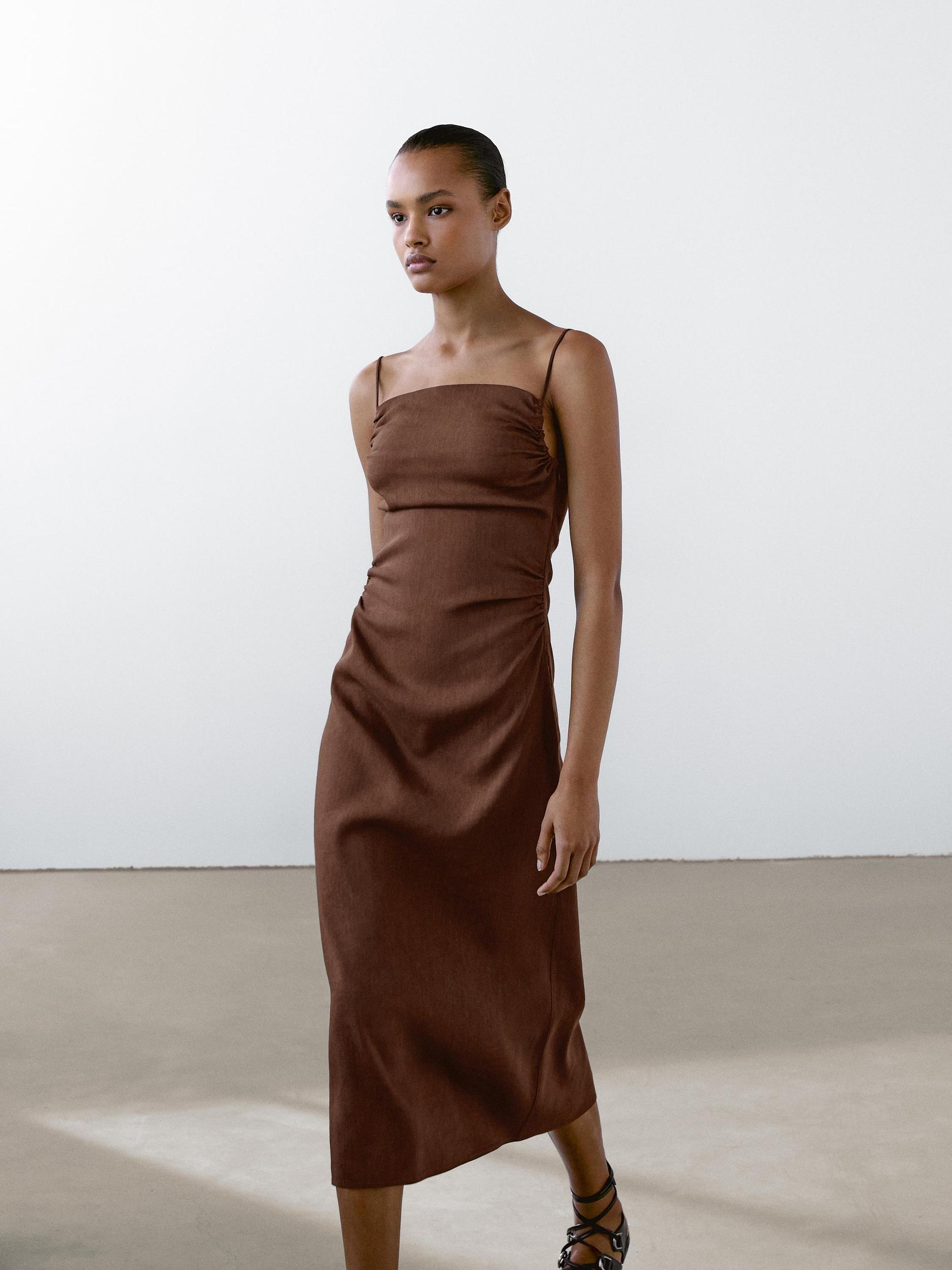 Gathered linen blend midi dress