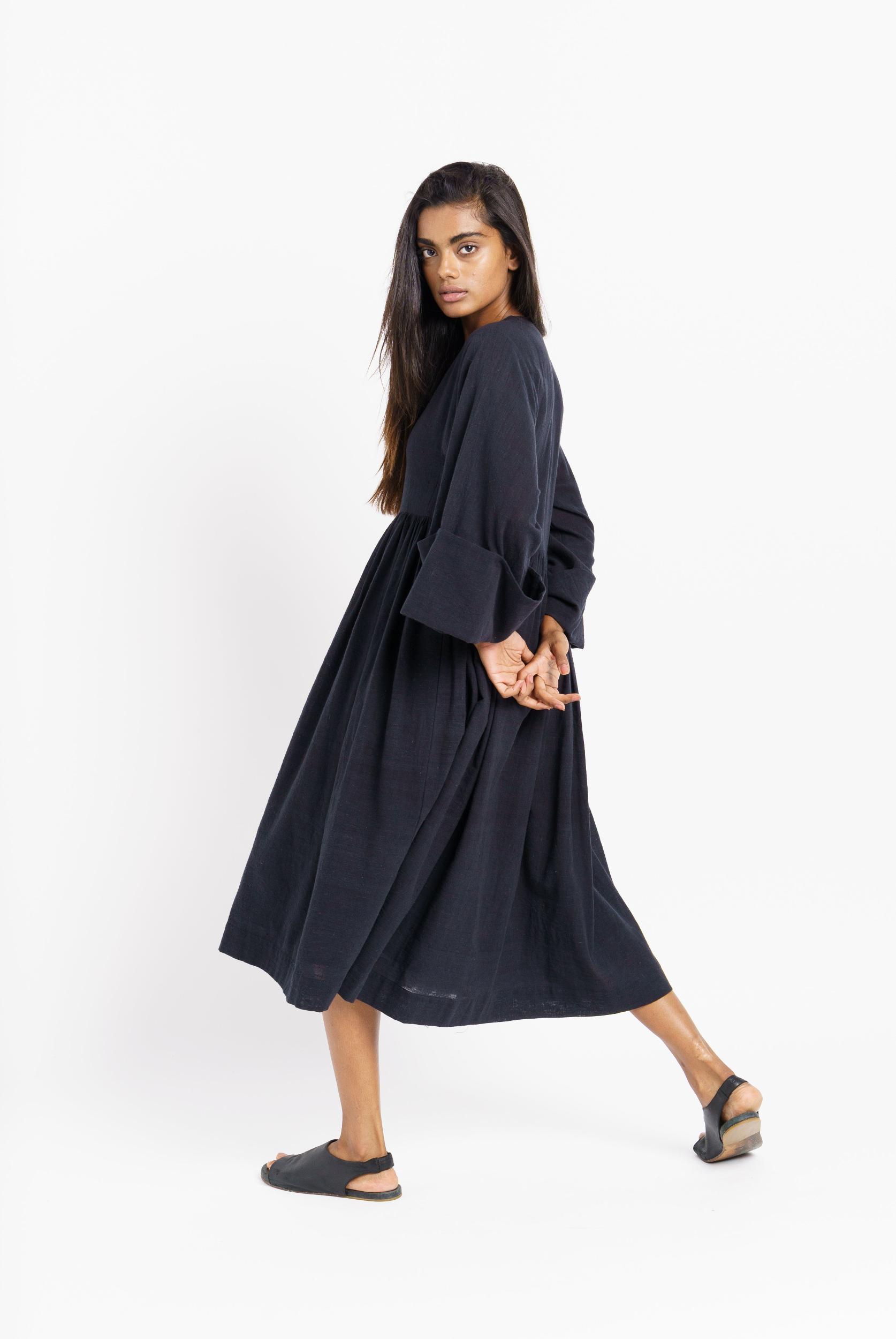 Ash black midi dress tailored from textured organic cotton fabric, handspun in India. A neat round V-neckline and boxy rolled-up sleeves will add edge to your style. Designed for everyday wear, you would love to float into it with ease.