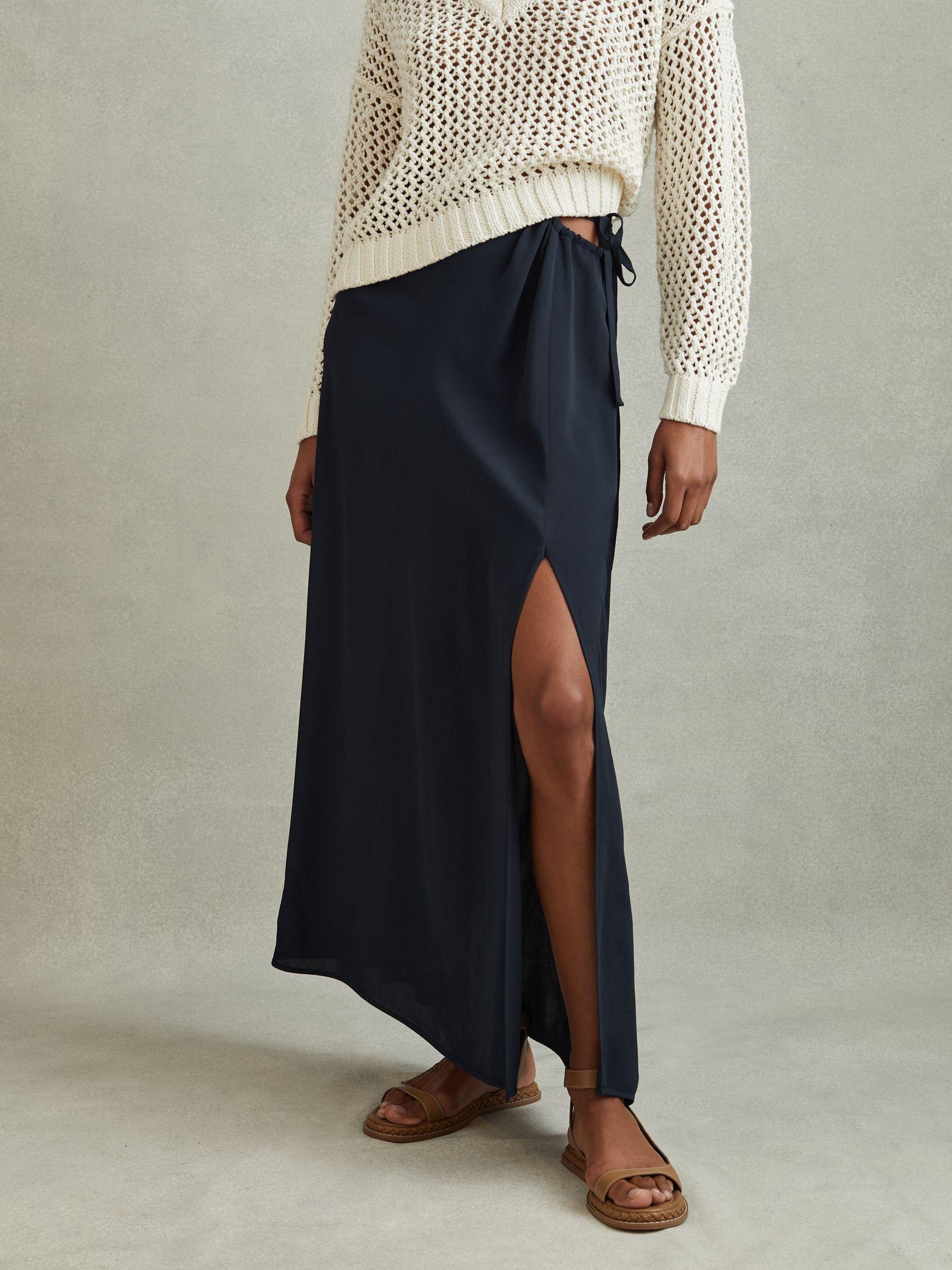 The Esme skirt is designed with a cut-out to the waist and a tie side fastening, offering a sensual mood to your resort repertoire. Tie side. Cut-out to side. Side split. Midi length. The model is wearing a size 8. Measurements of model: Height 5 10" / 177.8cm.
